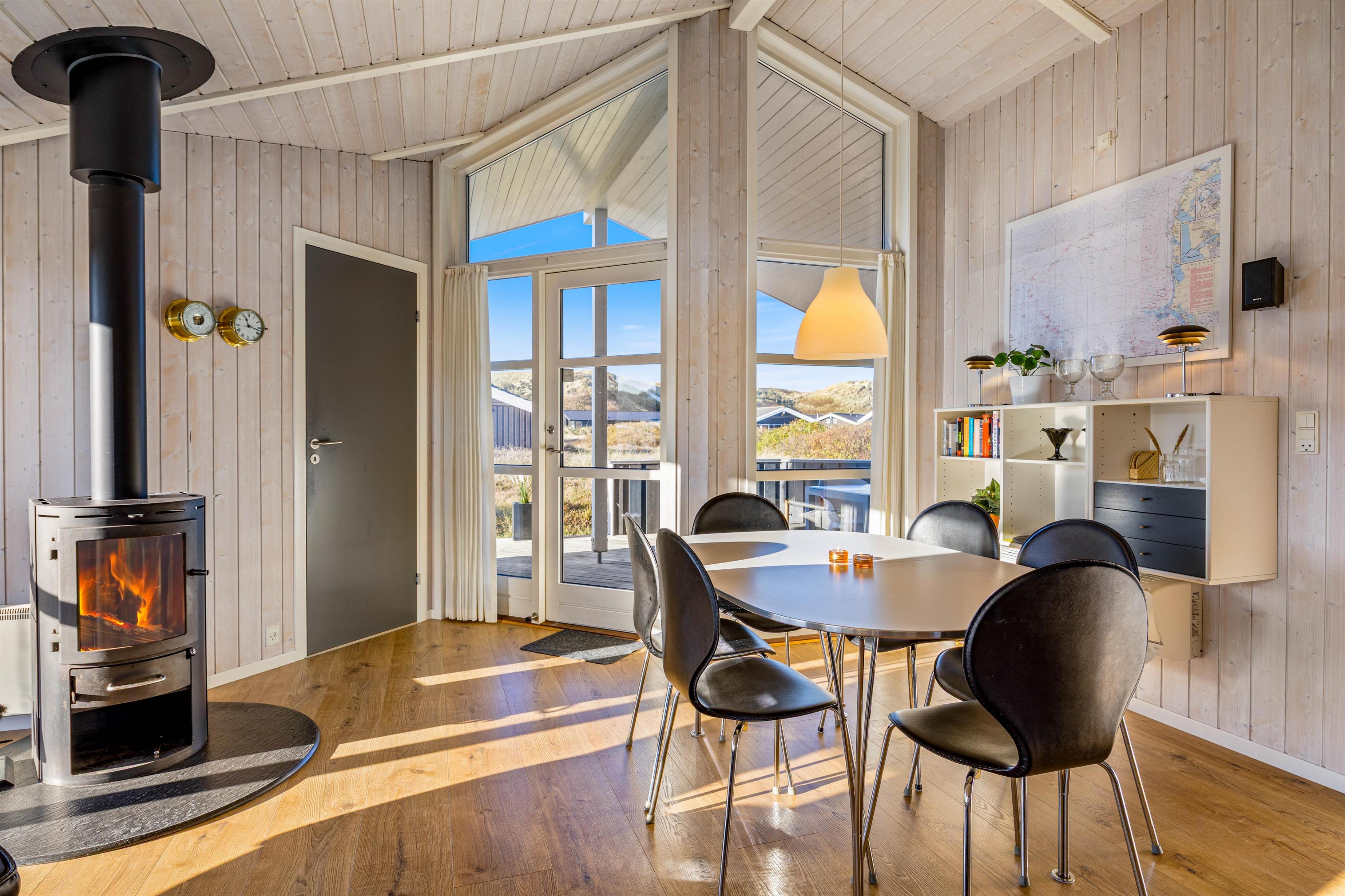 I sommerhuset er der lagt op til mange hyggelige feriestunder for hele familien, og det store opholdsrum er det perfekte sted at samles. Sæt jer til rette i sofaen eller lænestolen og se en god film sammen i tv’et, eller saml jer omkring spisebordet til lækre måltider og sjove brætspil. Tænd op i brændeovnen, og skru op for hyggen og varmen.