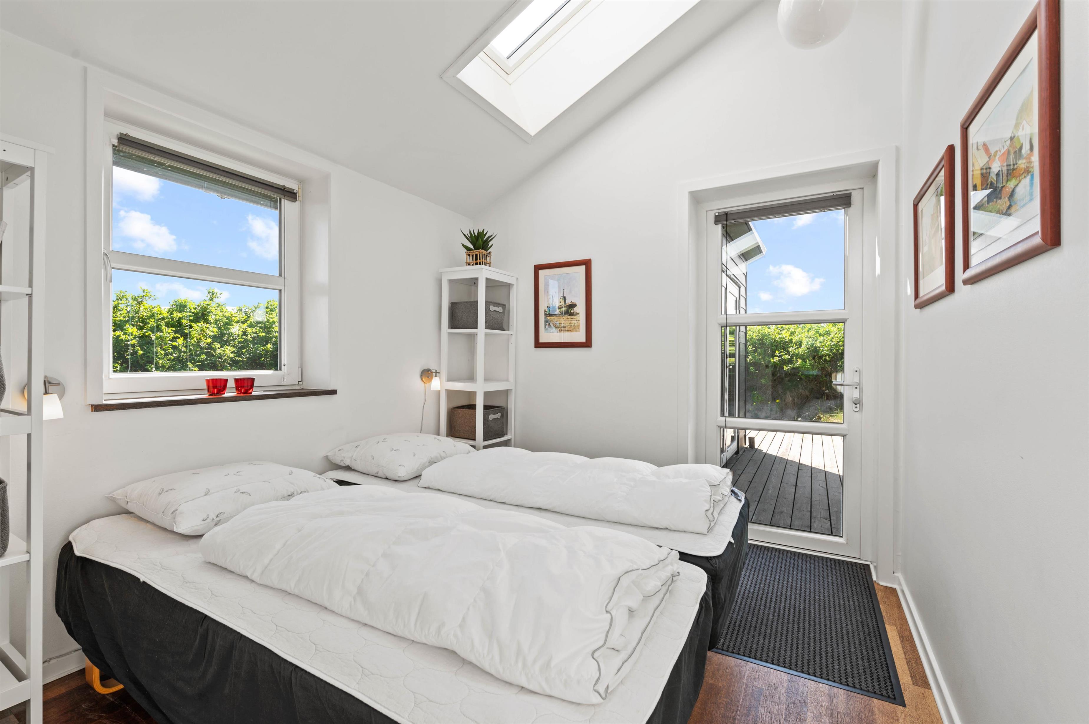 Fra sommerhusets hjerte kan I gå ind i de 2 soveværelser, der begge er indrettet med komfortable dobbeltsenge. Fra hvert værelse har I direkte udgang til den dejlige træterrasse. På badeværelset er der både gulvvarme samt vaskemaskine.