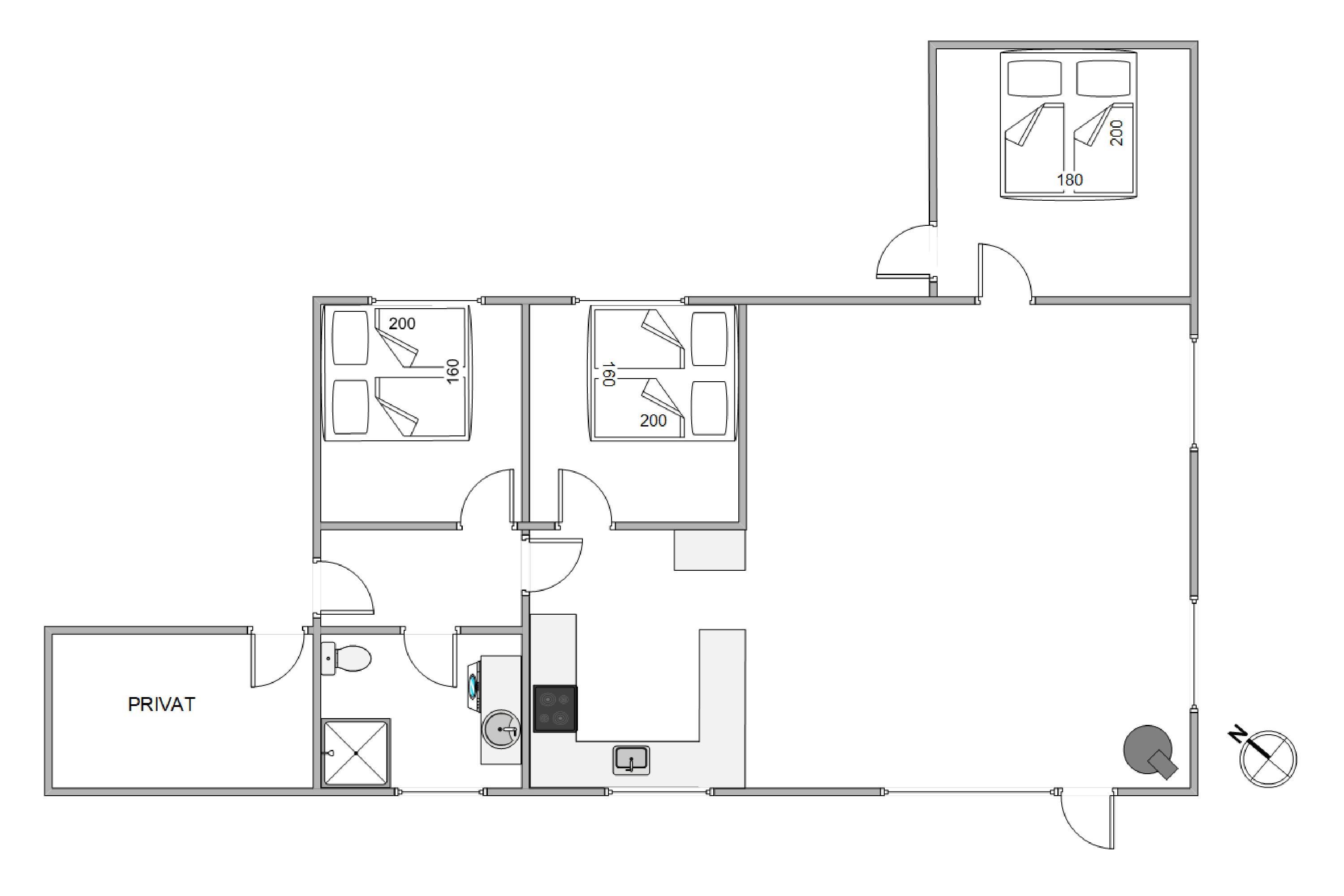 Sommerhuset byder på en lys og indbydende indretning med 3 hyggelige soveværelser, der giver mulighed for at finde ro efter en dag fyldt med aktiviteter. Badeværelset er udstyret med gulvvarme, som giver ekstra komfort på de køligere morgener.