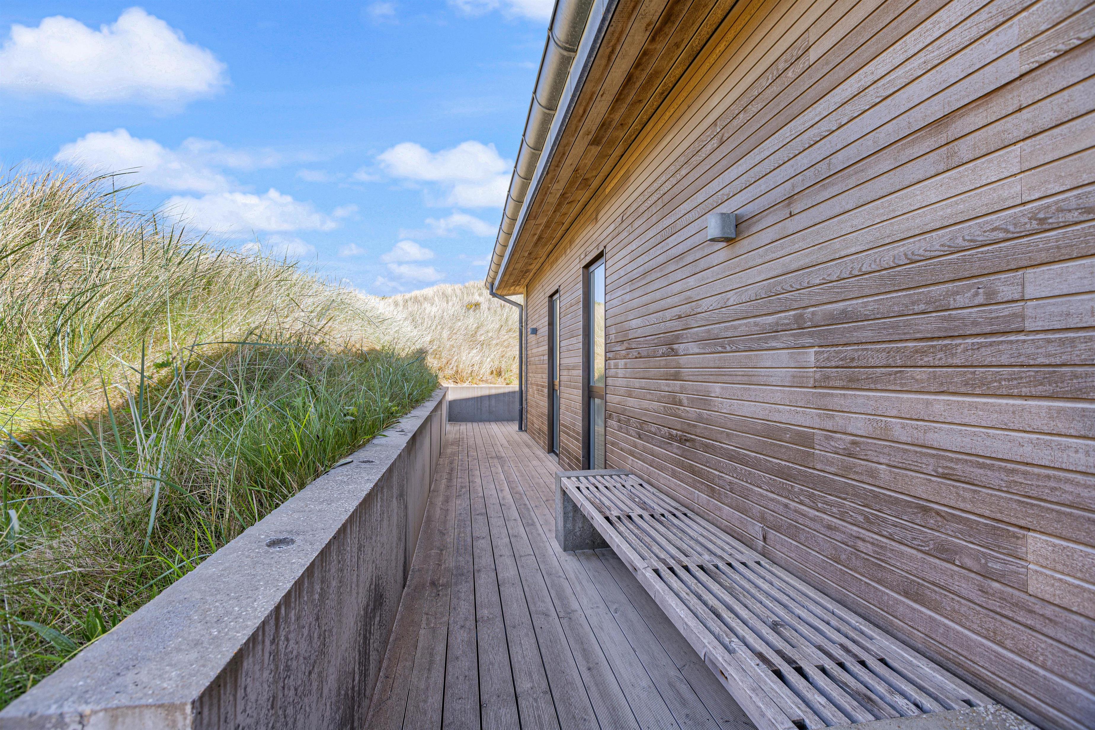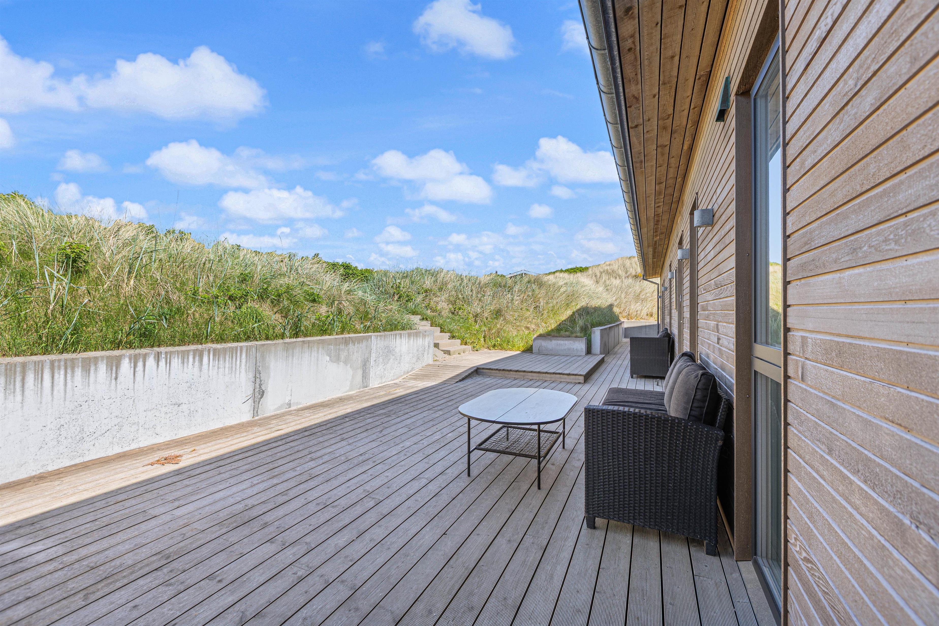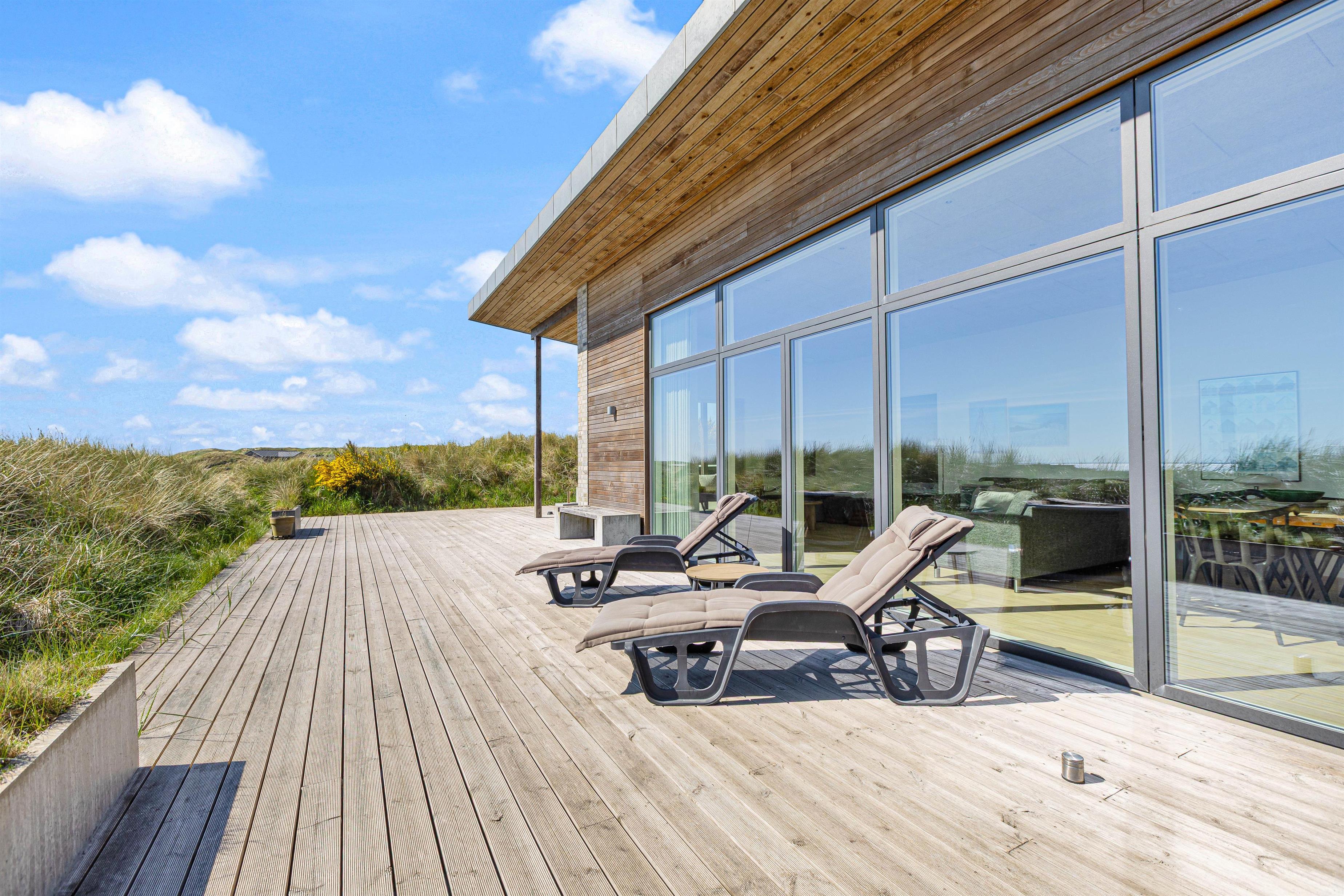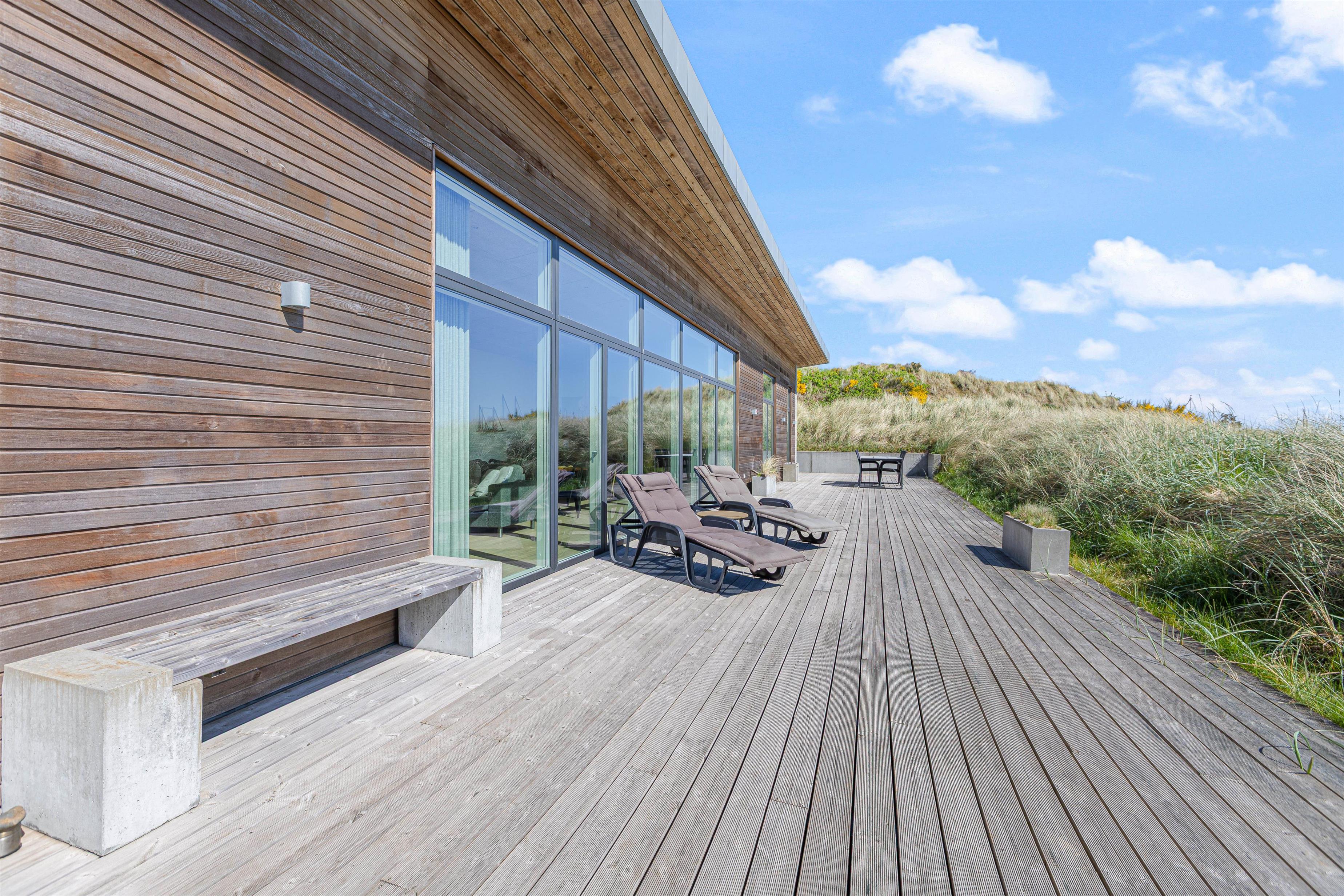 Der er skønne og store træterrasser hele vejen rundt om huset – og rig mulighed for at nyde den storslåede udsigt, samt finde læ og nyde solen. Man kan nyde morgenkaffen og solopgangen over fjorden mod øst – og eftermiddagen i solen mod syd.