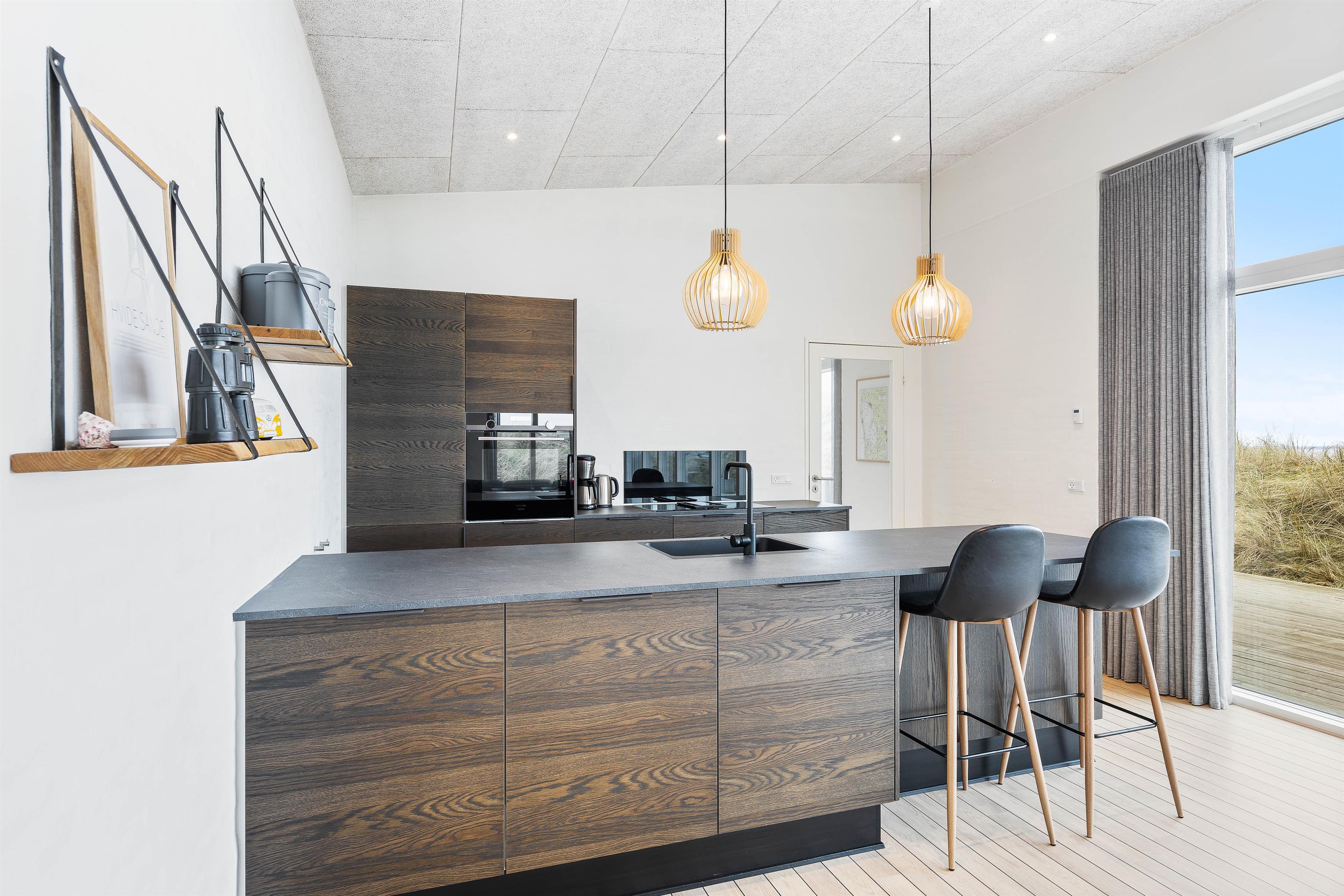 Flot, spændende og luksuriøst feriehus, opført 2019 i sten og træ, beliggende midt i en klit på Karen Brands Vej 60 i Årgab – og med en fantastisk panoramaudsigt udover over en del af sommerhusområdet og Ringkøbing Fjord.