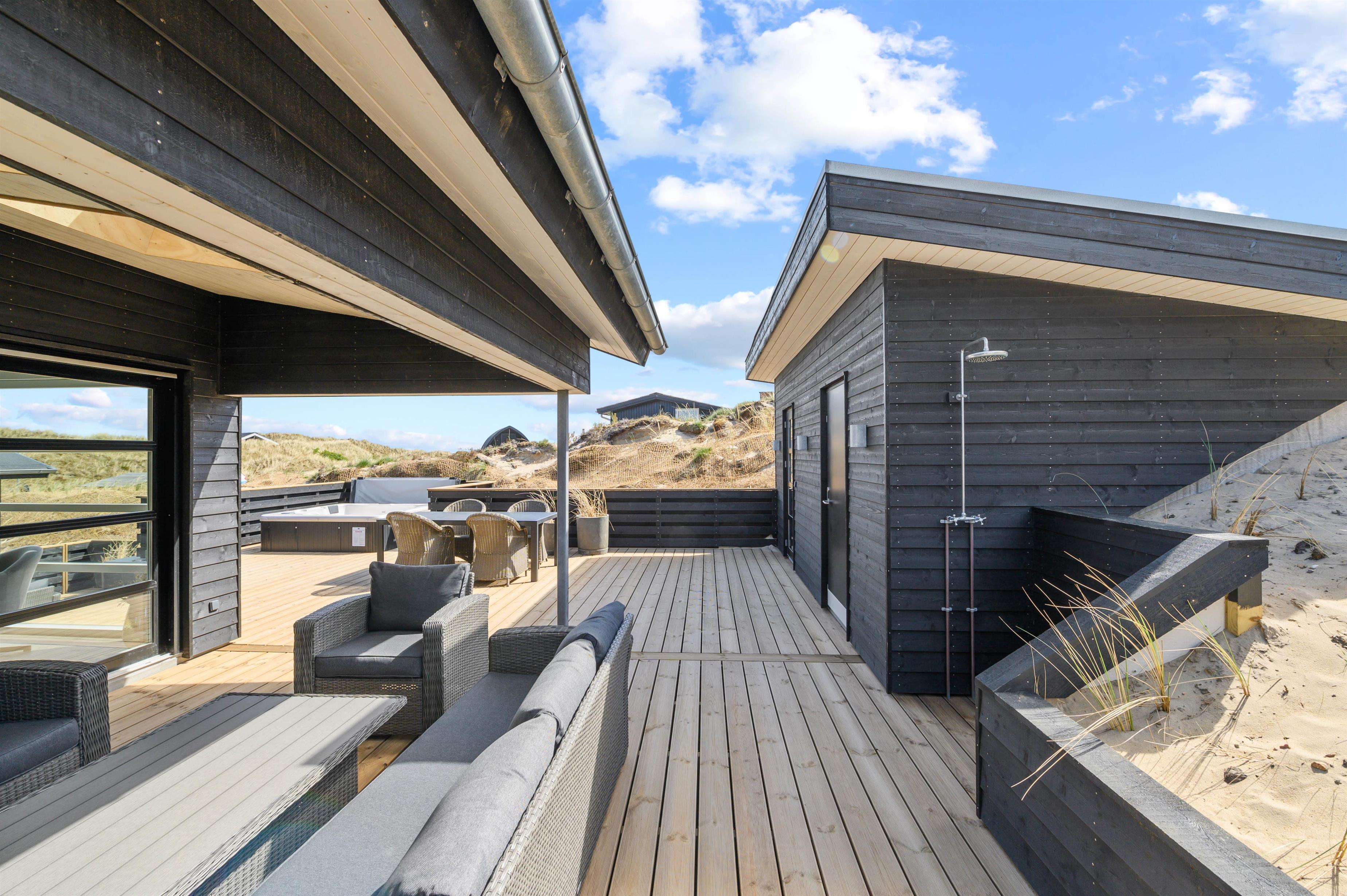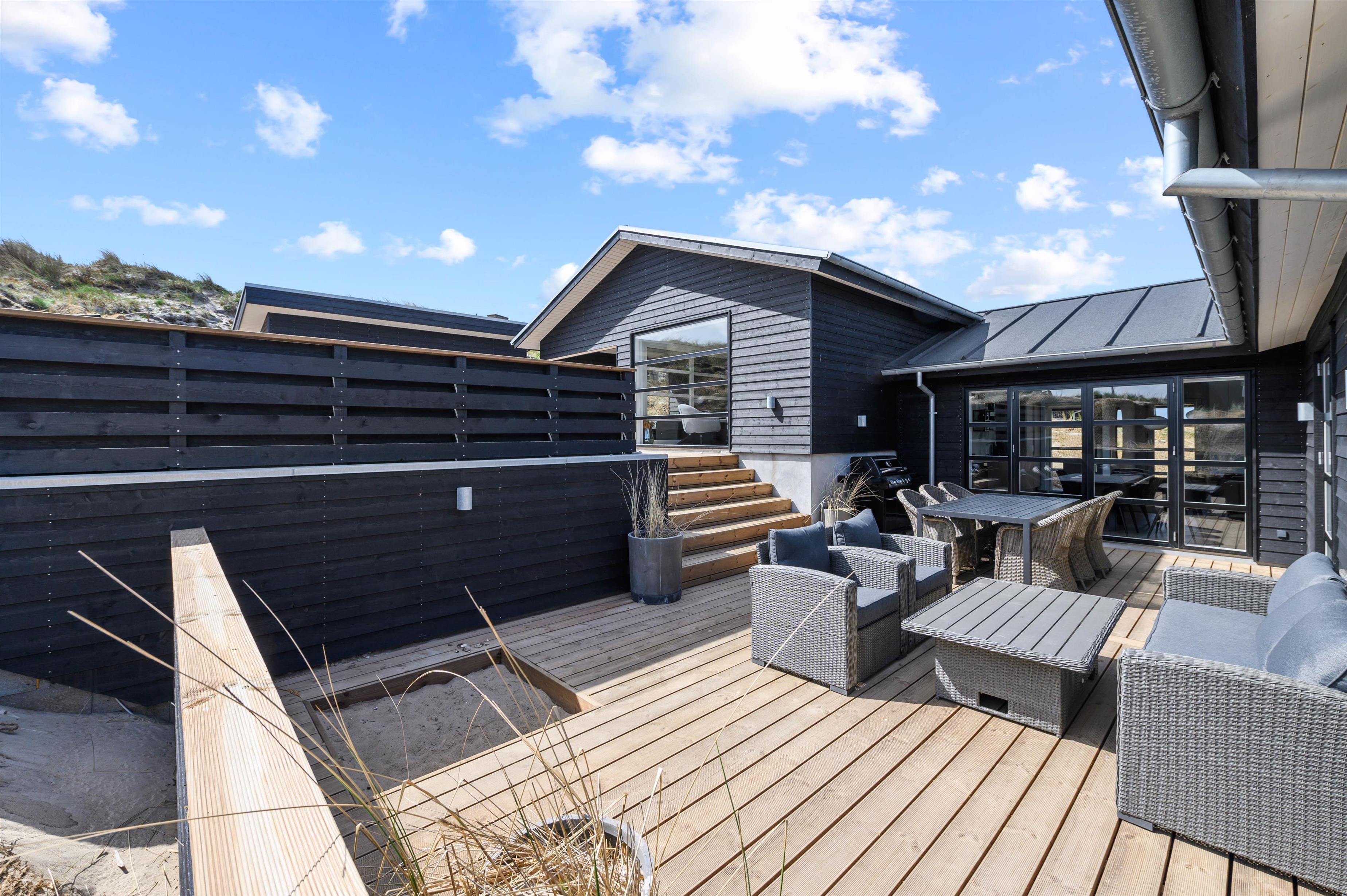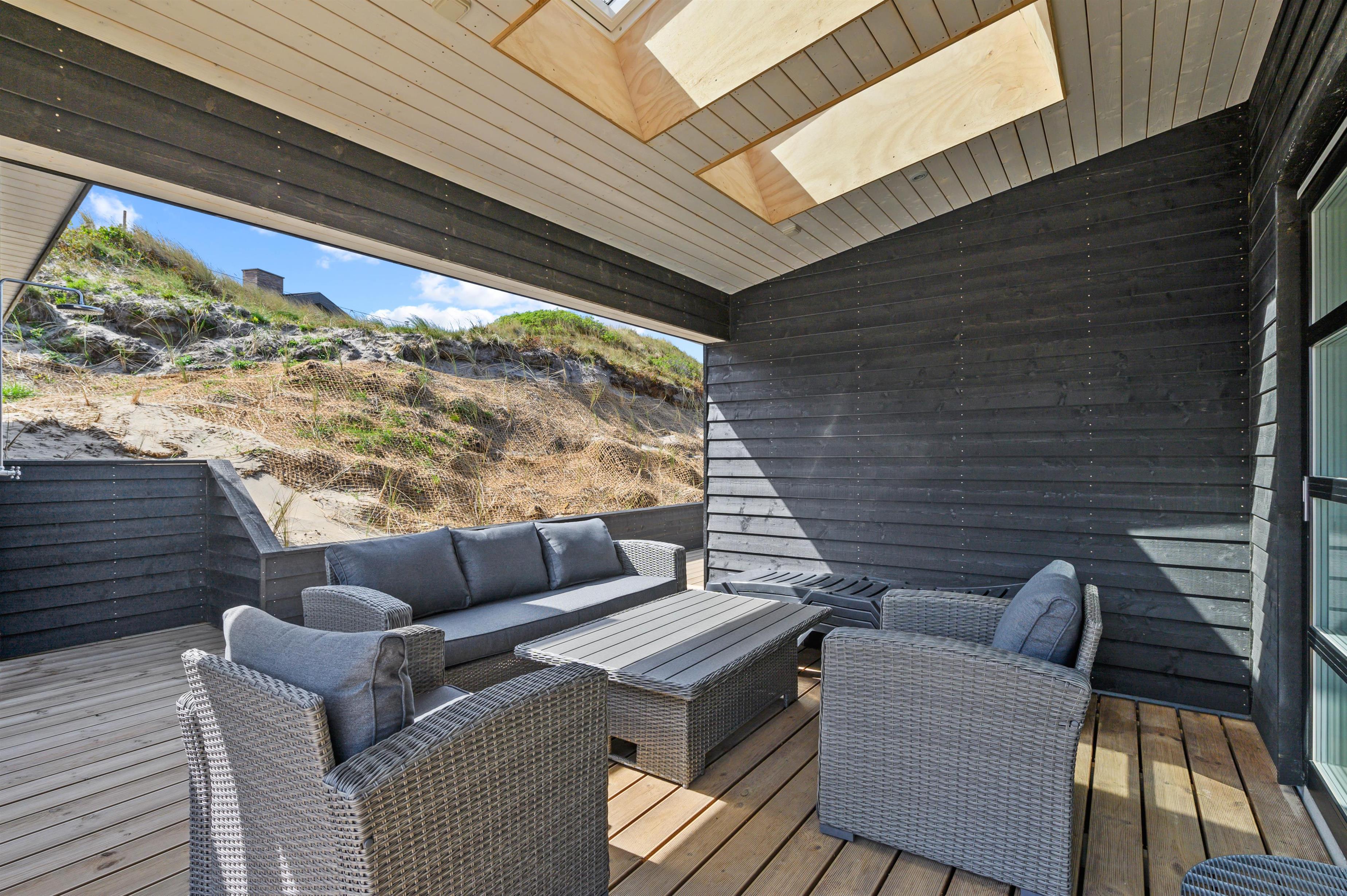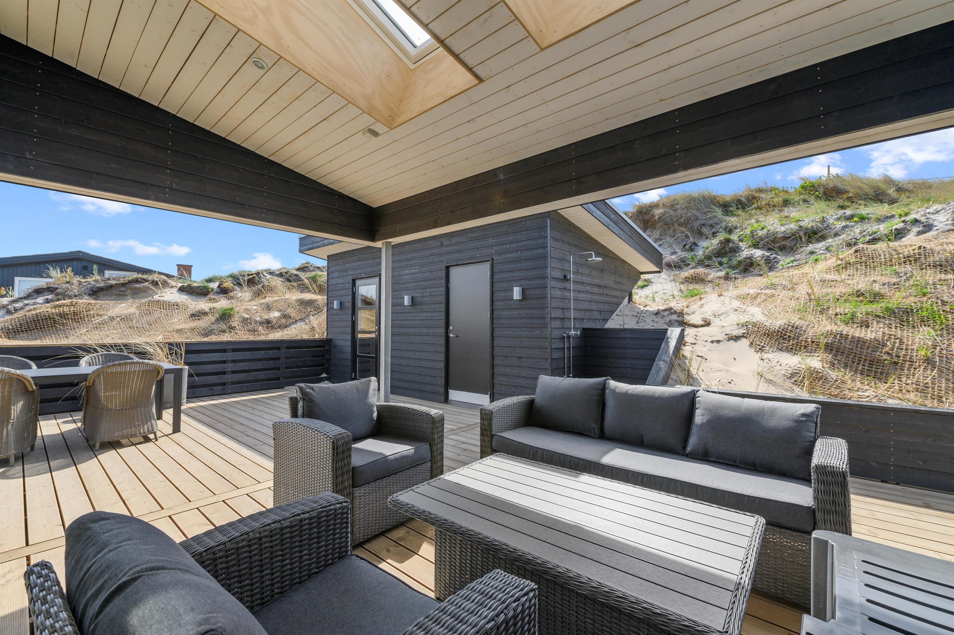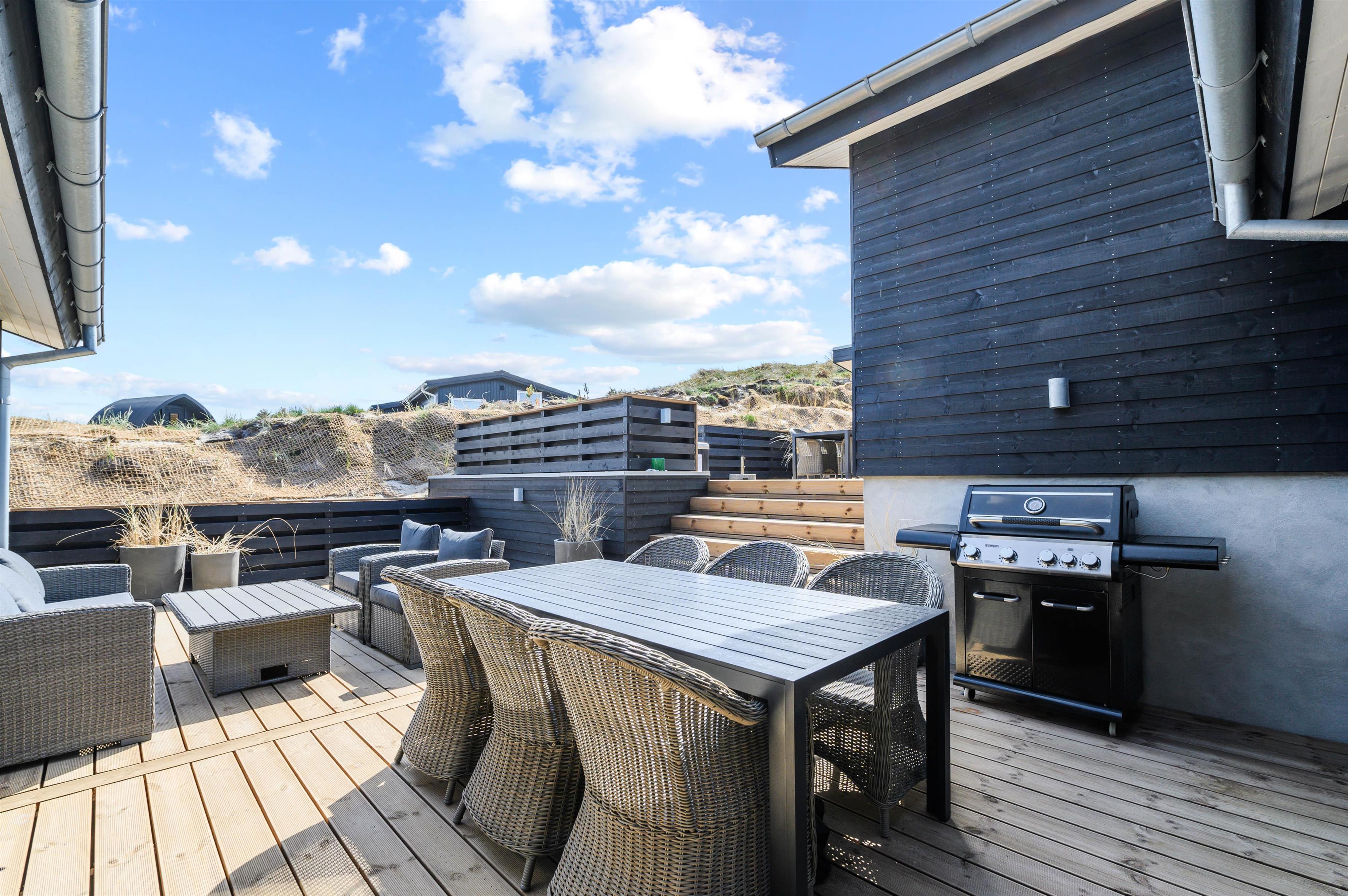 Med til luksushuset hører en fantastisk terrasse, der er lukket hele vejen rundt samt delvist overdækket og afskærmet. Her finder I alle nemt en plads i solen i de gode havemøbler, og om aftenen står grillen klar, så feriekokkene kan slippe deres fantasi løs.
