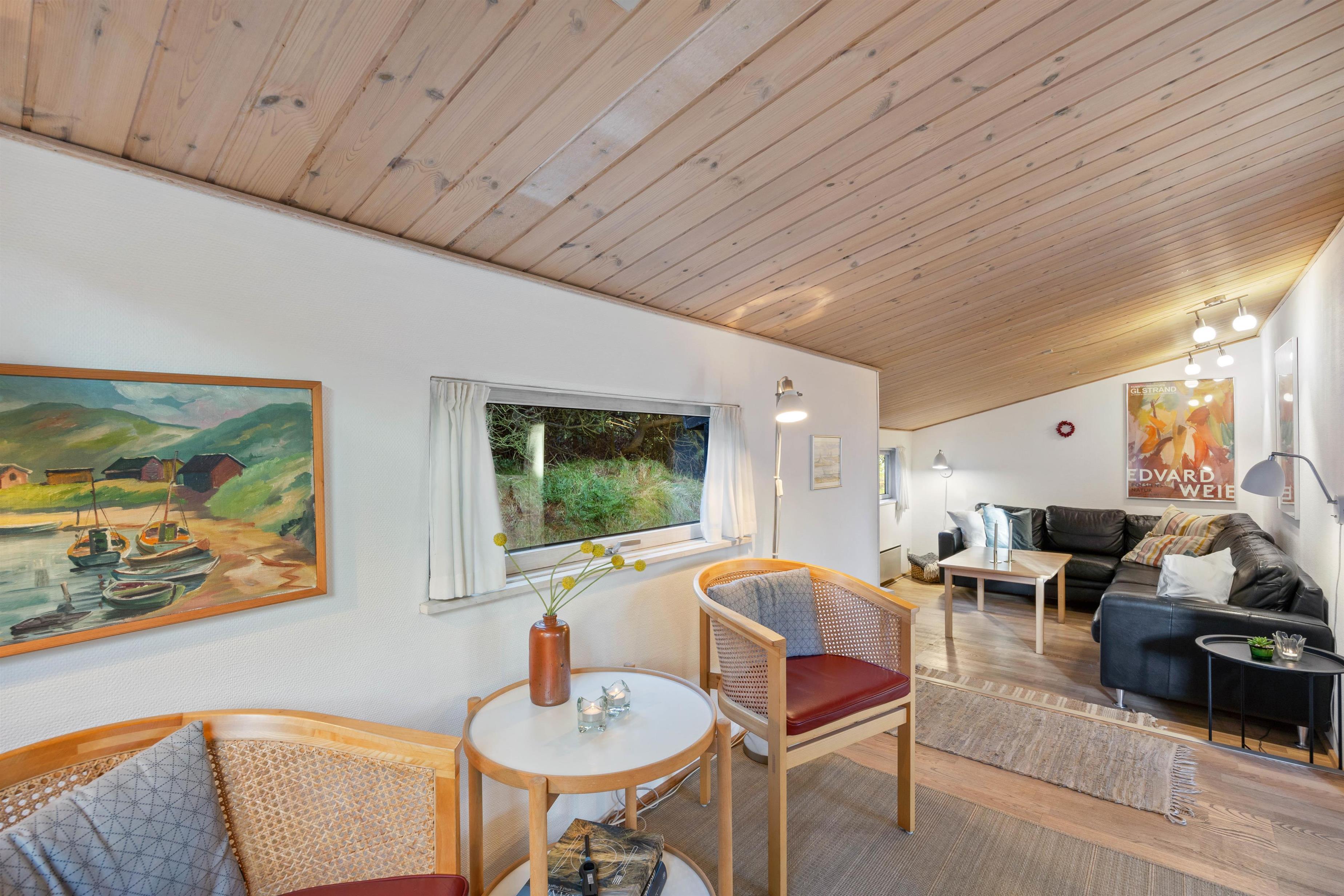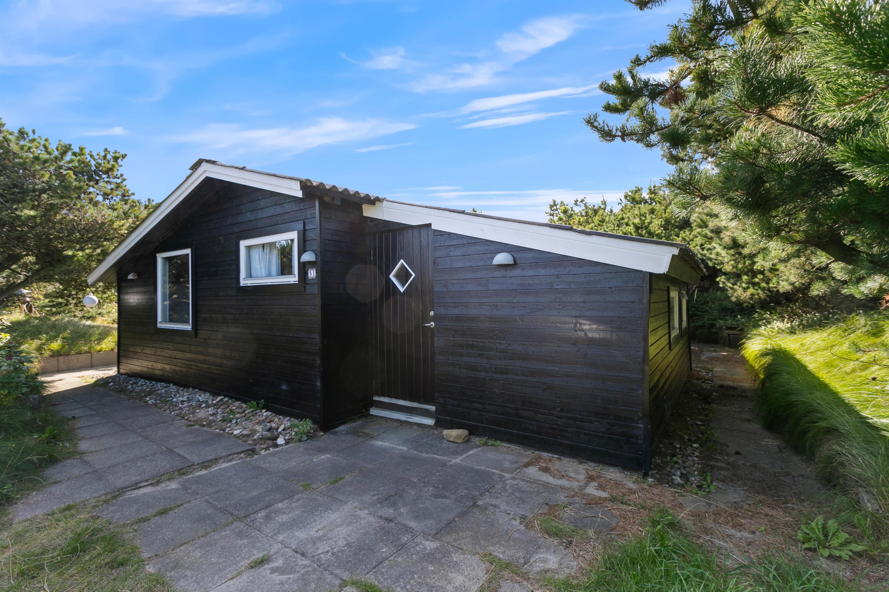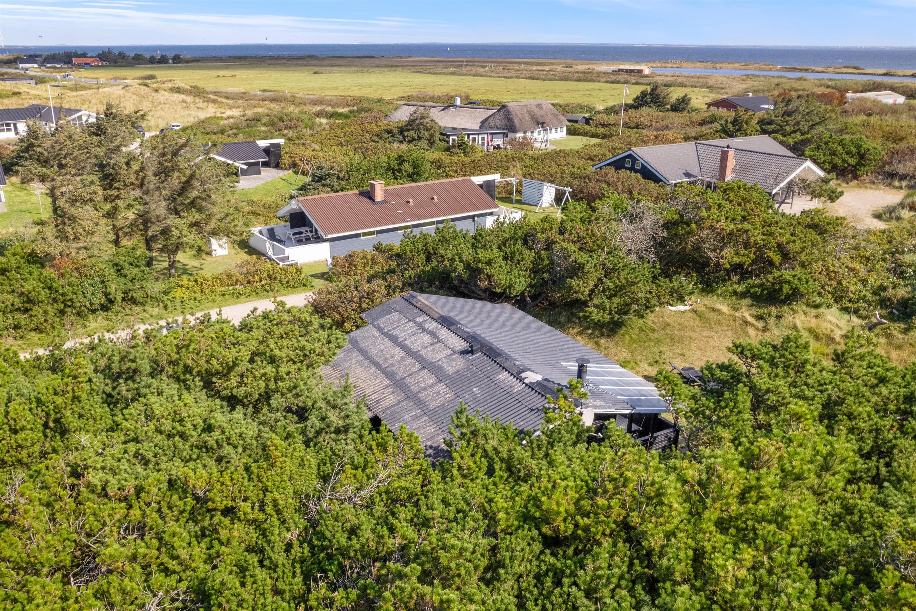 Bag træer og buske ligger dette fine sommerhus godt afskærmet fra naboerne. Her kan op mod fire gæster holde en dejlig ferie i rolige omgivelser nær Vesterhavet. Tænd op i brændeovnen og få slappet af på sofaen eller nyd livet på terrassen, der er lukket og delvist overdækket.