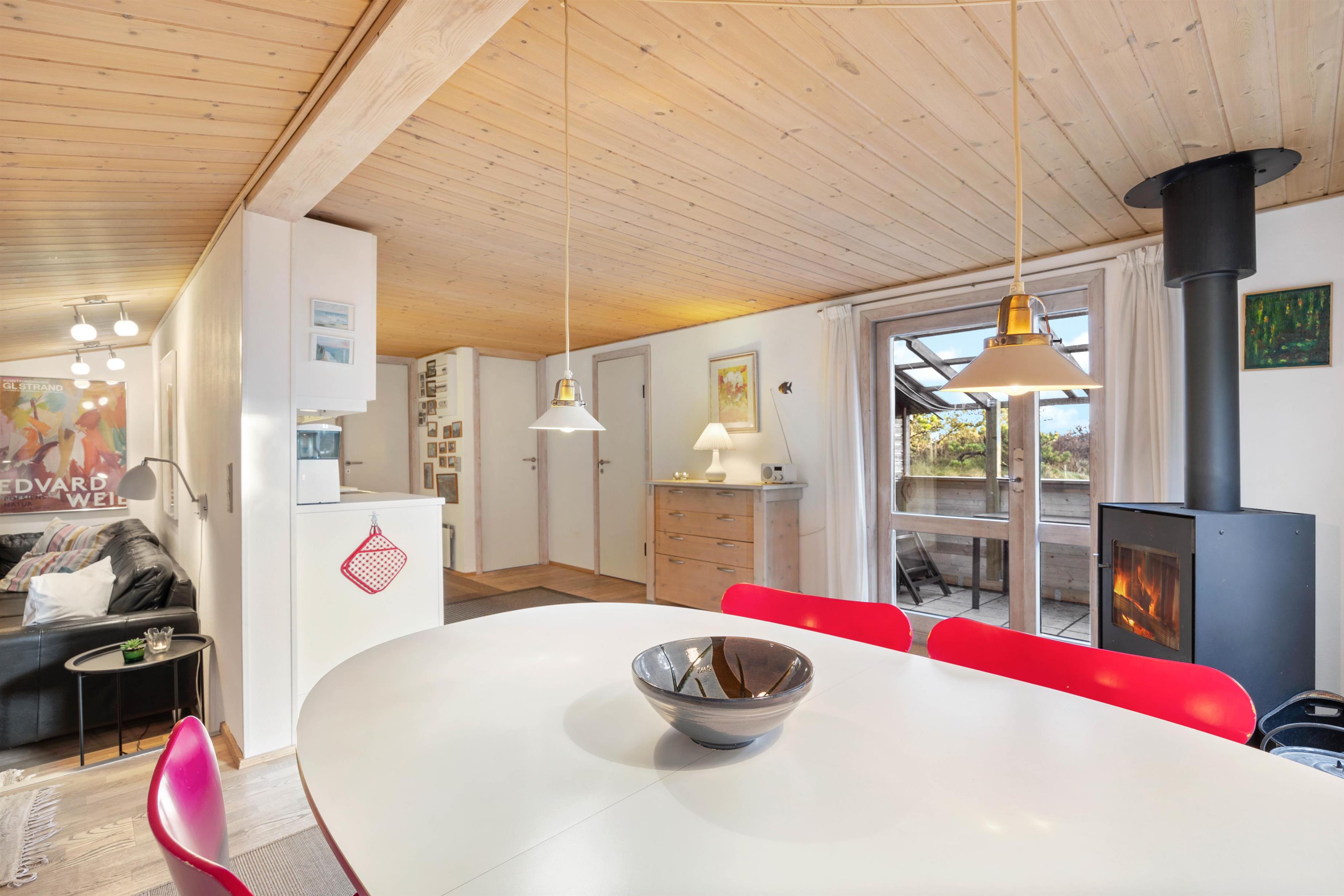 I opholdsrummet er der plads til fælles hygge. I køkkenet finder I mange af hverdagens hjælpere såsom opvaskemaskinen, og sammen kan I her trylle lækre retter frem. Måske den står på burger-aften eller tapas? Efter maden kan I samles om sofabordet til hygge med alt fra ludo, yatzy eller fordybe jer i en god bog. På de køligere aftner kan I med fordel tænde op i brændeovnen, der både skaber varme og glæde i stuen.