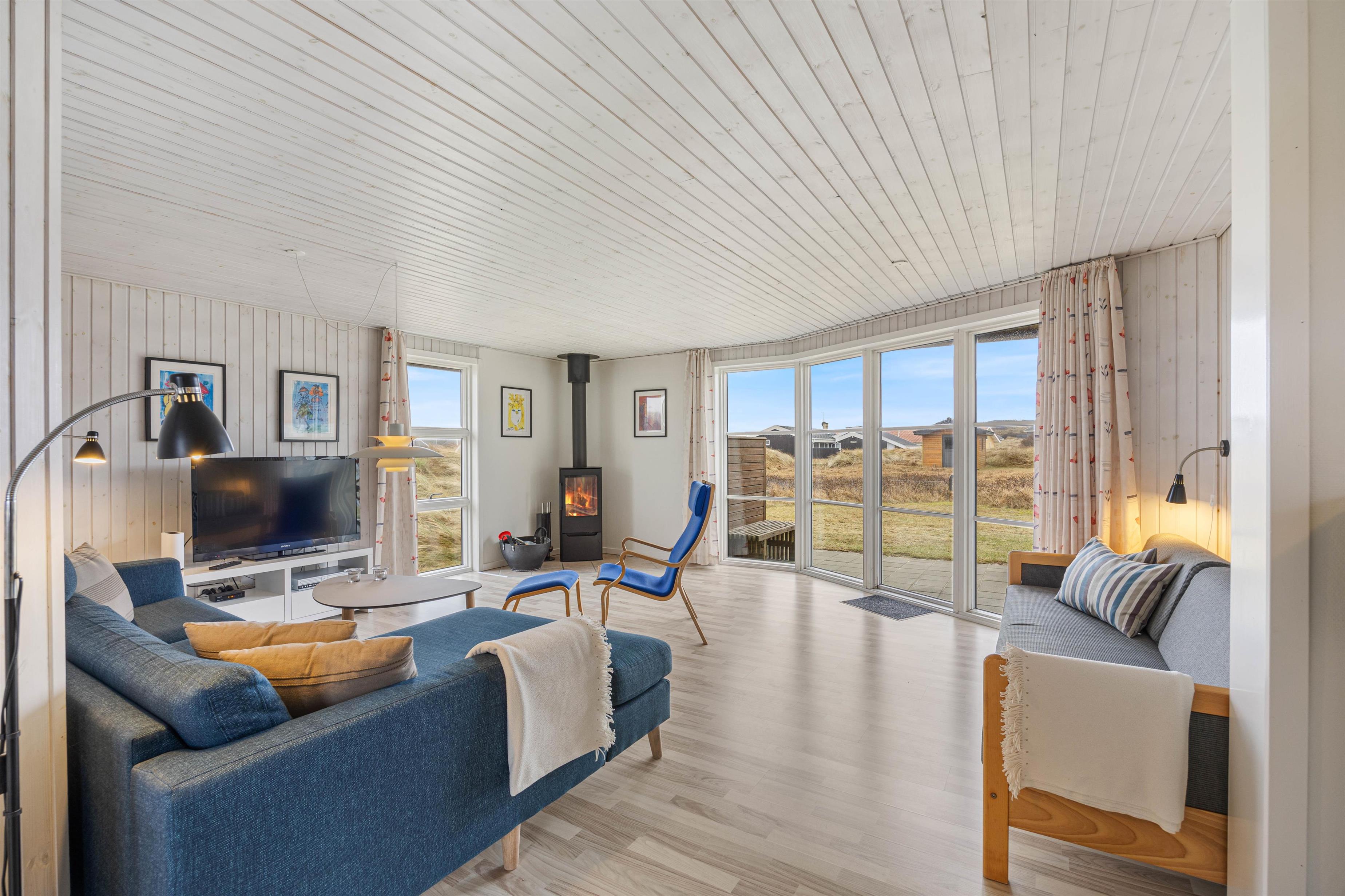 En blæsende efterårsdag kan bruges på familietid i stuen, mens brændeovn knitrer i baggrunden. Sommerhuset har desuden en enrgibesparende varmepumpe, som I med fordel kan benytte.