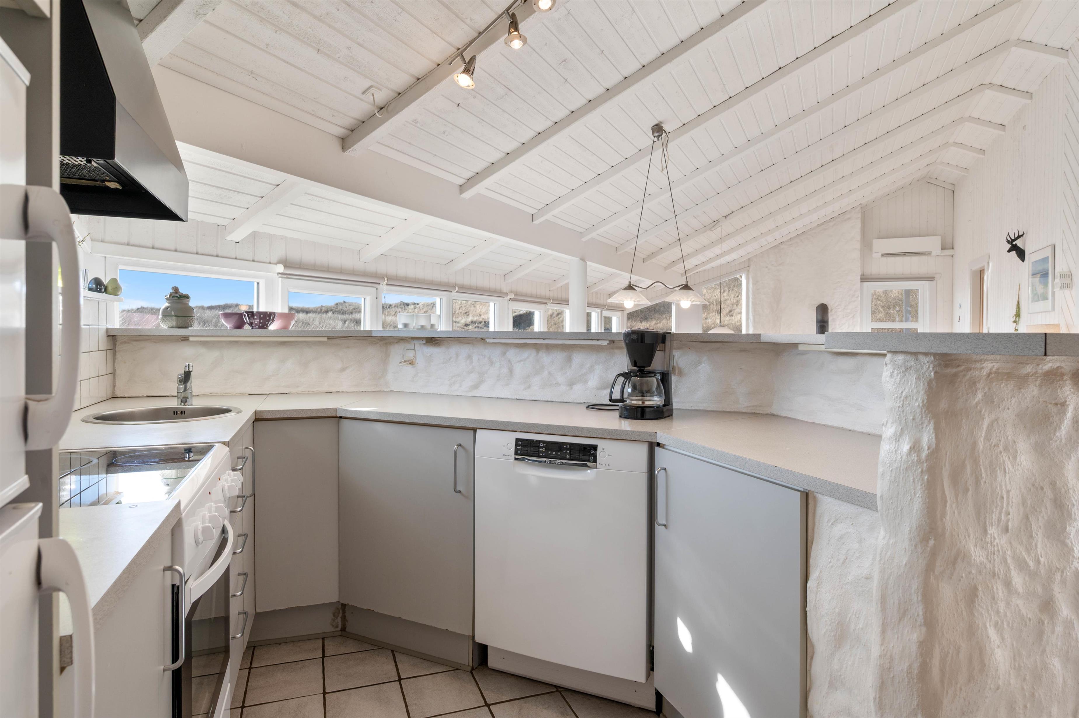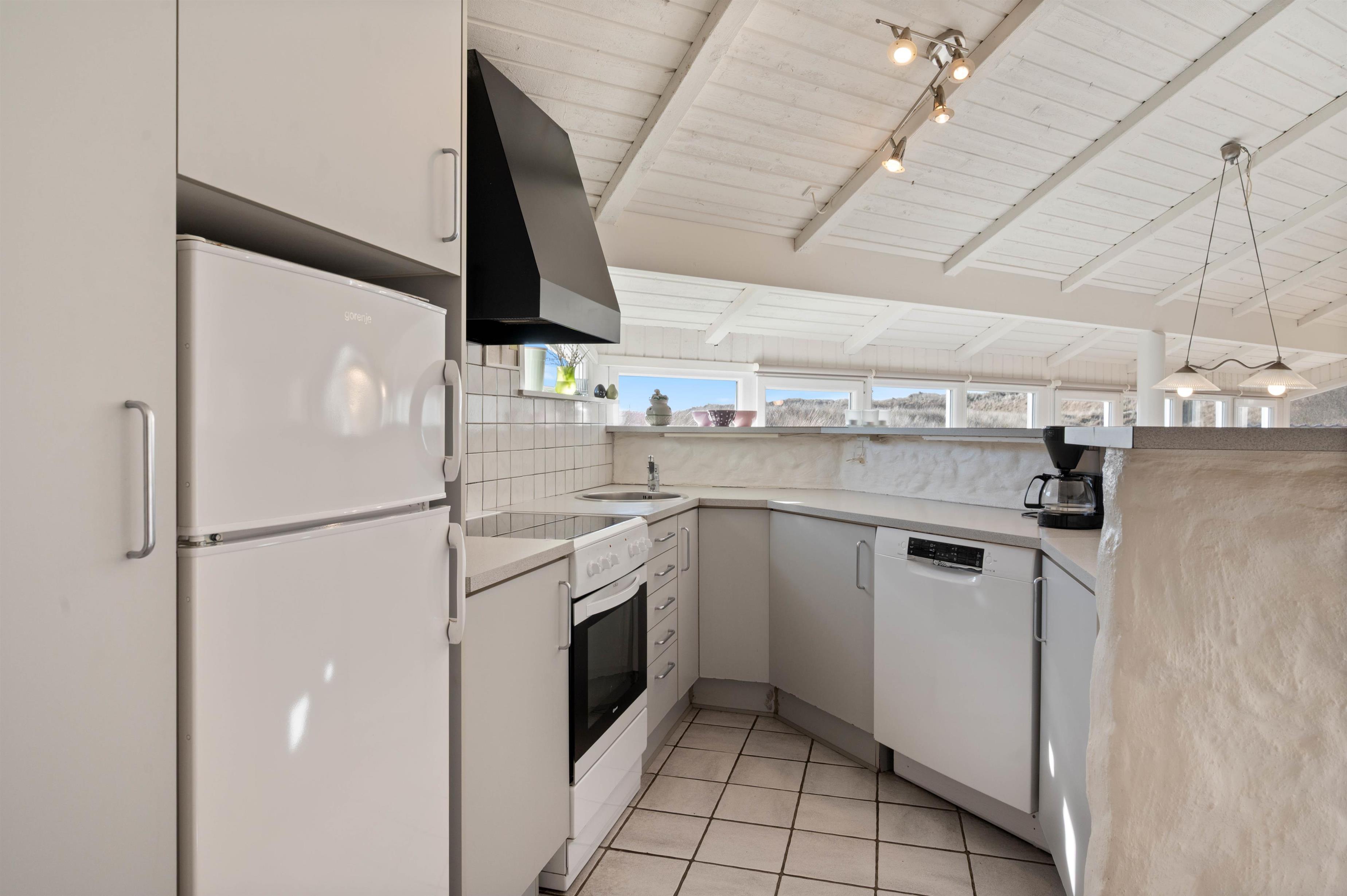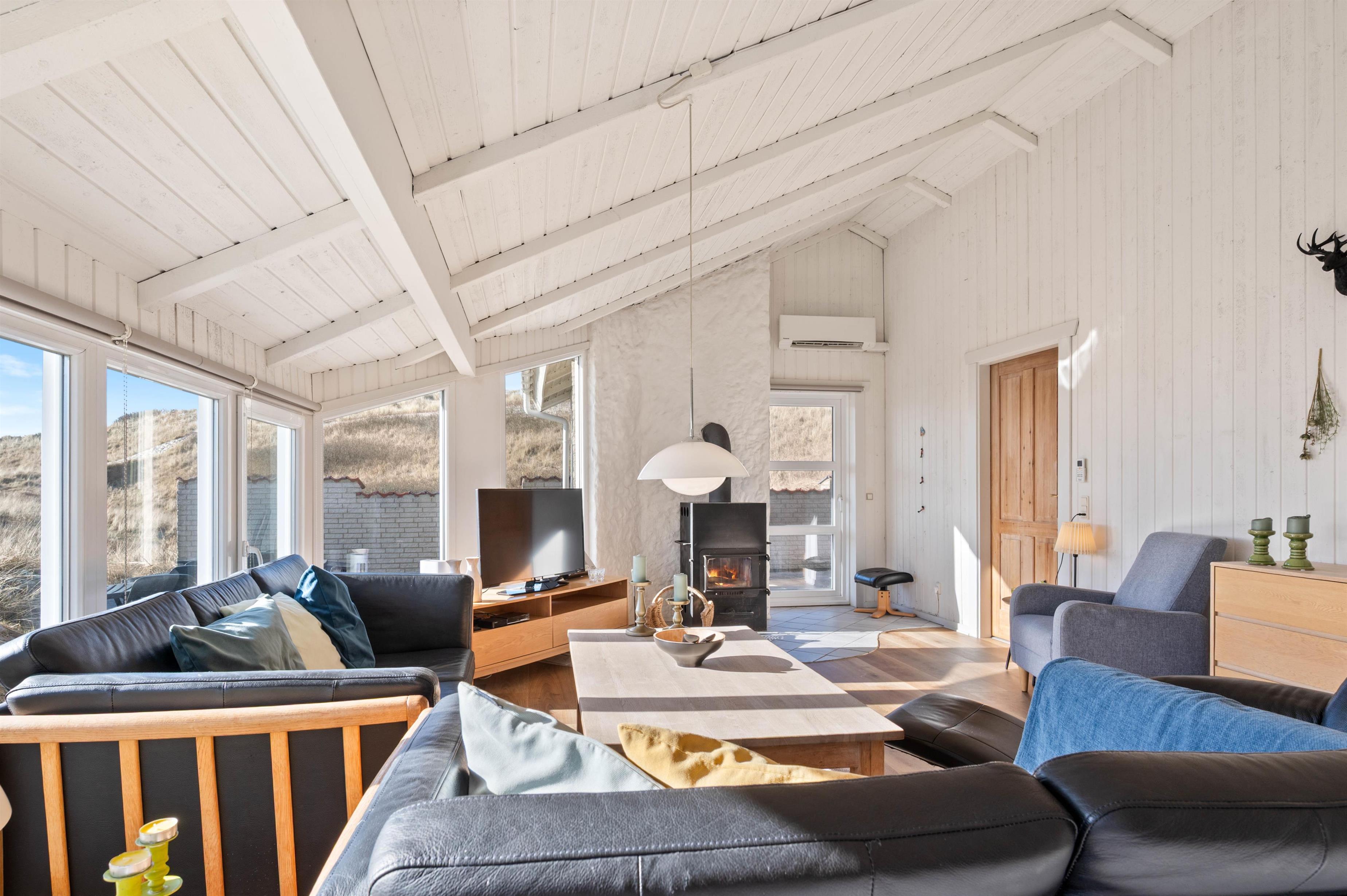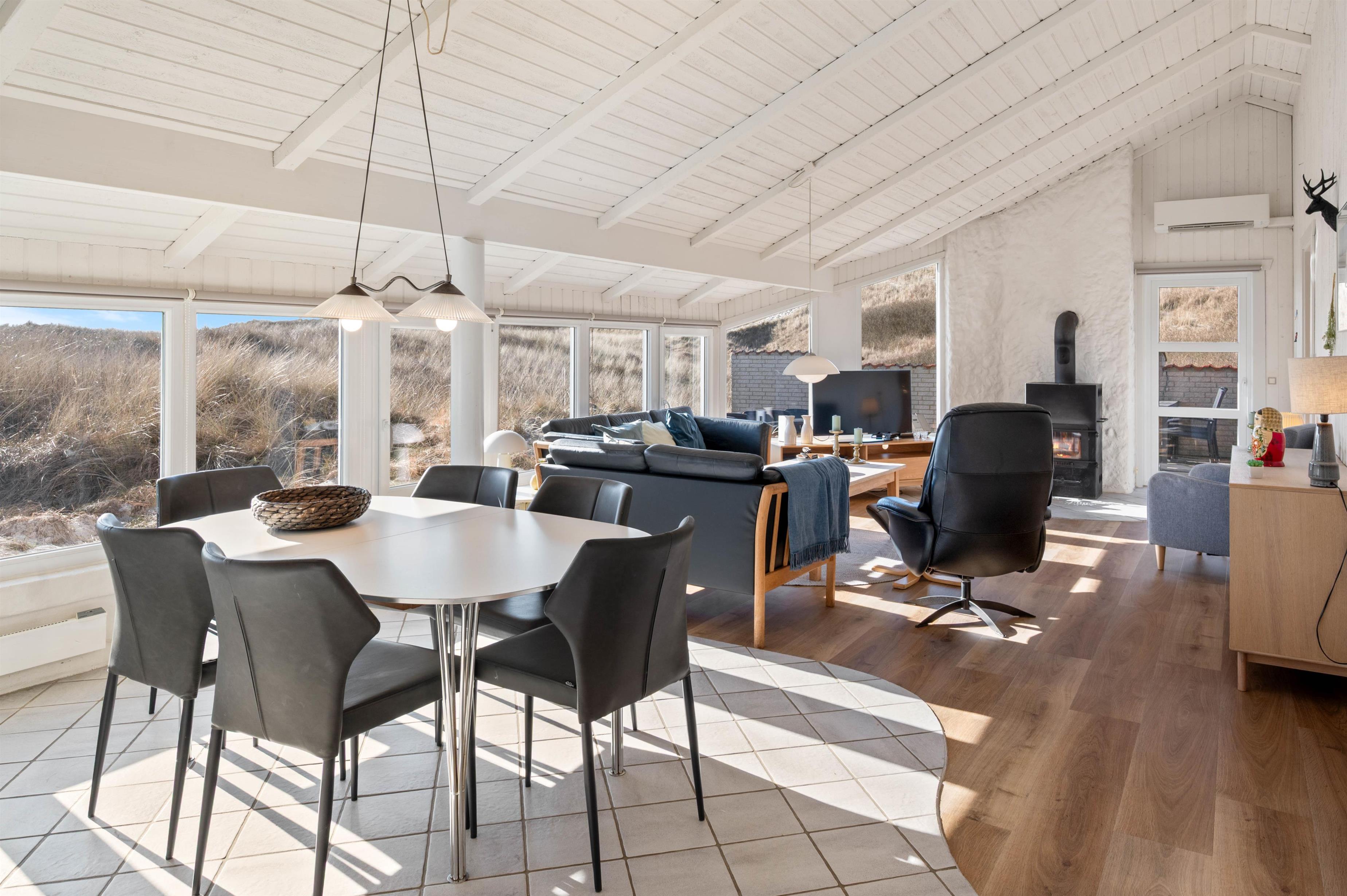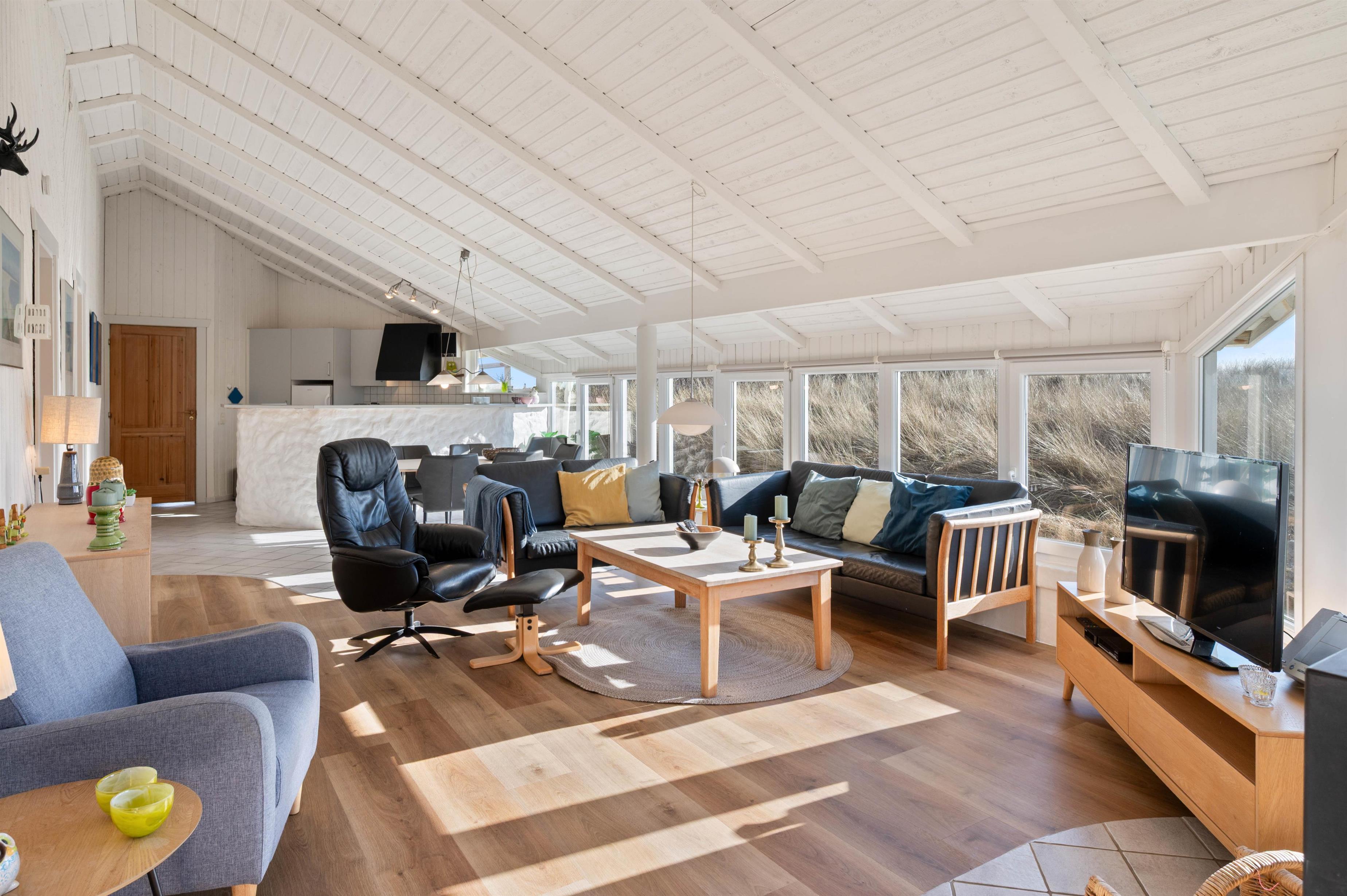 I den hyggelige stue kan I sammen hygge Jer foran tv'et eller omkring et spil. Og da der her er et stortvinduesparti, som også sørger for et godt lysindfald, kan I samtidig nyde udsigten over naturgrunden. I den ene ende luner brændeovnen, og i den anden ende er der indrettet et dejligt, åbent køkken, hvor I kan tilberede feriens måltider.