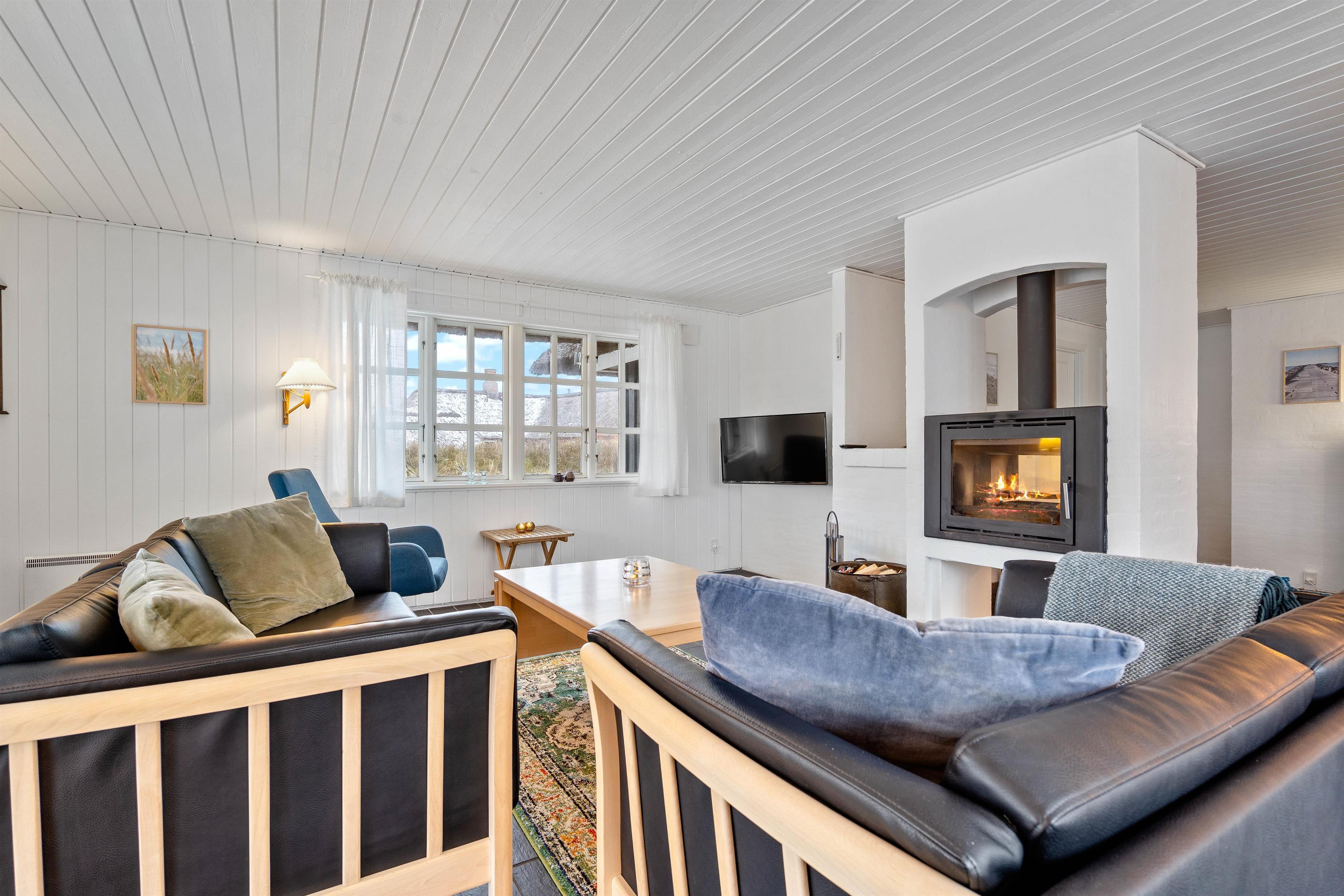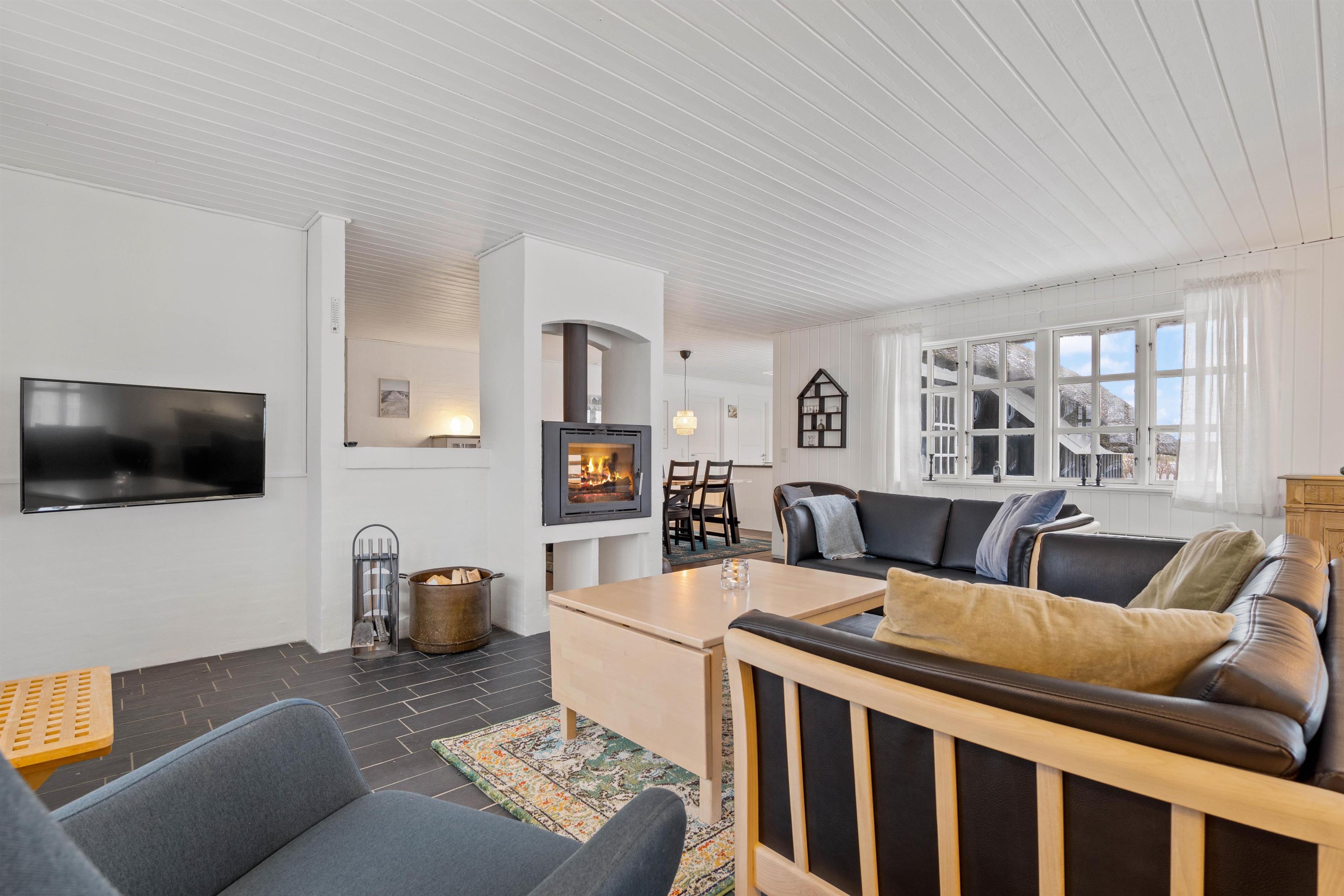 Køkkenalrummet byder på et funktionelt køkken med køkken-ø og med alt det nødvendige til at lave et lækkert måltid. Her kan i lave forskellige aktiviteter både sammen og hver for sig. Sæt dig foran tv-et og se en god film, eller læs en spændende bog foran den knitrende brændeovn.