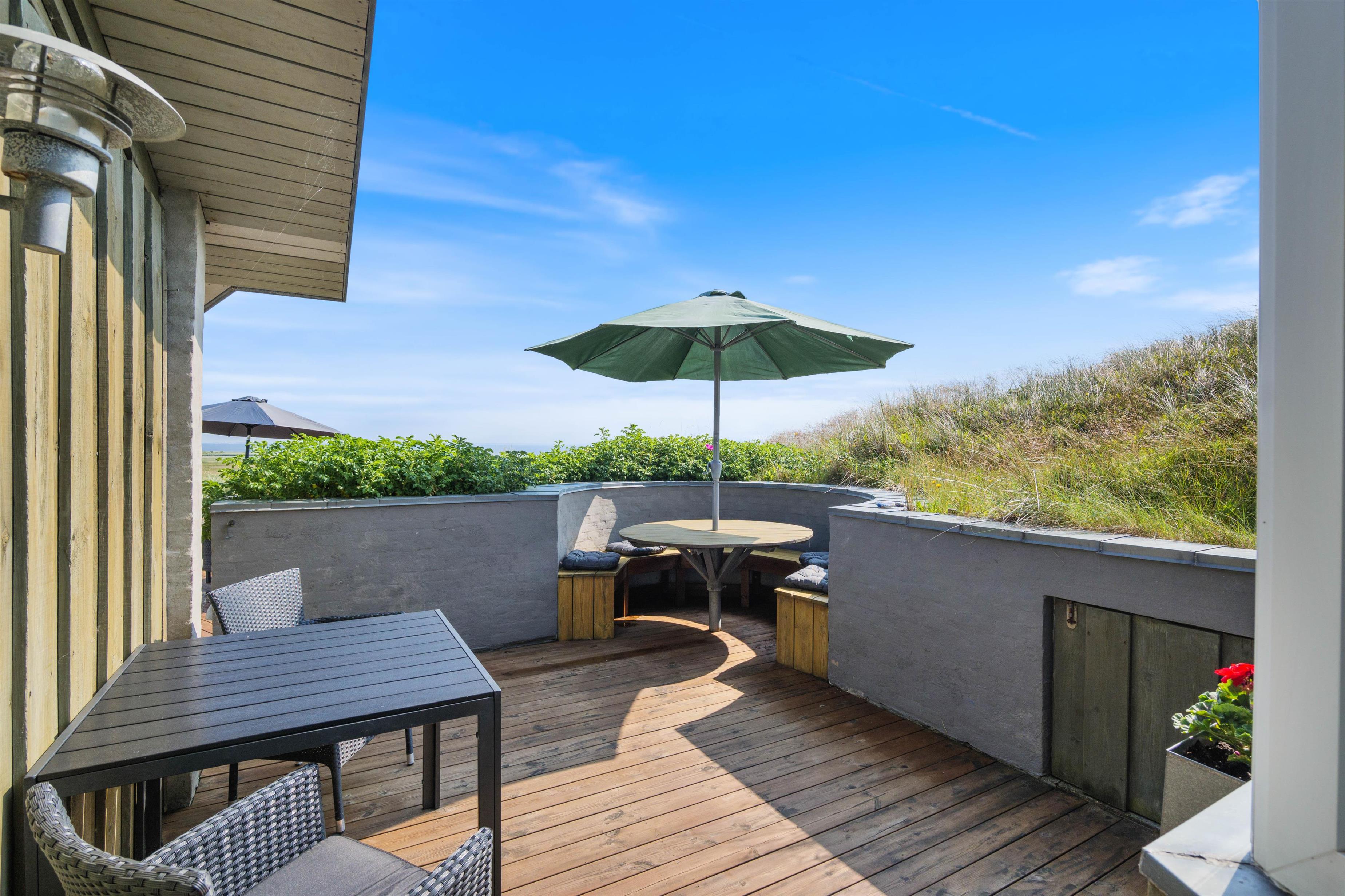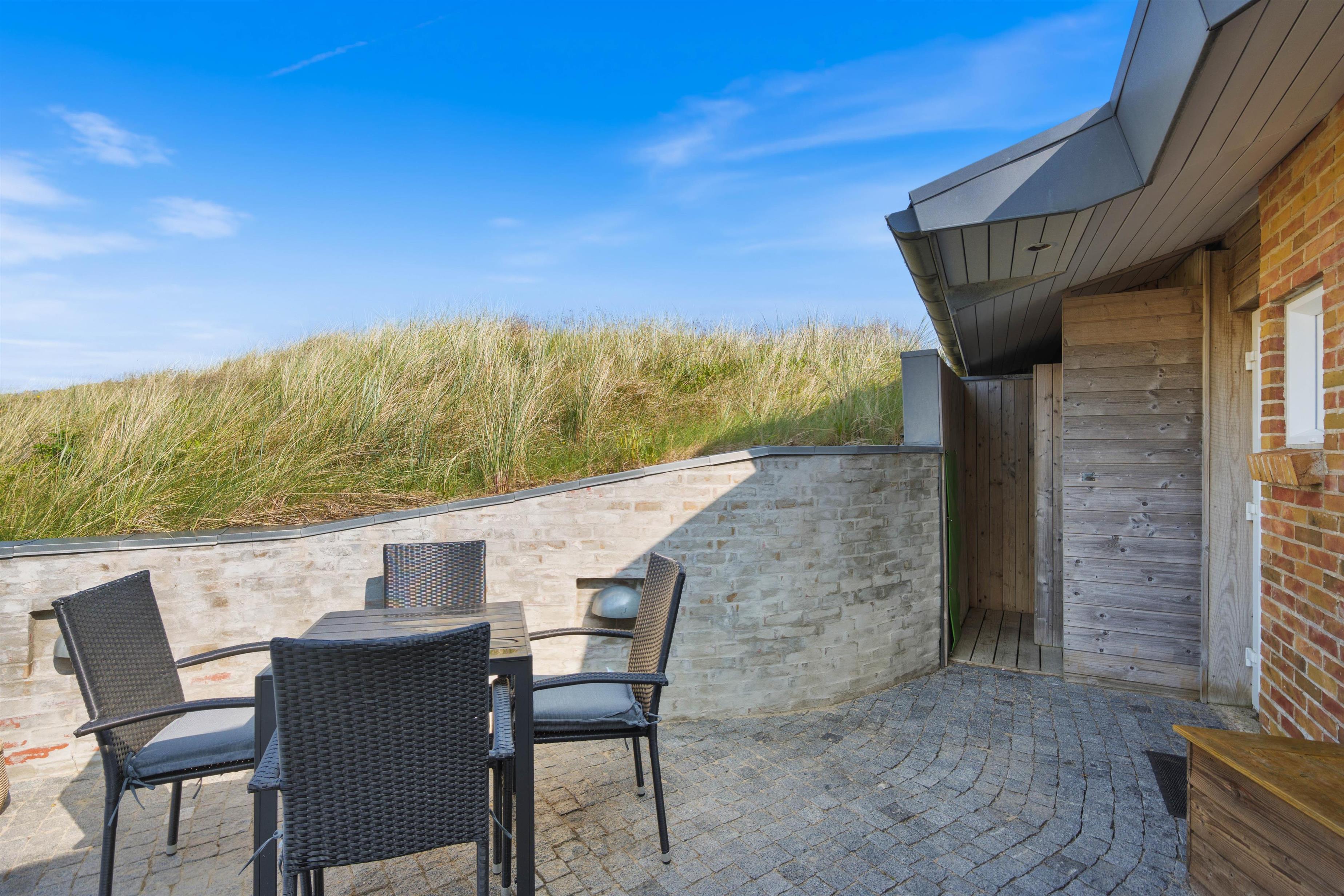 Sommerhuset befinder sig på toppen af Tingodden, og den flotte beliggenhed gør ikke huset mindre attraktivt. Med både øst- og vestvendt terrasse kan de morgenfriske få et glimt af den fantastiske solopgang på fjordsiden, og hele familien kan sidde sammen og følge solnedgangen, mens dagens eventyr og nye oplevelser bliver vendt. Efter en dejlig varm dag på terrassen er der mulighed for at tage et dejligt skyl under udebruseren, som er tilgængelig fra april til november.