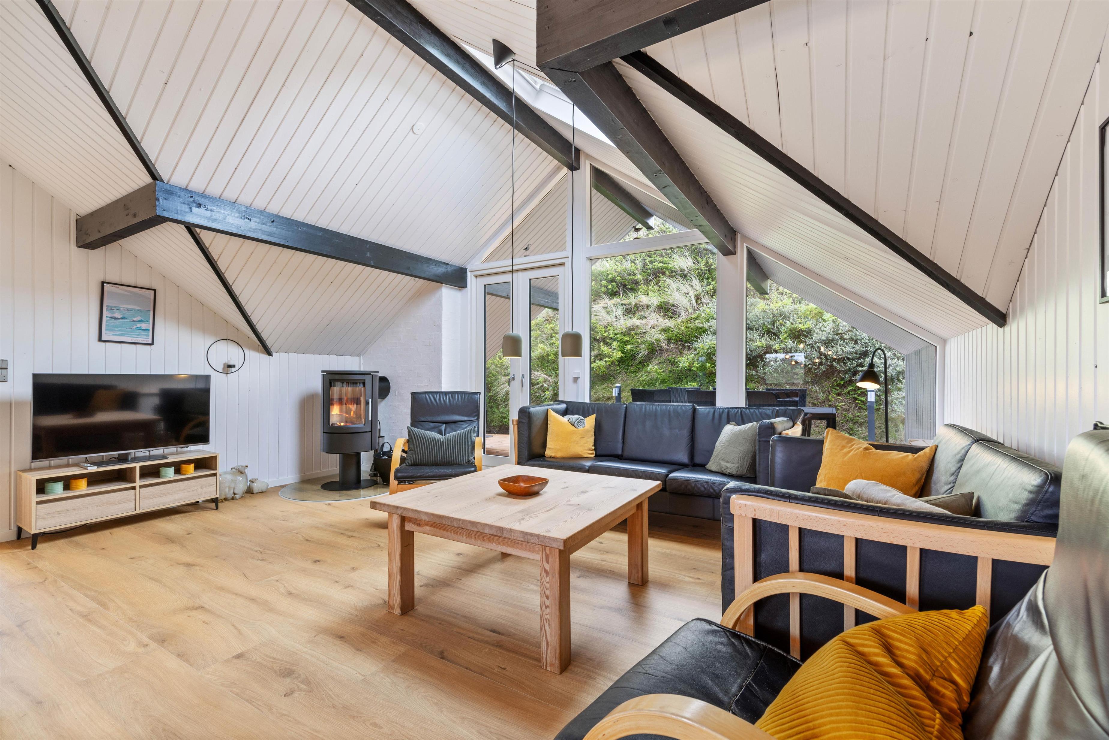Tingodden 170 er et superdejligt feriehus, hvor man hurtigt føler sig hjemme og godt tilpas. Feriehuset er lyst og smagfuldt indrettet i neutrale nuancer. Samlingspunktet er det rummelige opholdsrum, der forener stue og køkken. Her kan I hygge jer sammen, spille brætspil, se fjernsyn eller bare slænge jer i sofaen med en god bog. Masser af naturligt lys strømmer ind i det åbne opholdsrum gennem ovenlysvinduerne. I køkkenet bliver madlavningen til en leg. Lav et dejligt måltid, som samler familien omkring spisebordet. På de køligere aftener kan I tænde op i den dejlige brændeovn, som spreder varme og glæde.