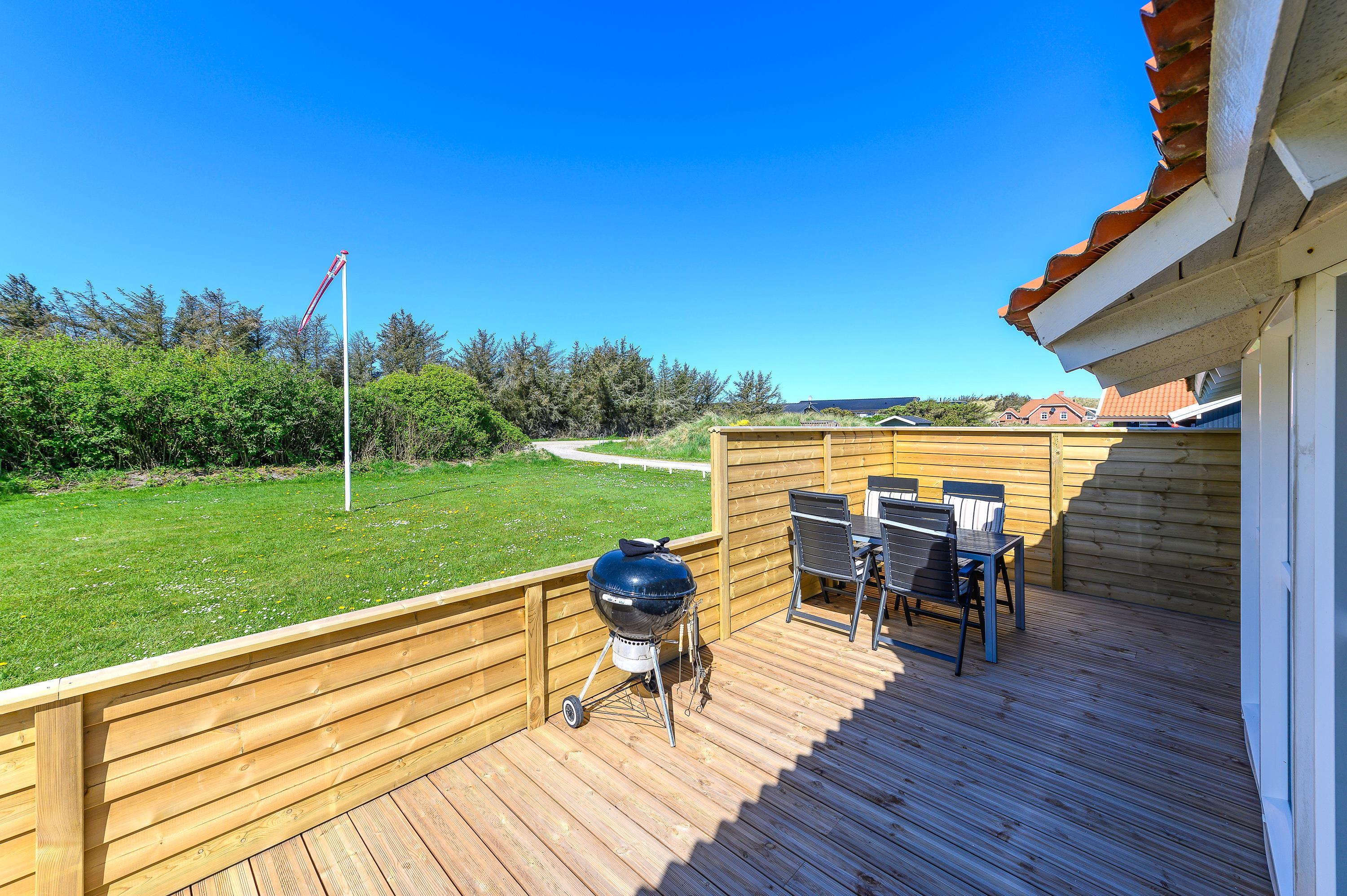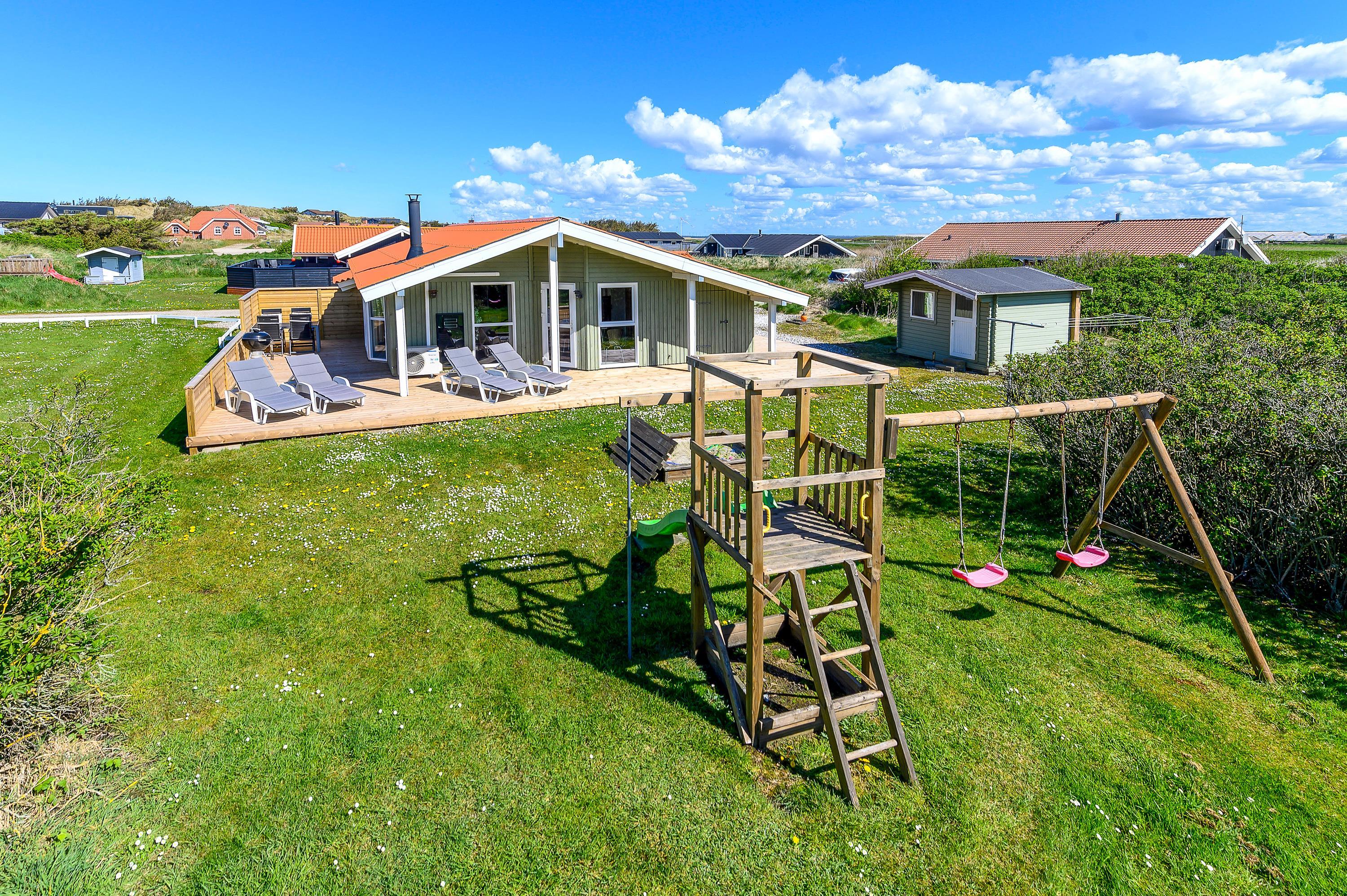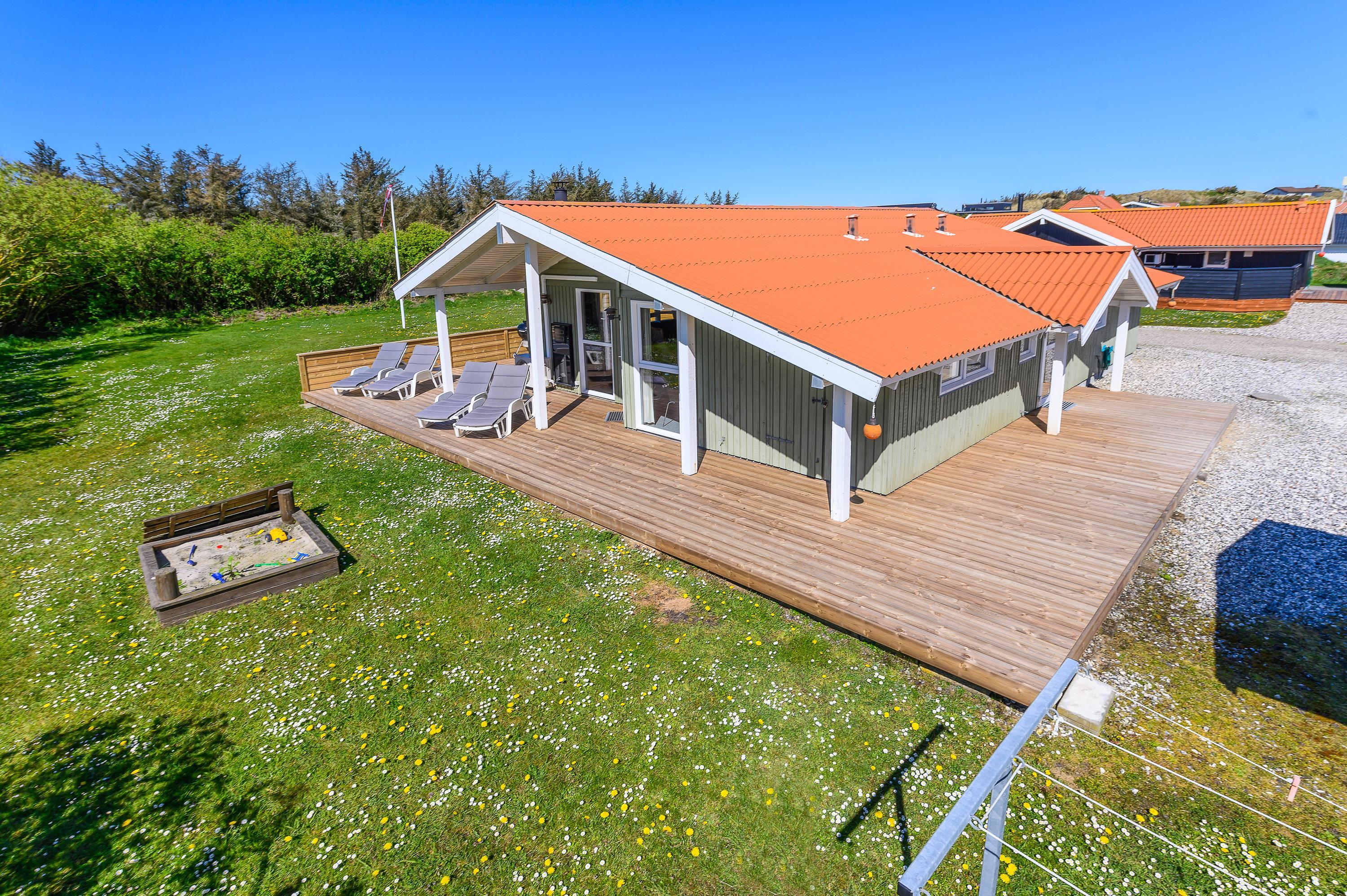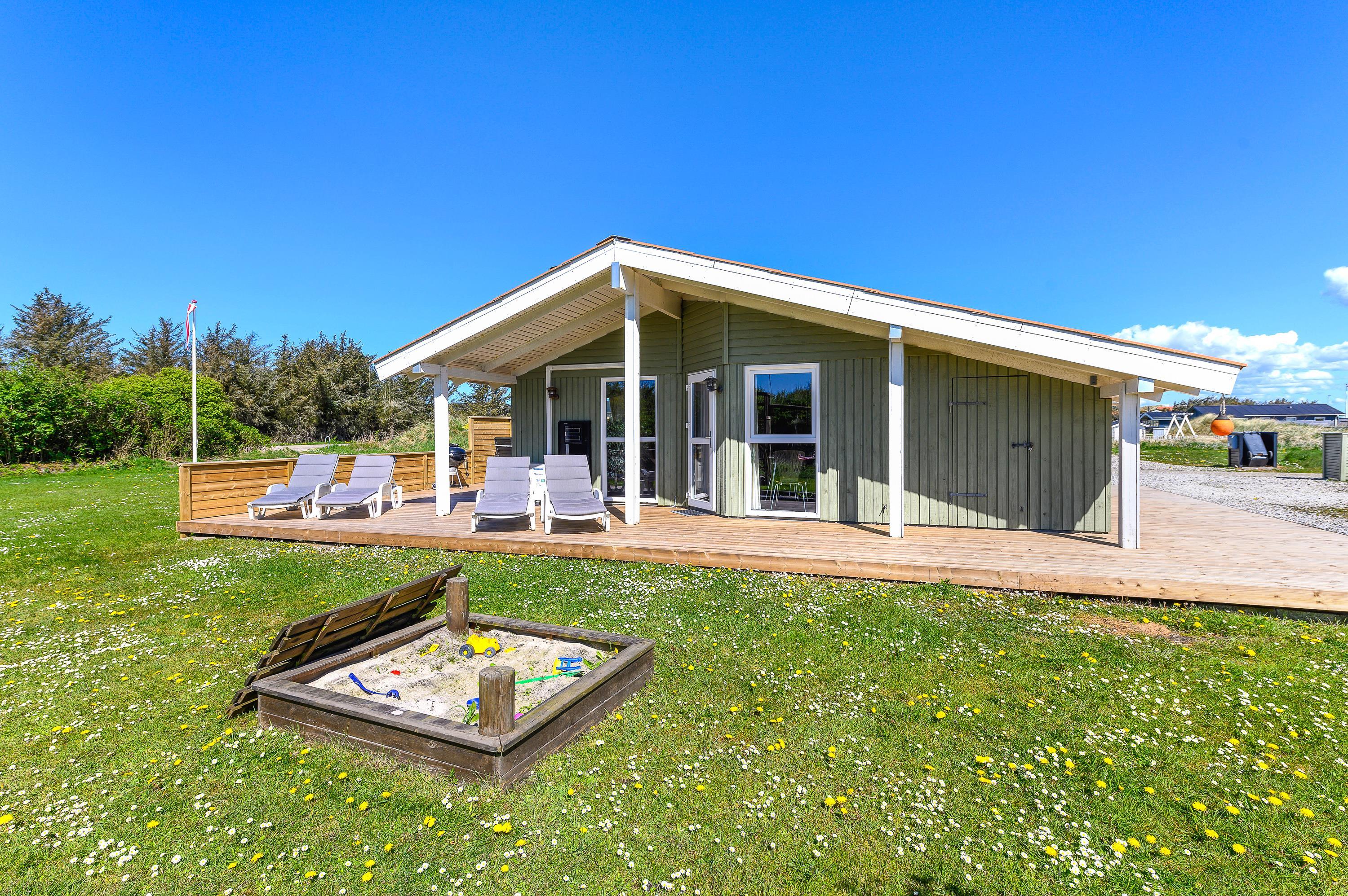Dette fine feriehus kan danne rammerne om en skøn ferie for 8 feriegæster samt 2 kæledyr. Feriehuset er velegnet til hunde-familien, da Vesterhavet ikke er langt herfra. Også den store plænegrund vil komme hunde og børn til gode, da her er plads til leg som kongespil eller fodbold. På græsplænen kan børnene også hygge sig i sandkassen eller på gyngerne – mens de voksne kan holde øje og nyde kaffen på den skønne træterrasse. Træterrassen er delvist afskærmet, så her kan I sidde i læ for vinden eller solens stråler.