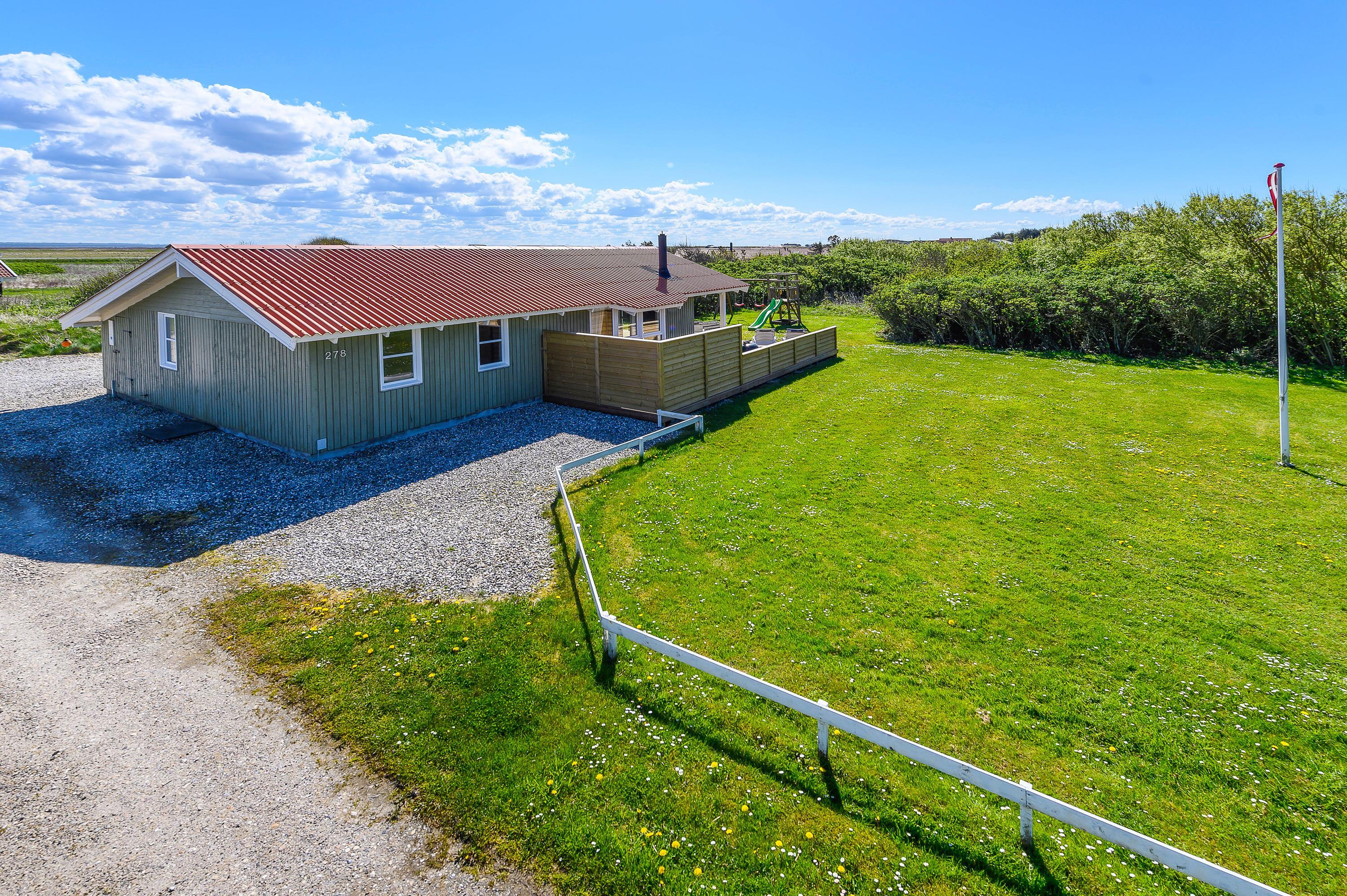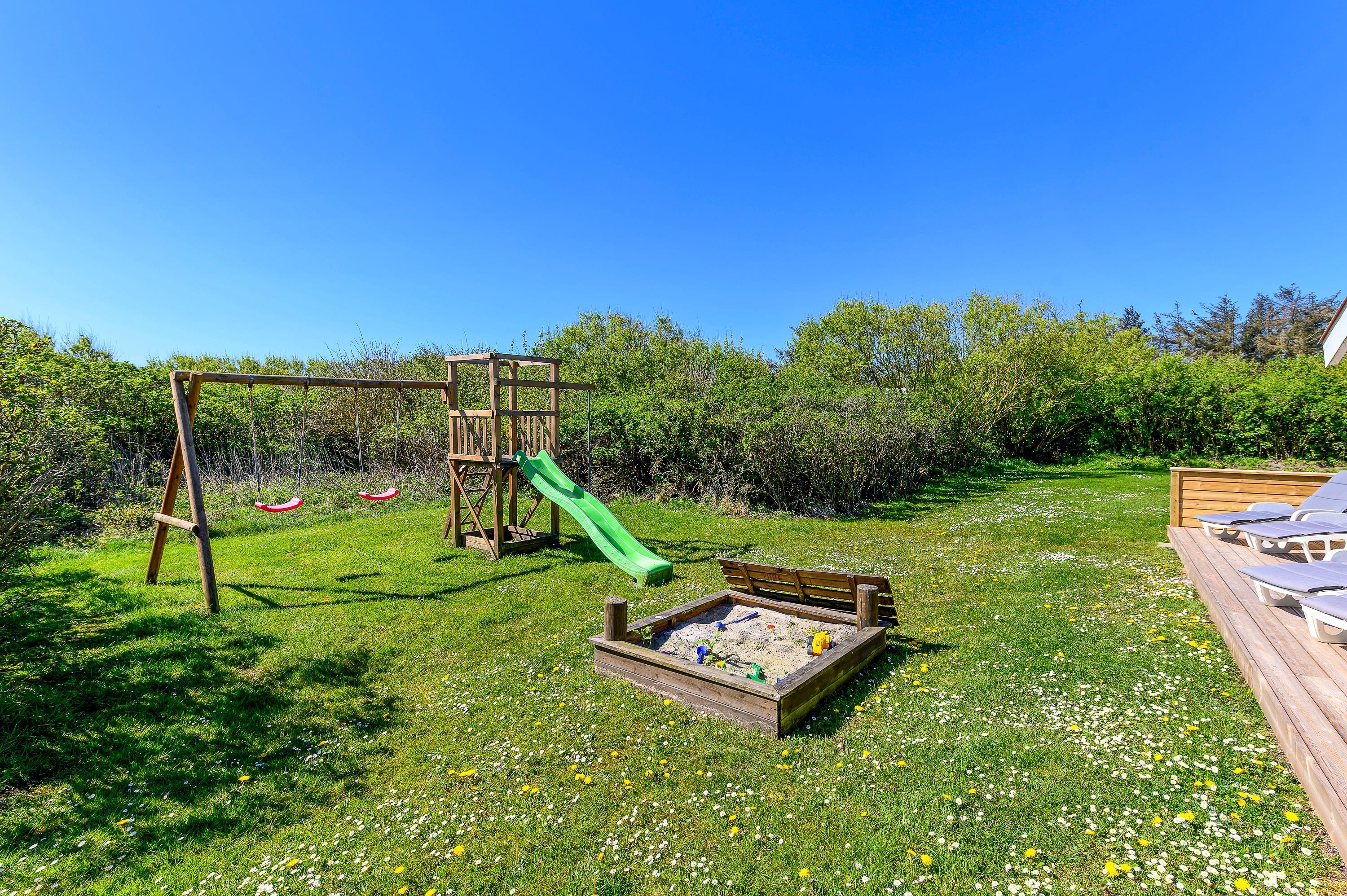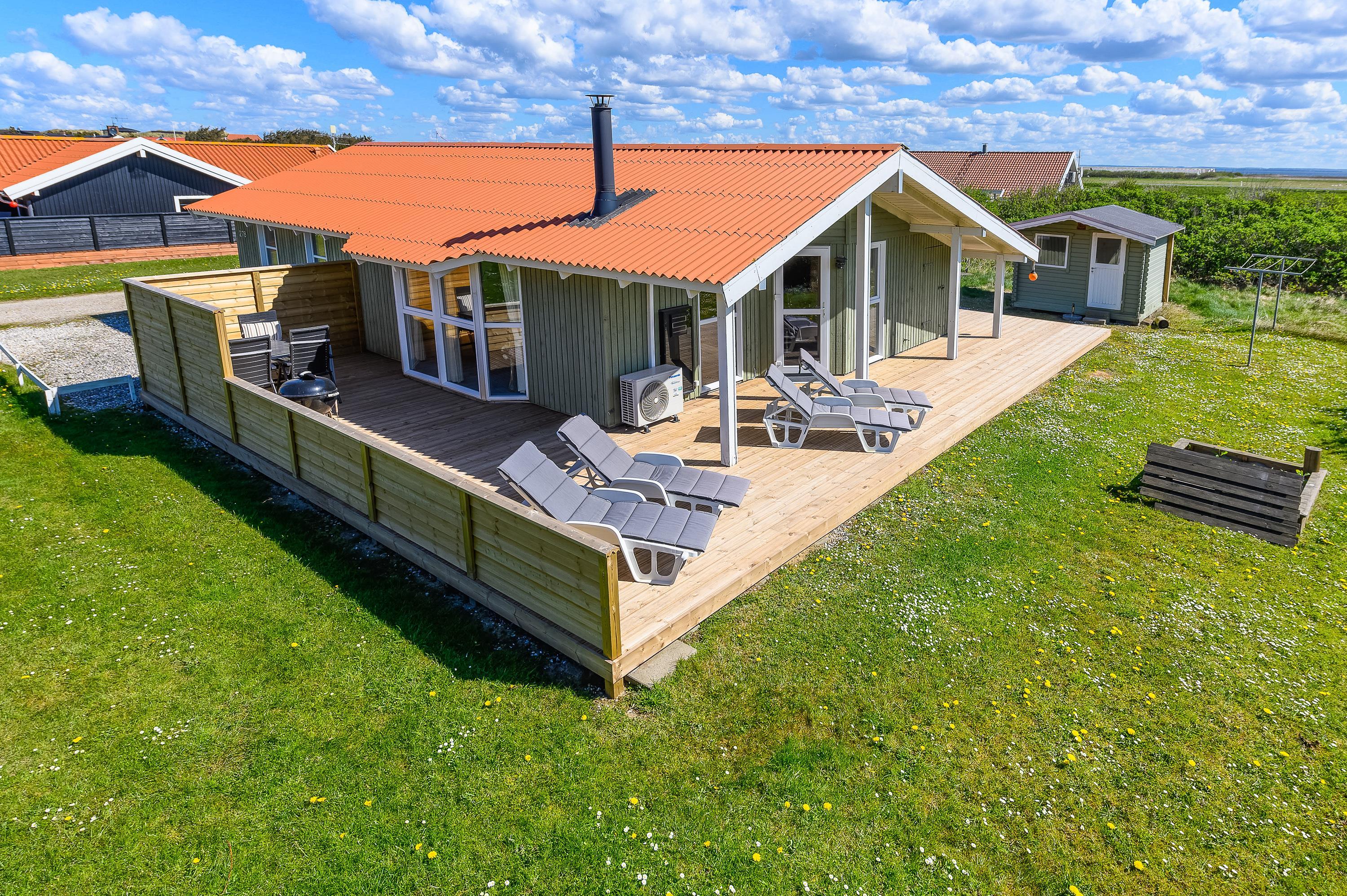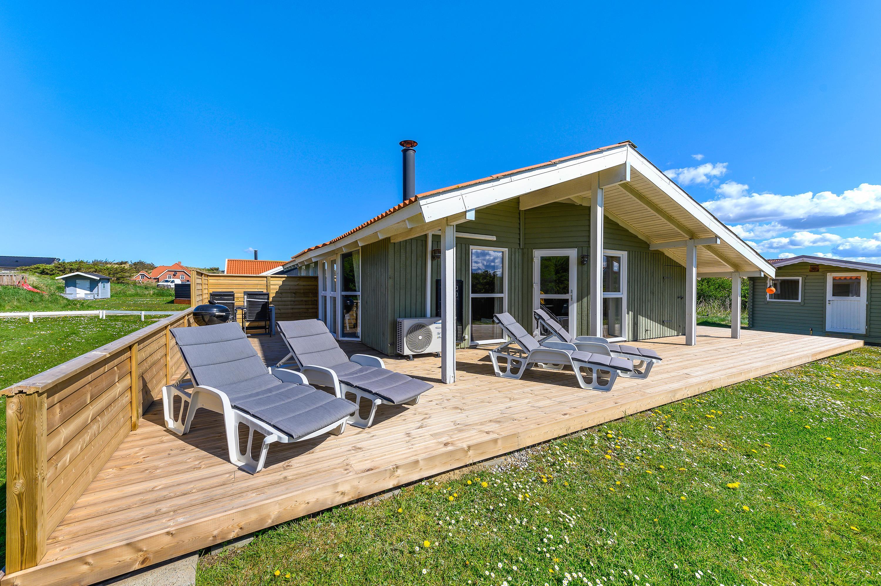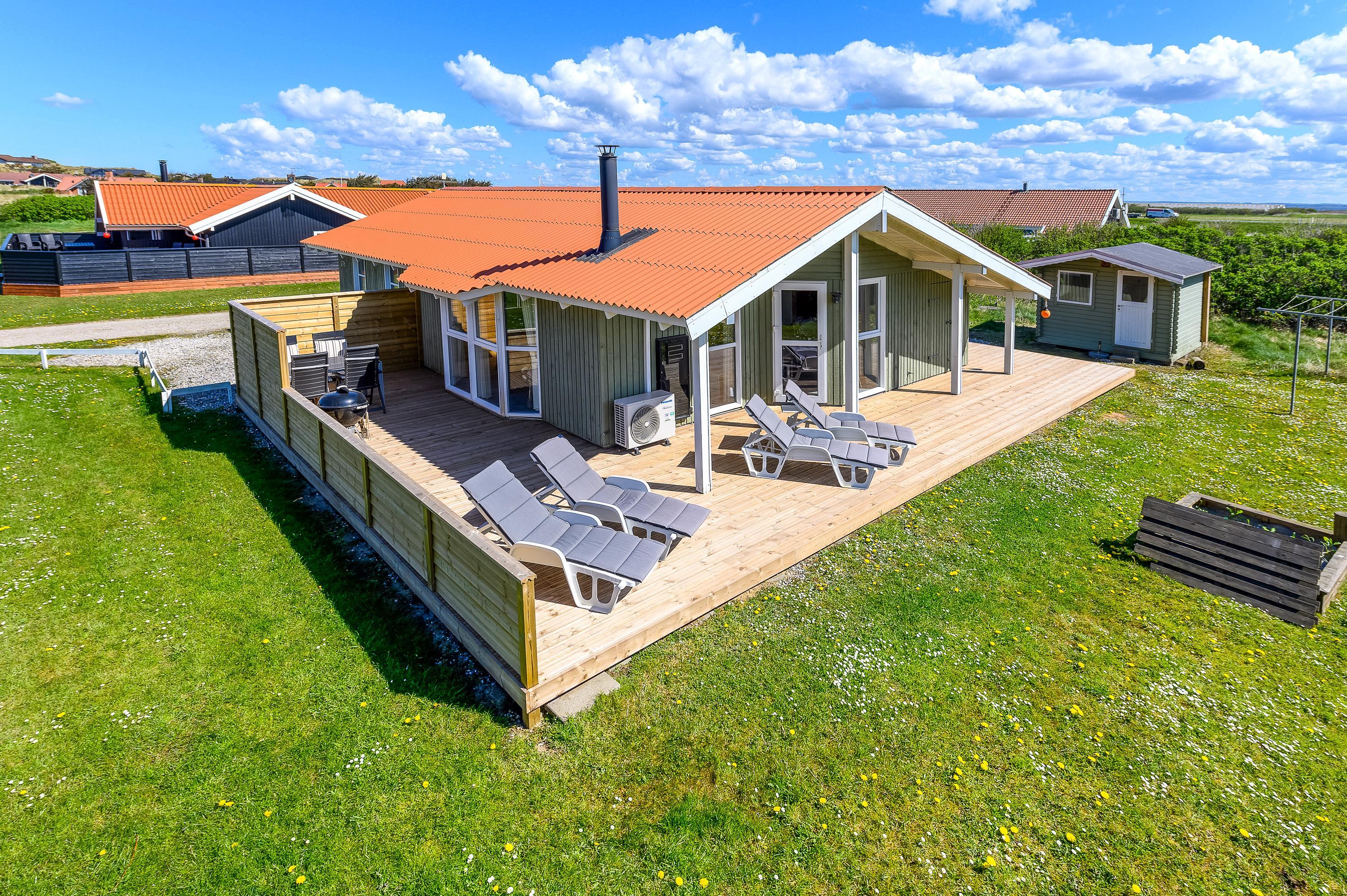 Dette fine feriehus kan danne rammerne om en skøn ferie for 8 feriegæster samt 2 kæledyr. Feriehuset er velegnet til hunde-familien, da Vesterhavet ikke er langt herfra. Også den store plænegrund vil komme hunde og børn til gode, da her er plads til leg som kongespil eller fodbold. På græsplænen kan børnene også hygge sig i sandkassen eller på gyngerne – mens de voksne kan holde øje og nyde kaffen på den skønne træterrasse. Træterrassen er delvist afskærmet, så her kan I sidde i læ for vinden eller solens stråler.
