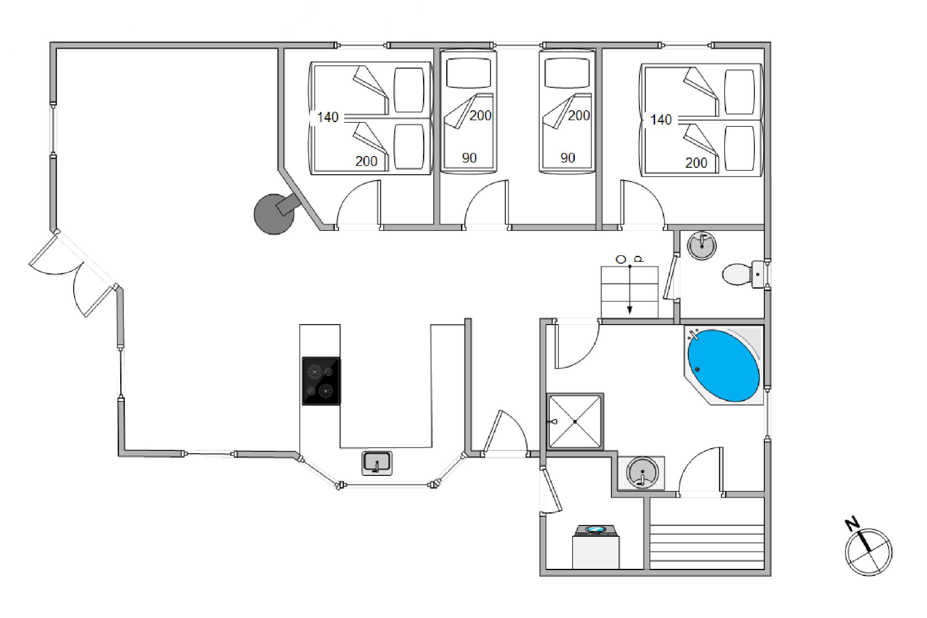 2 af sommerhusets 3 soveværelser er udstyret med dobbeltsenge (140 x 200 cm) og det sidste værelse med 2 enkeltsenge. For at der ikke skal opstå køkultur under ferien, er der både badeværelse og et gæstetoilet.