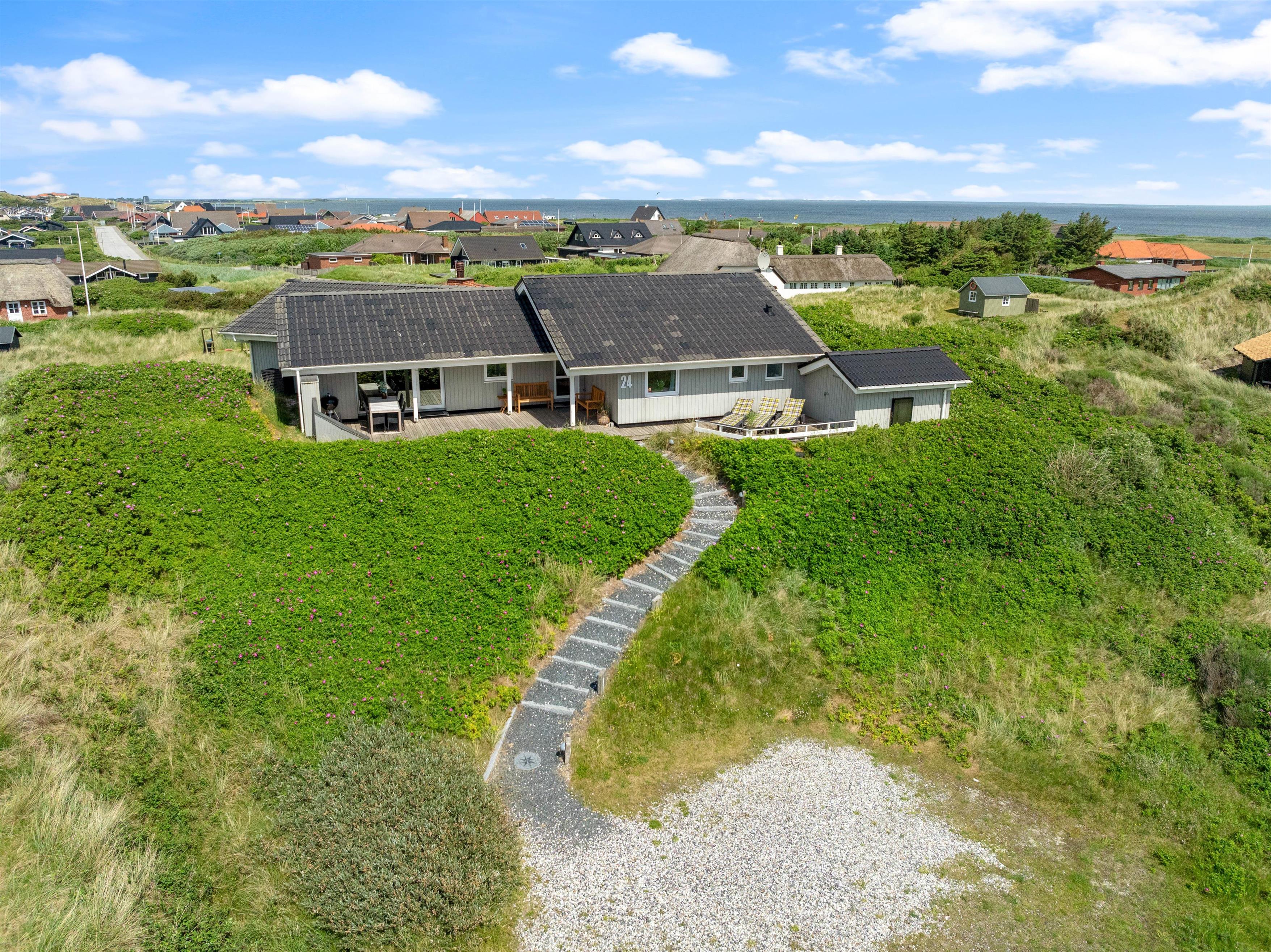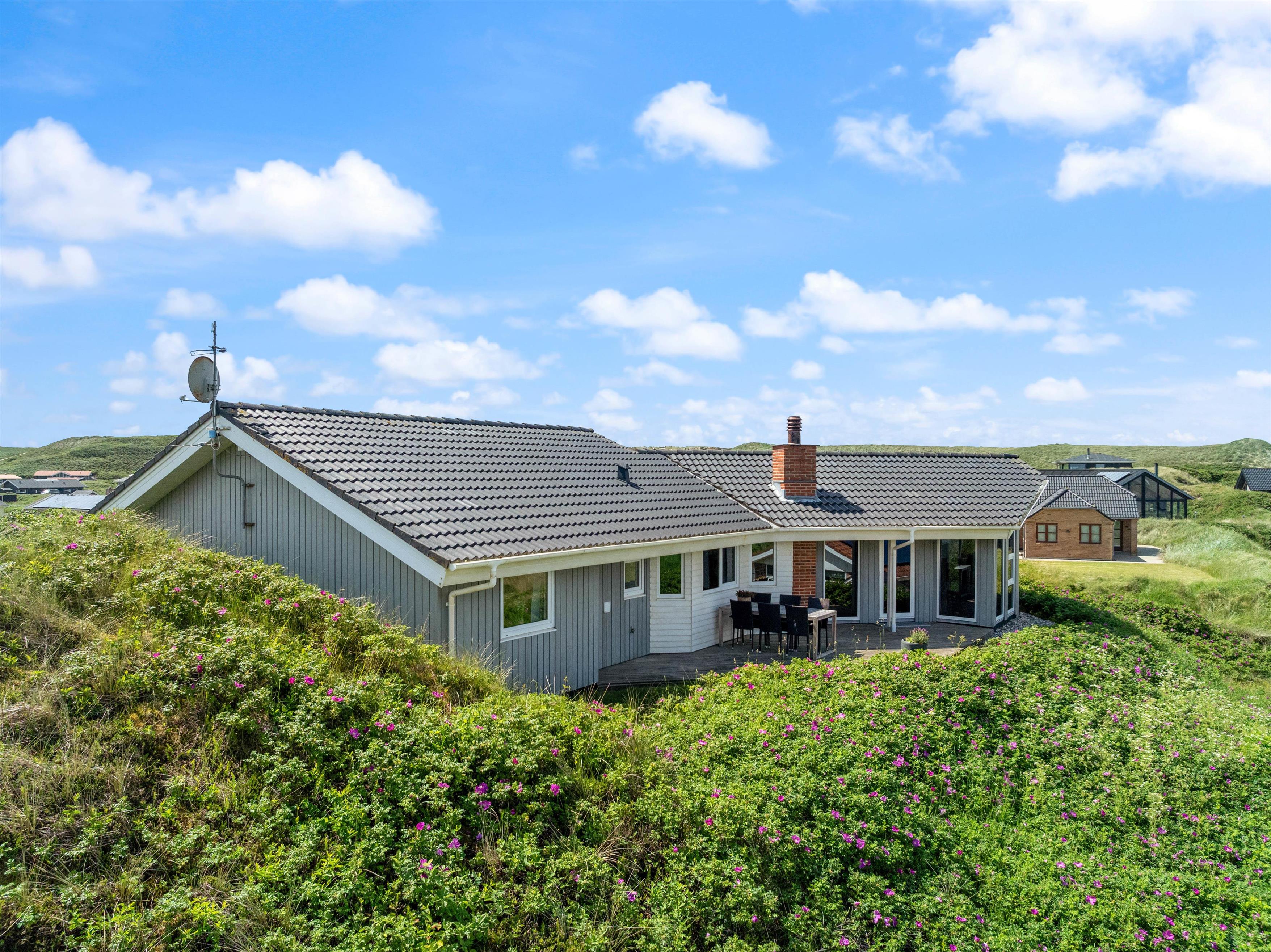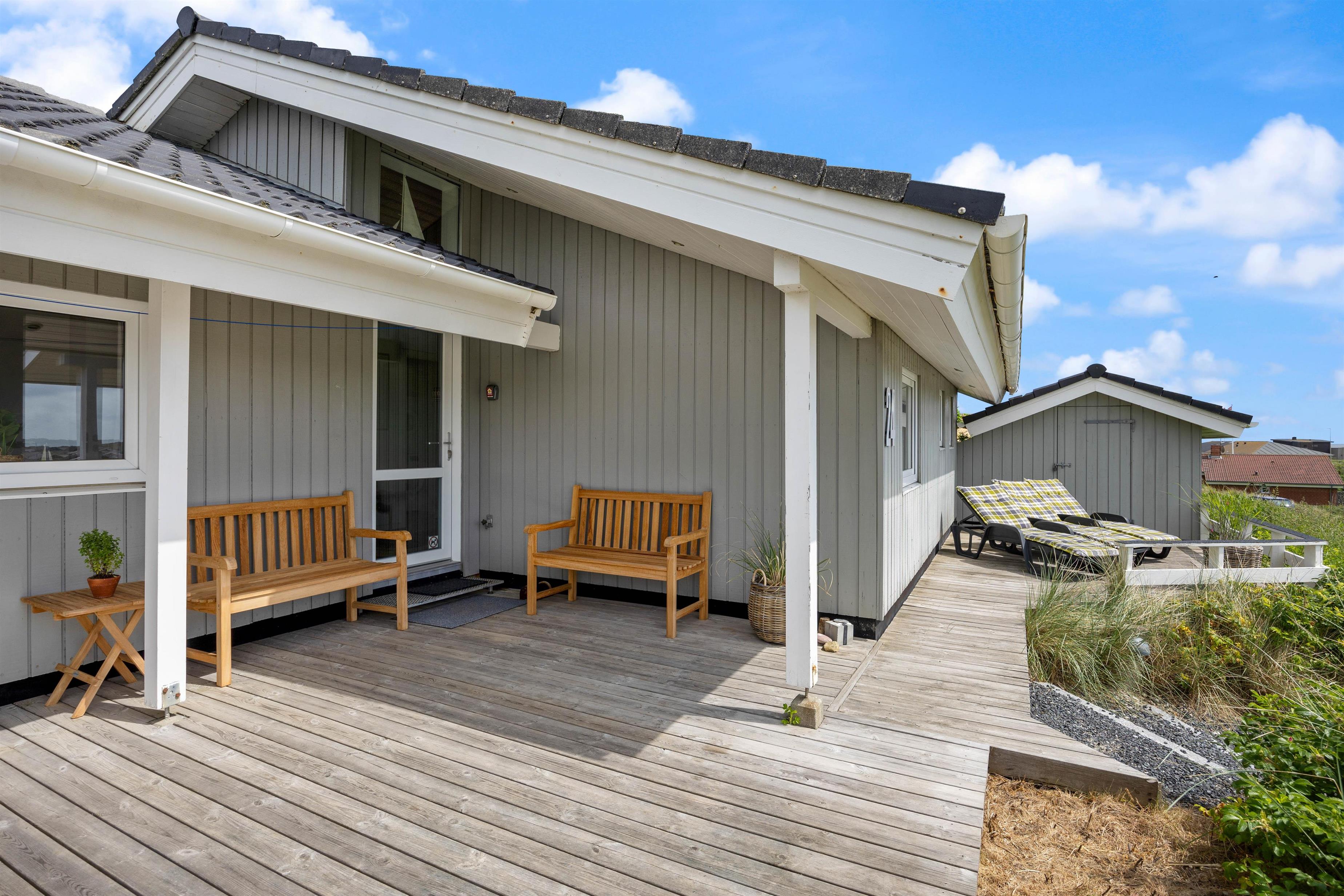 Udenfor finder I en skøn terrasse, som både er delvist overdækket, afskærmet og åben, så her er der mulighed for at finde en hyggelig krog. Fra terrassen har I blandt andet en skøn udsigt udover Ringkøbing Fjord. På terrassen er der plads til, at I kan holde en hyggelig grillaften, imens I nyder den skønne vesterhavsluft.
