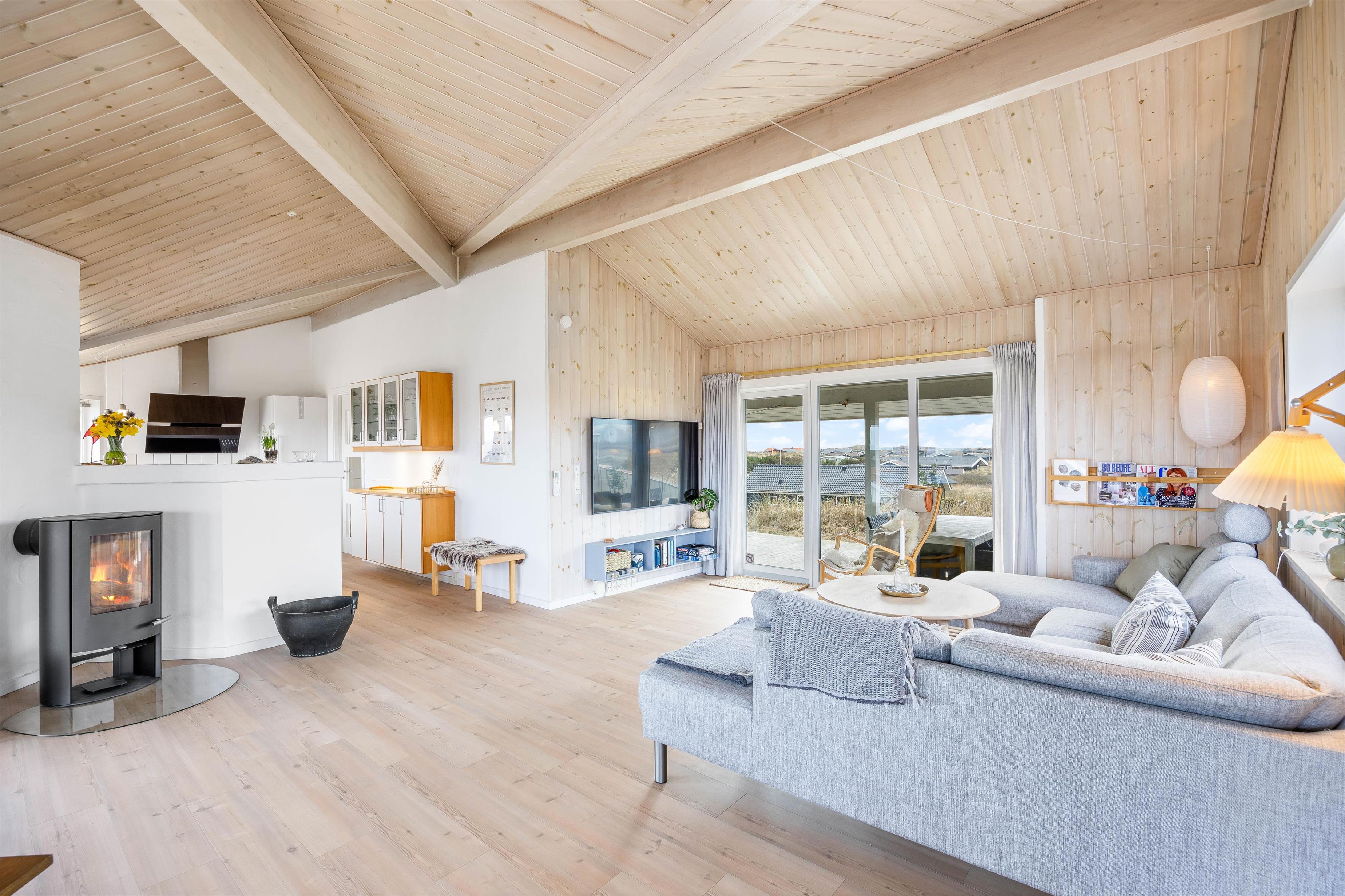 Med højt til træloftet vil I mærke en dejlig rummelighed i køkken/alrummet. Her kan I alle samles og slappe af, imens brændeovnen giver en hyggelig stemning. Udover brændeovnen finder I også en varmepumpe, som I kan bruge til at holde sommerhuset varmt på de kolde dage. Fra stuen har I en smuk udsigt udover Ringkøbing Fjord.