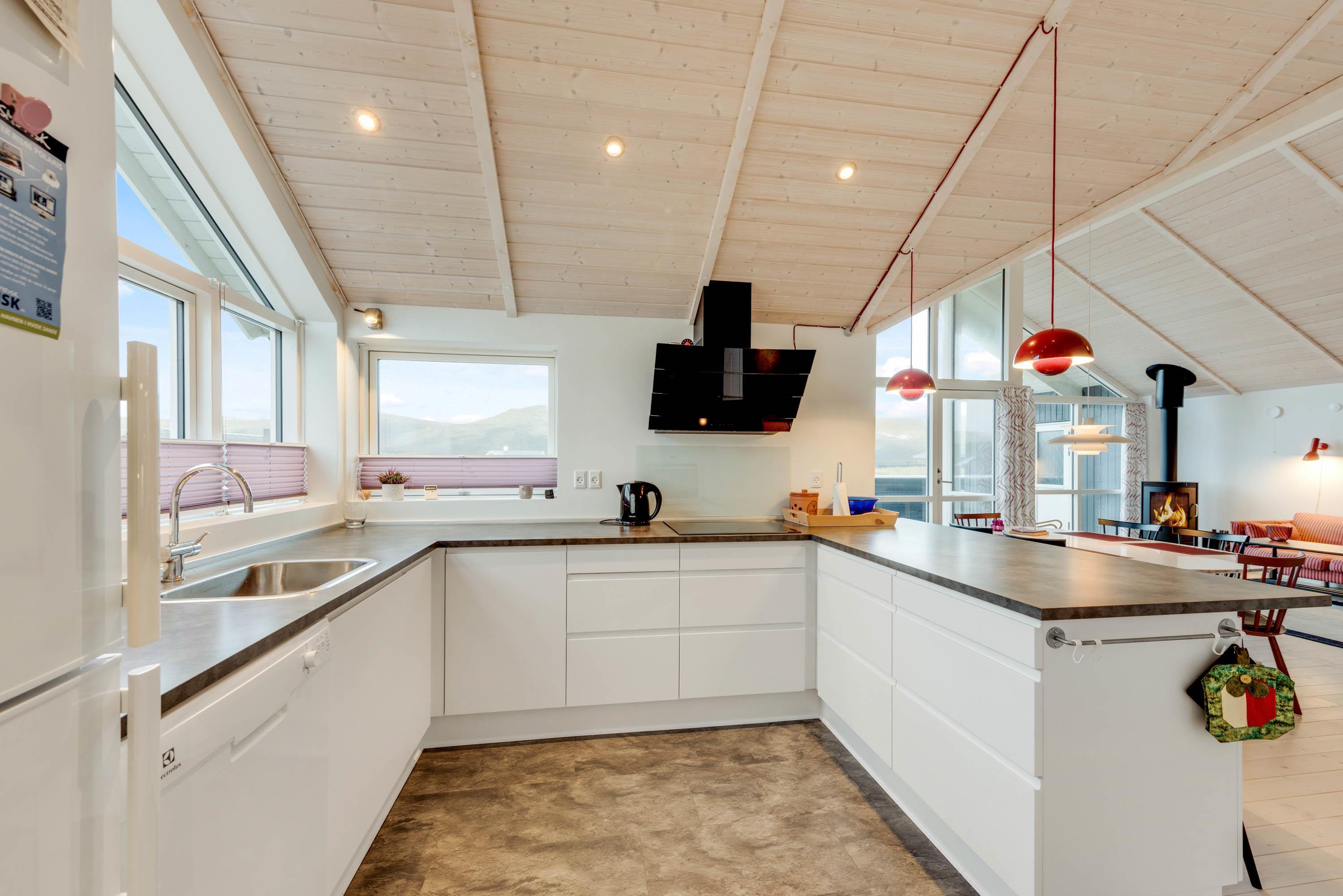 Køkken og stue er placeret i forbindelse med hinanden med store vinduespartier mod vest, som giver et virkeligt flot lysindfald og en vidunderlig udsigt til klitterne. I kan for eksempel nyde den flotte udsigt foran brændeovnen efter en lang travetur langs Vesterhavet. Det giver fred og ro i sjæl og krop, og det er ægte kvalitetsferie på Holmsland Klit.