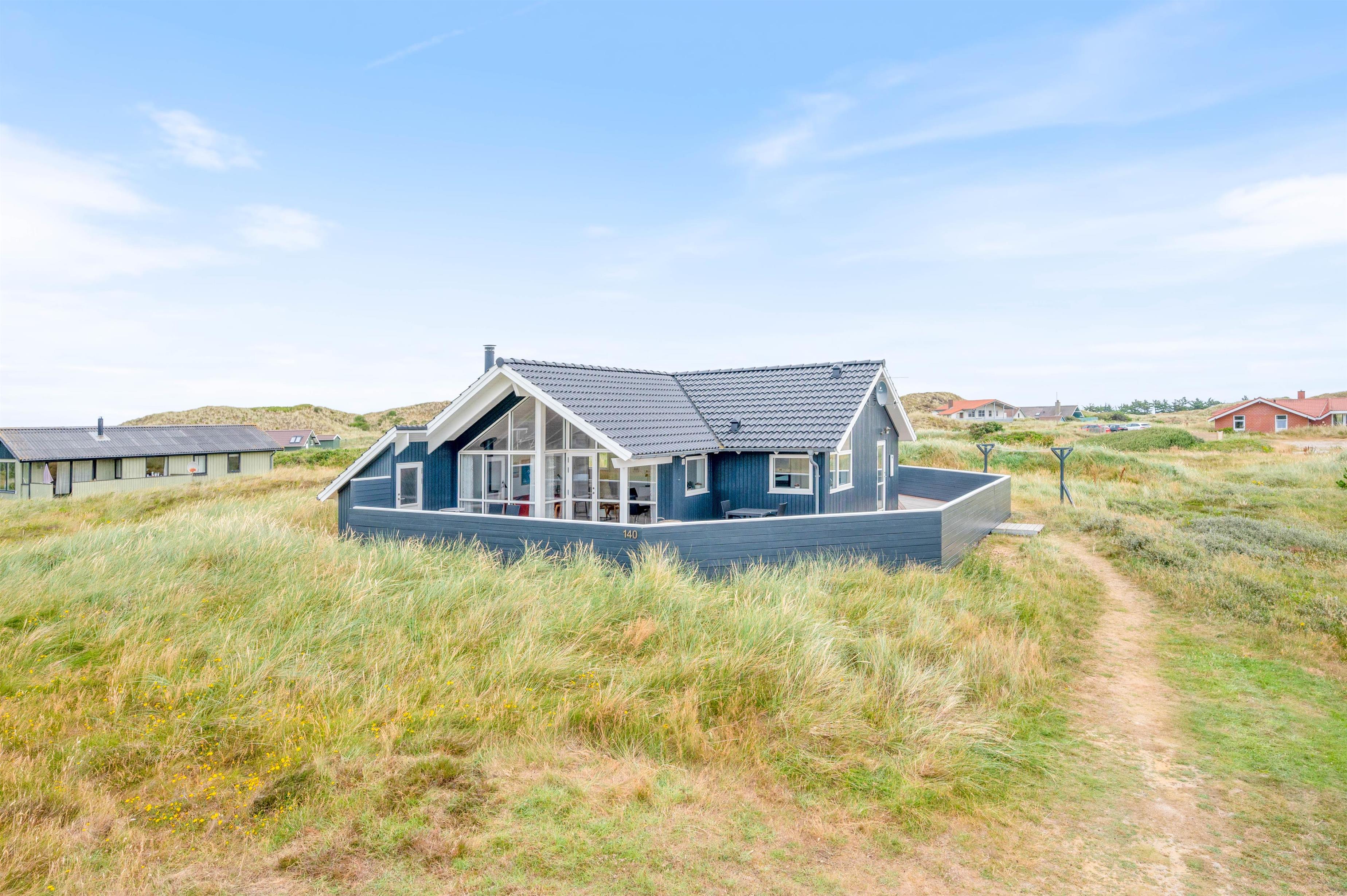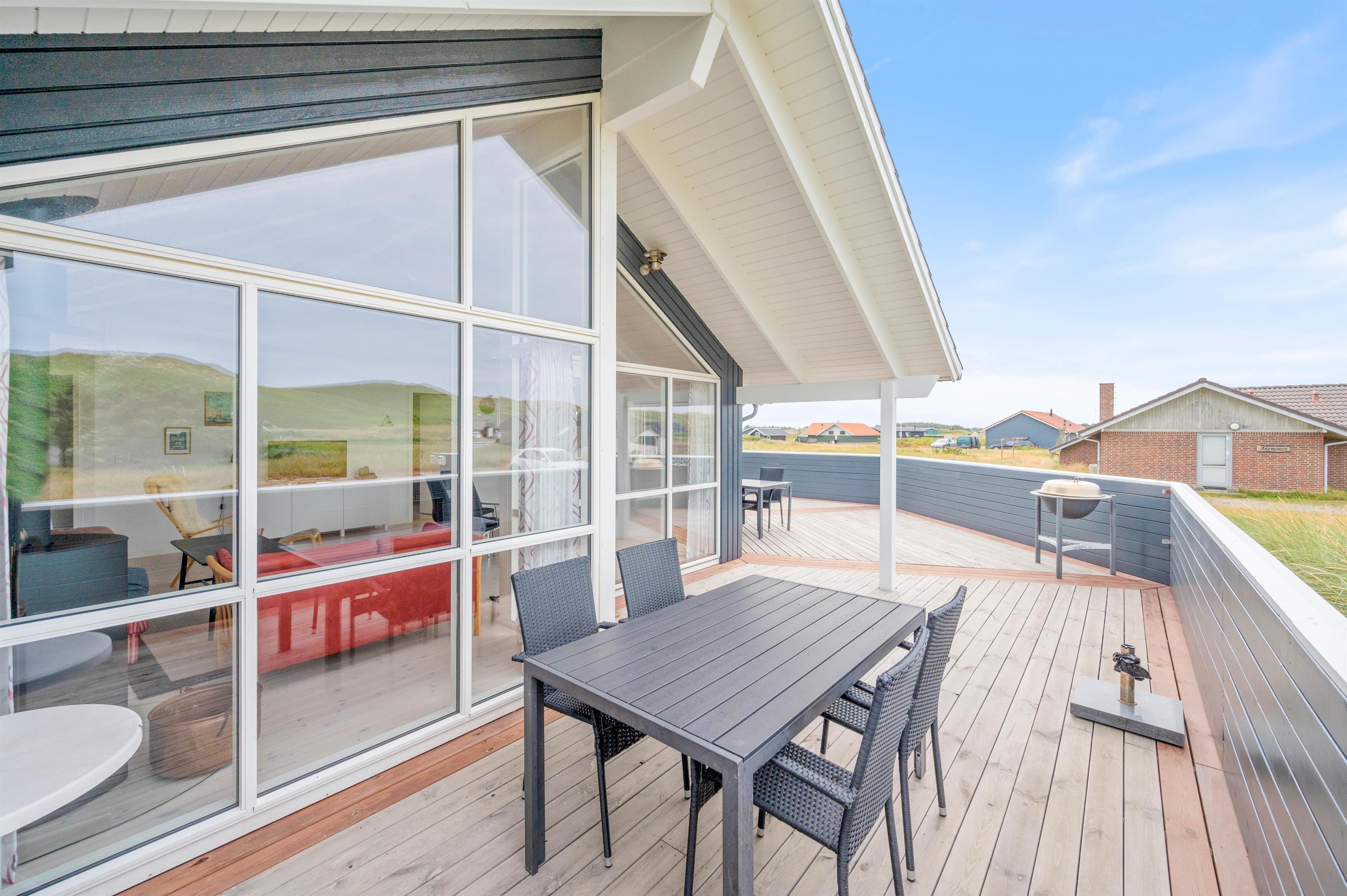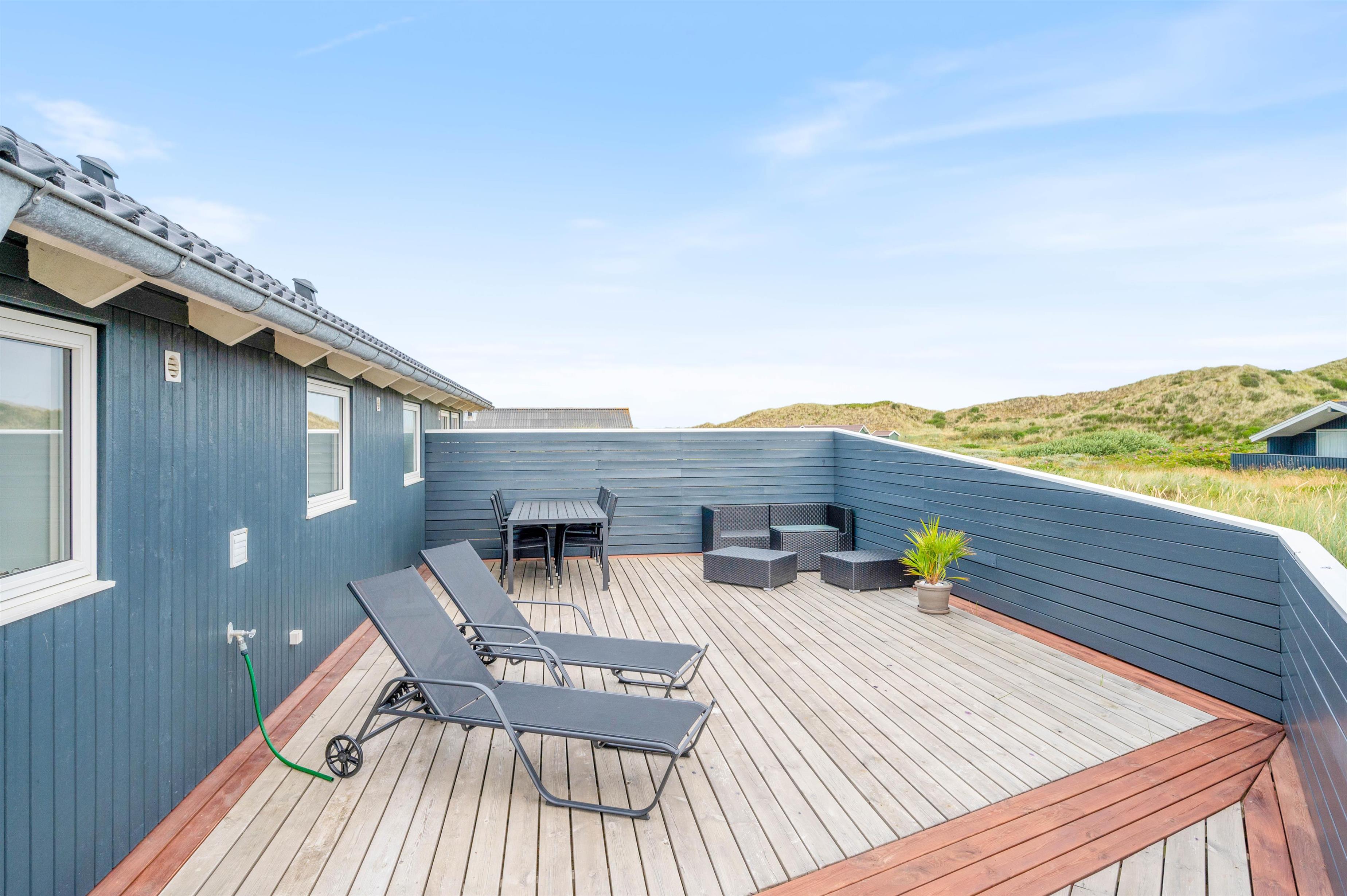 Feriehuset byder på en skøn lukket terrasse, som er ideel for familier med børn og hund. Fra terrassen, som går næsten hele vejen rundt om feriehuset, har I den mest fantastiske panoramaudsigt over klitlandskabet. Fra ferieadressen er der blot 250 meter til stranden, og fra terrassen kan havets brusen og den skønne friske duft tydeligt høres og fornemmes.