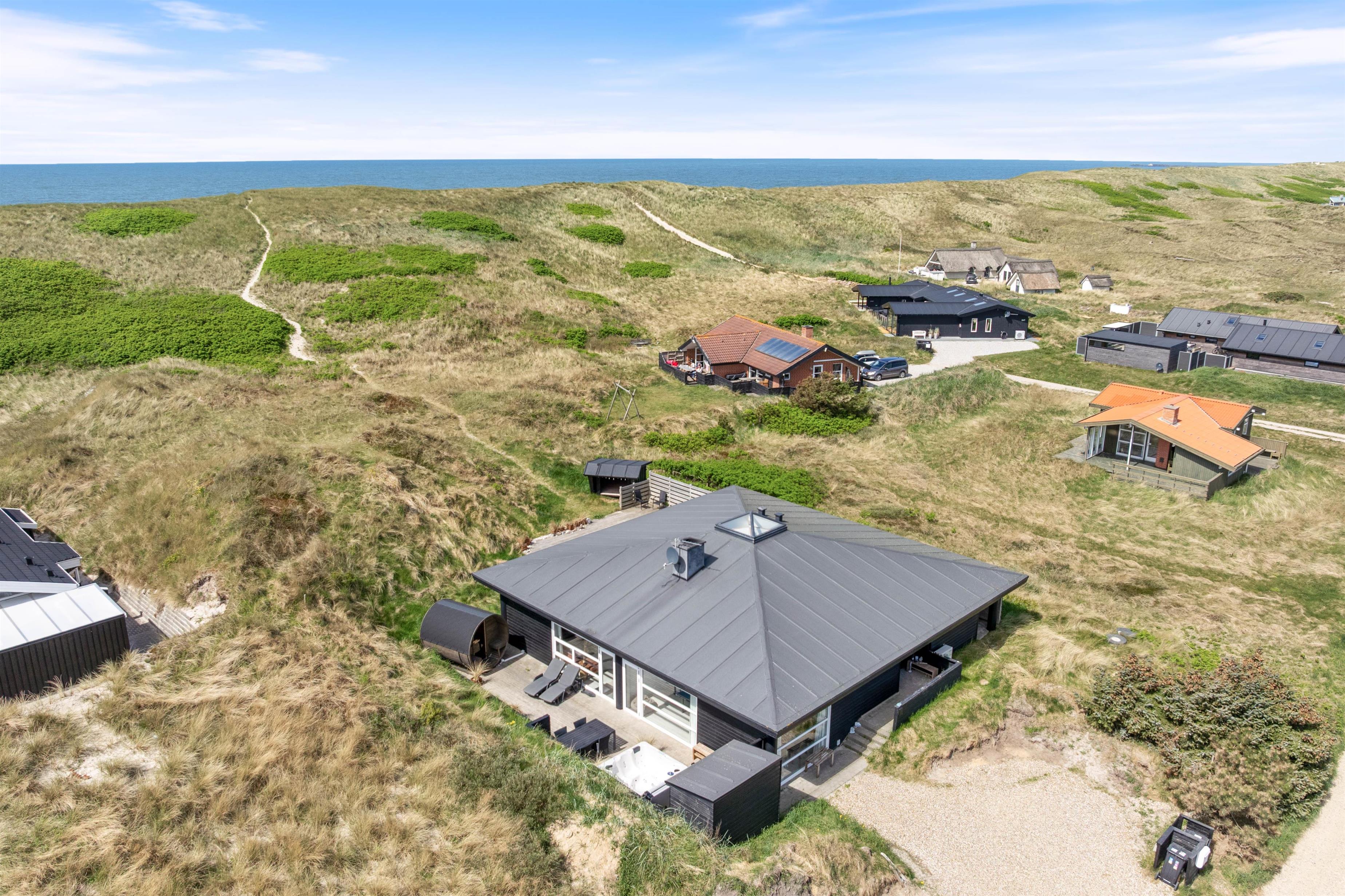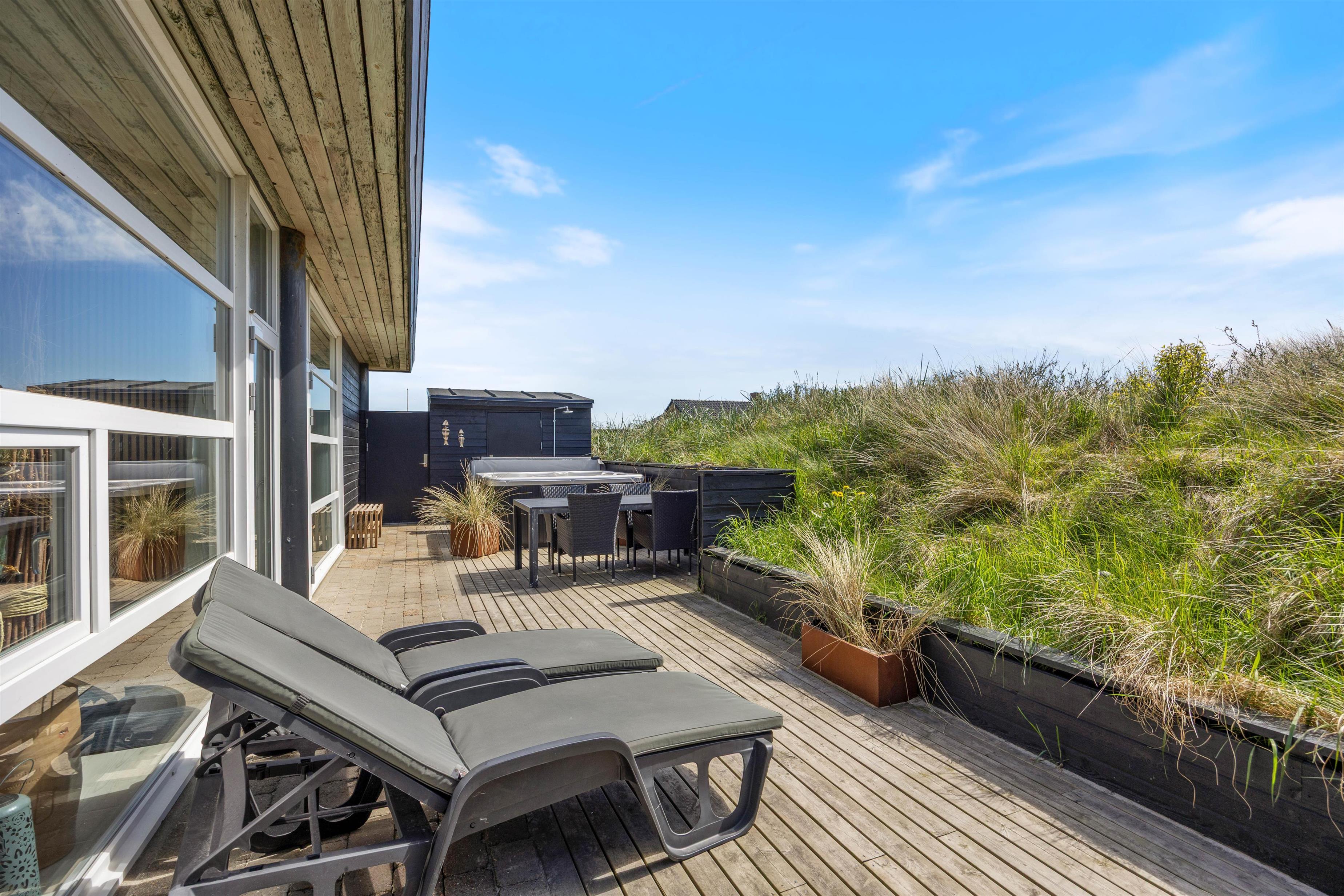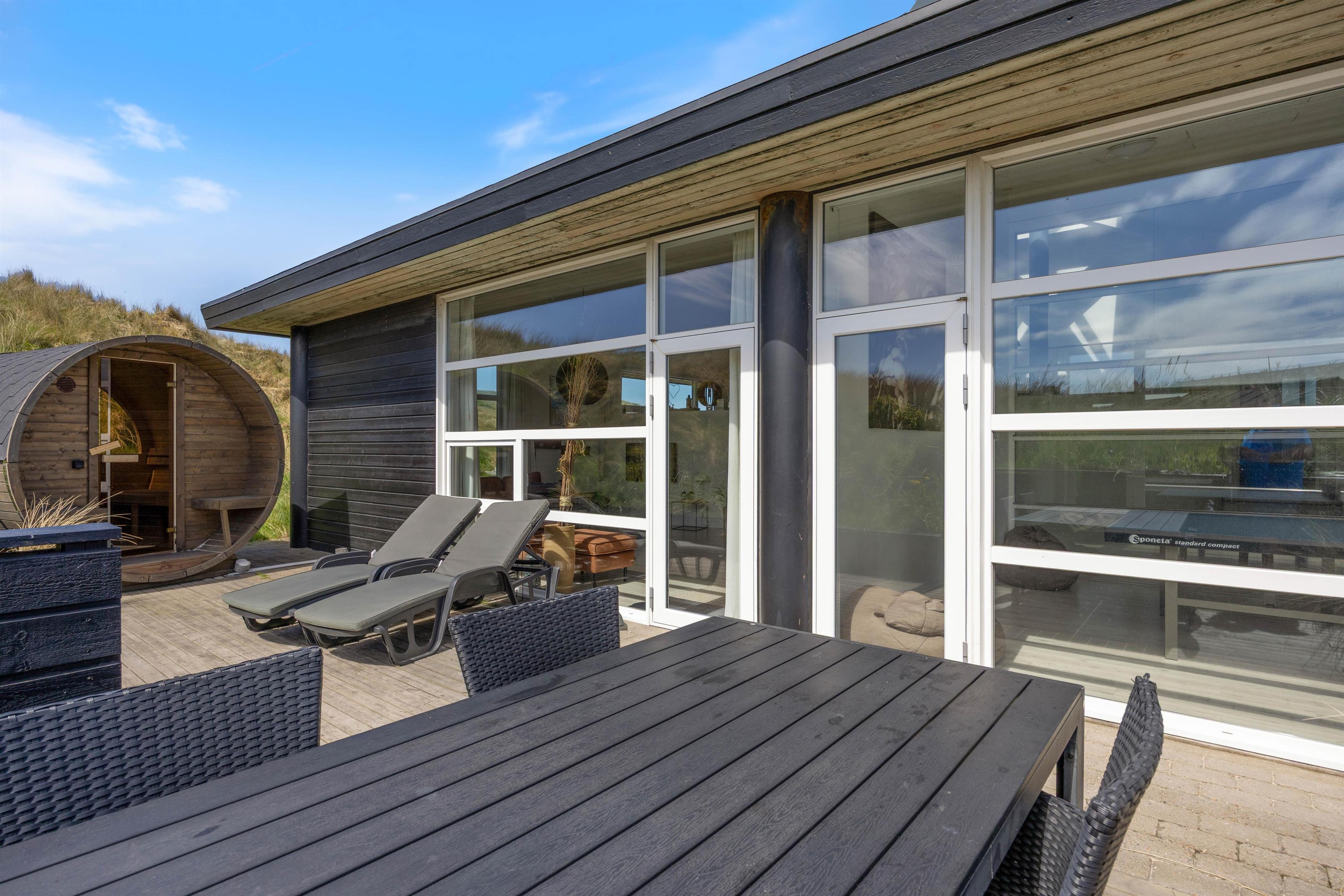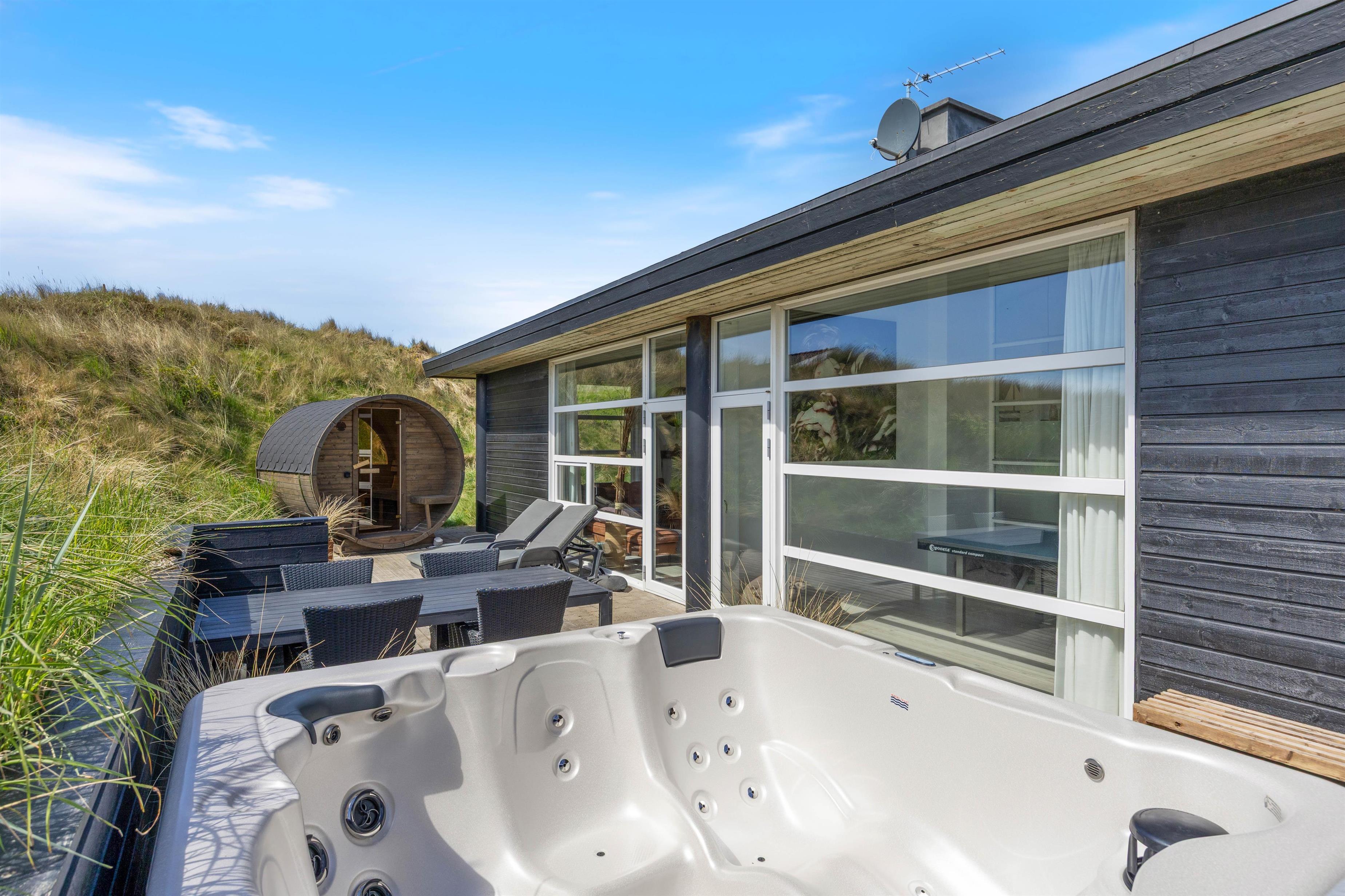 Rundt om huset er der gode terrasser, hvorfra det er muligt at grille eller bare at sidde ude og nyde solen samt læ fra den nærtliggende klit. Når I trænger til at komme helt ned i gear, kan I sætte jer ned i spaen og nyde den skønne vesterhavsluft.