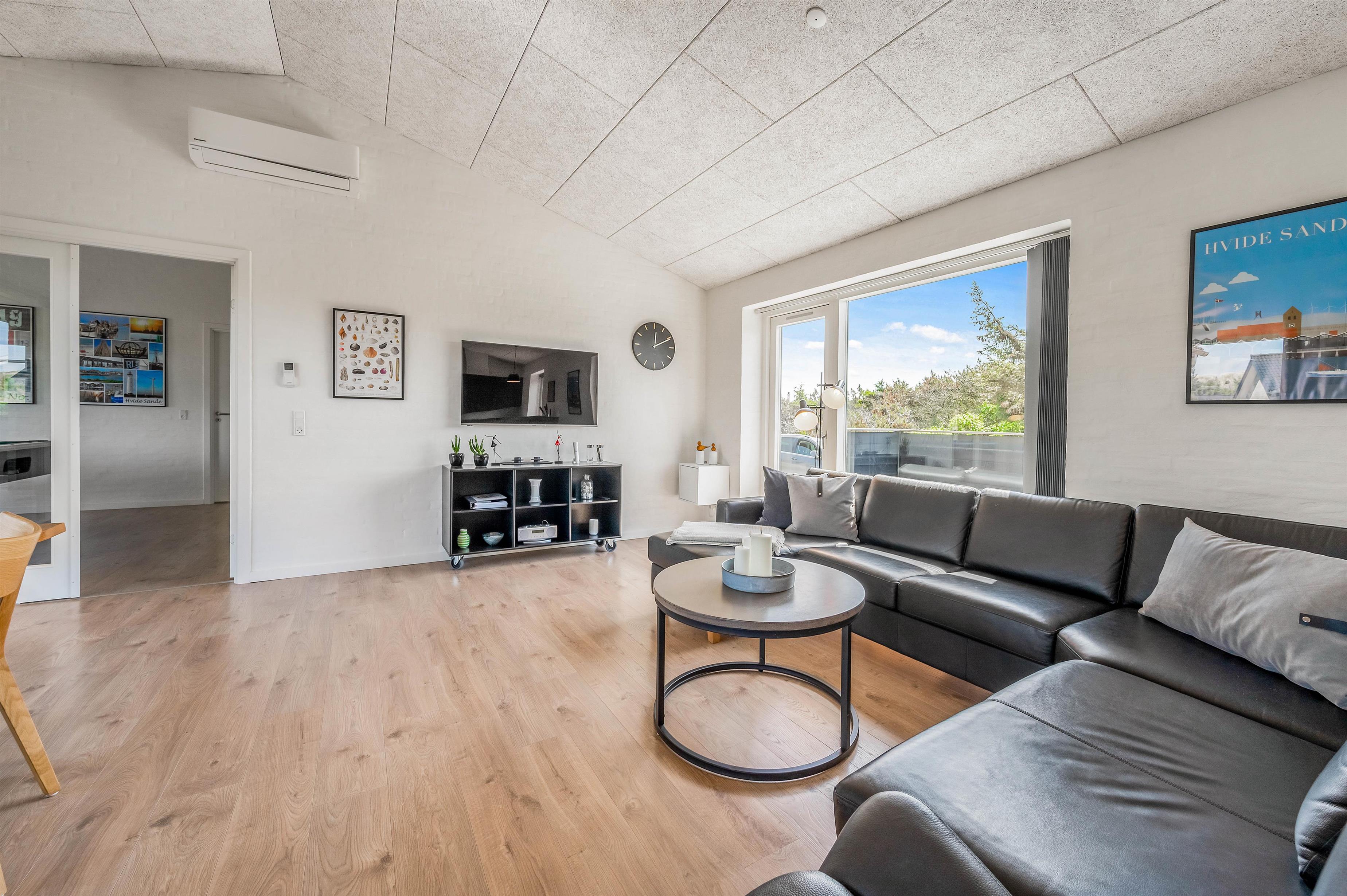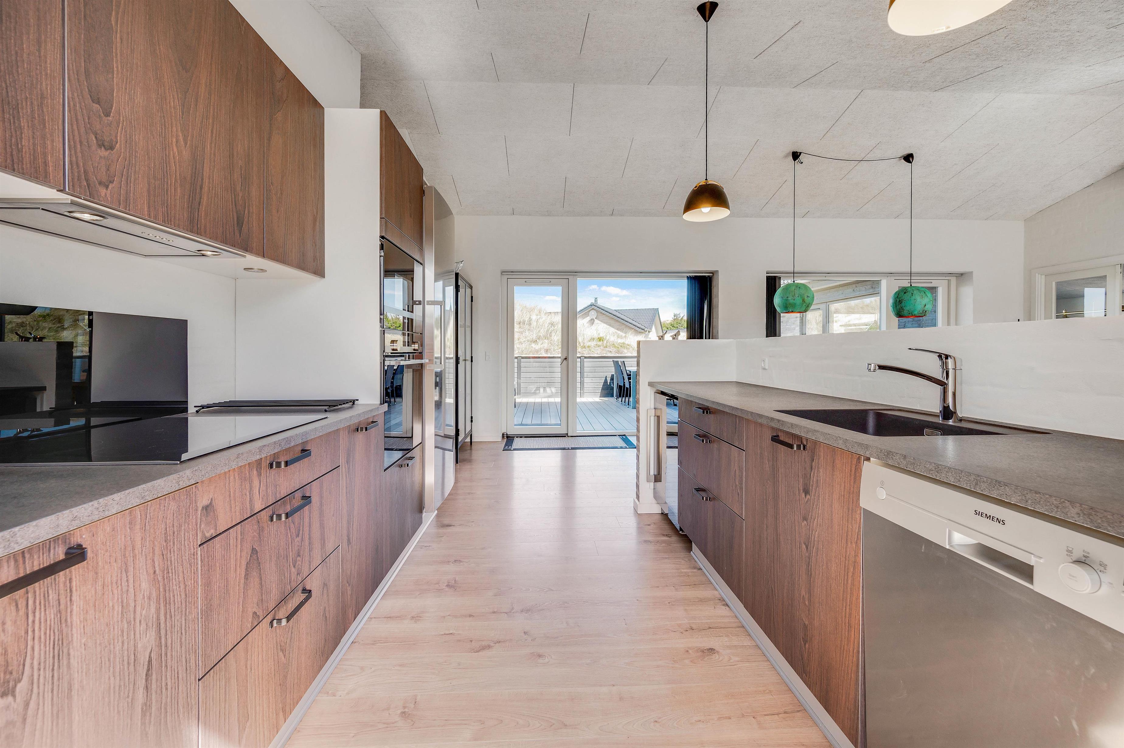 Hjertet i huset er det flotte opholdsrum med stue, spiseplads og køkken. – Køkkenafdelingen er veludrustet og har alt, hvad der skal til for at gøre husarbejdet let for jer under ferien. Fra spisepladsen har I et godt view udover sommerhusområdet og det flotte klitlandskab.