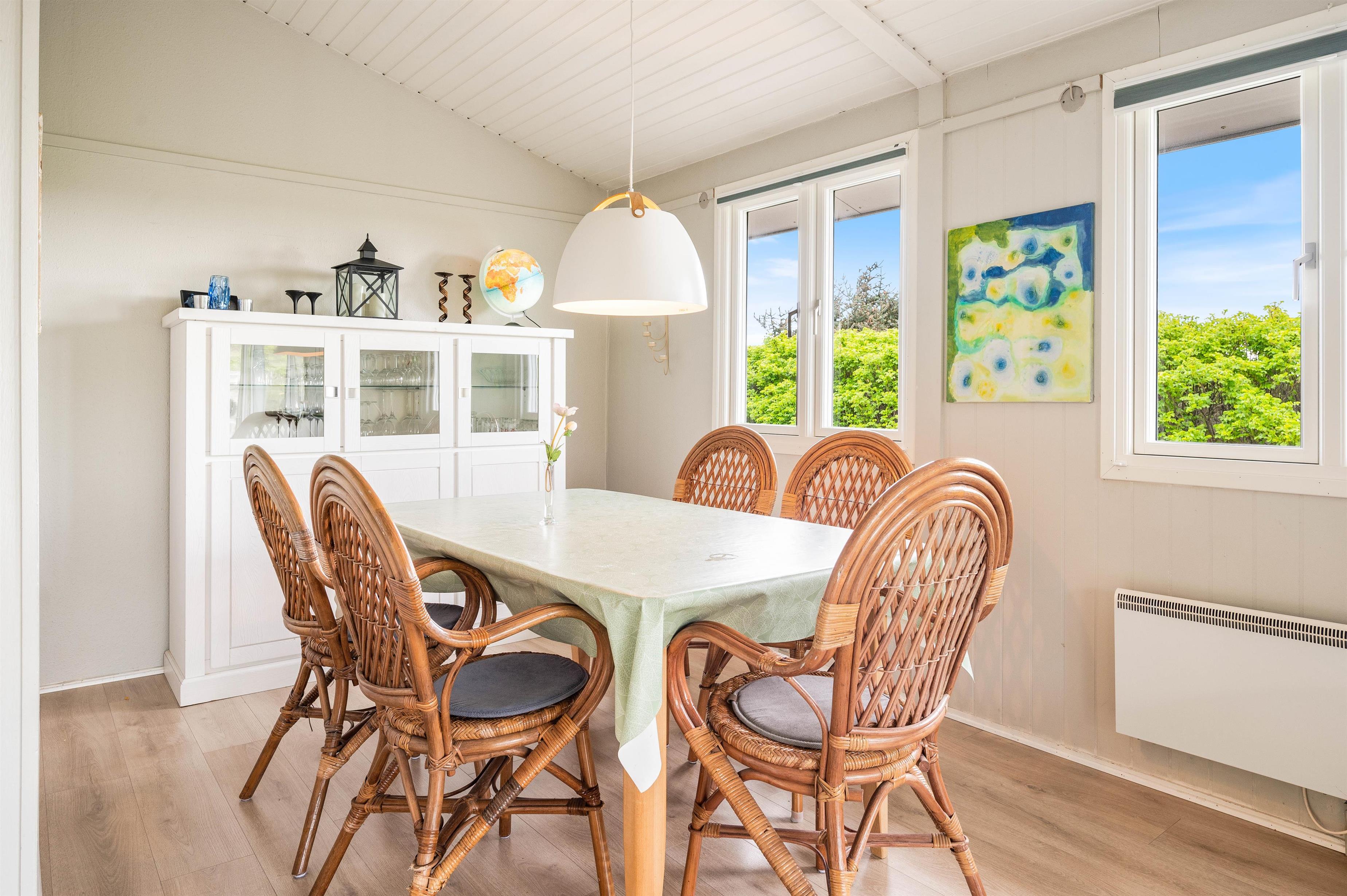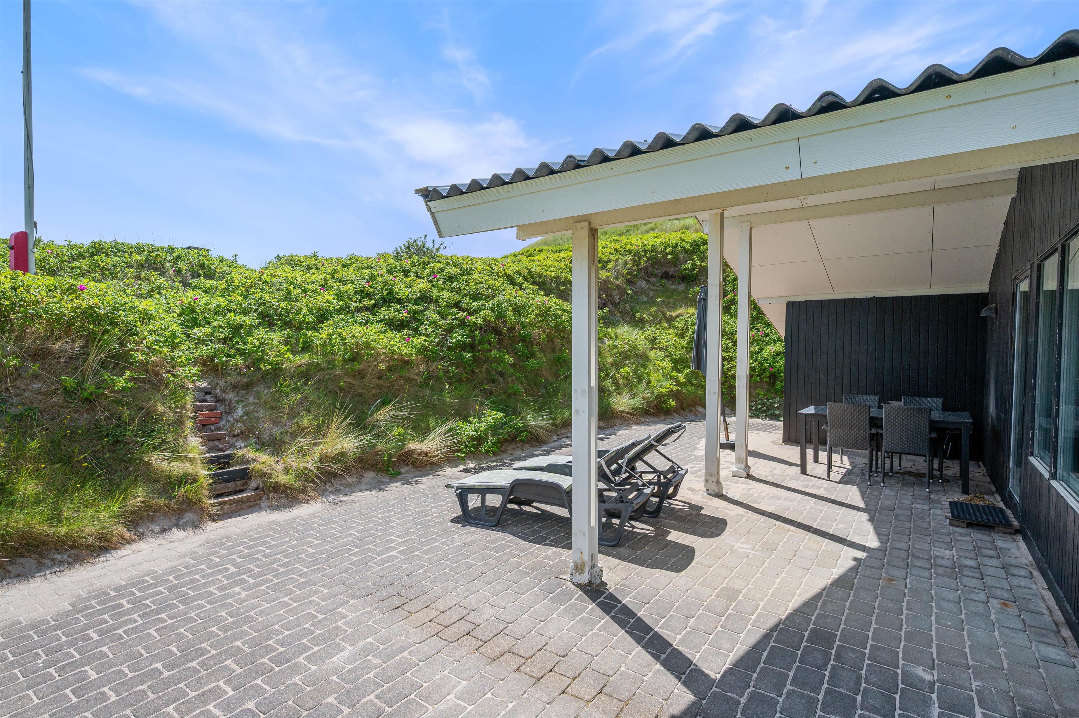 Når vejret byder op til det, kan I sætte jer ud på den afskærmede og delvist overdækkede terrasse, hvor I kan høre lydende fra det brusende Vesterhav, som kun ligger 50 meter væk. På terrassen er der plads til afslapning i de dejlige havemøbler, hvor I kan nyde den skønne panoramaudsigt ud mod Ringkøbing Fjord. Når sulten melder sig, kan I grille en lækker middag på sommerhusets grill.