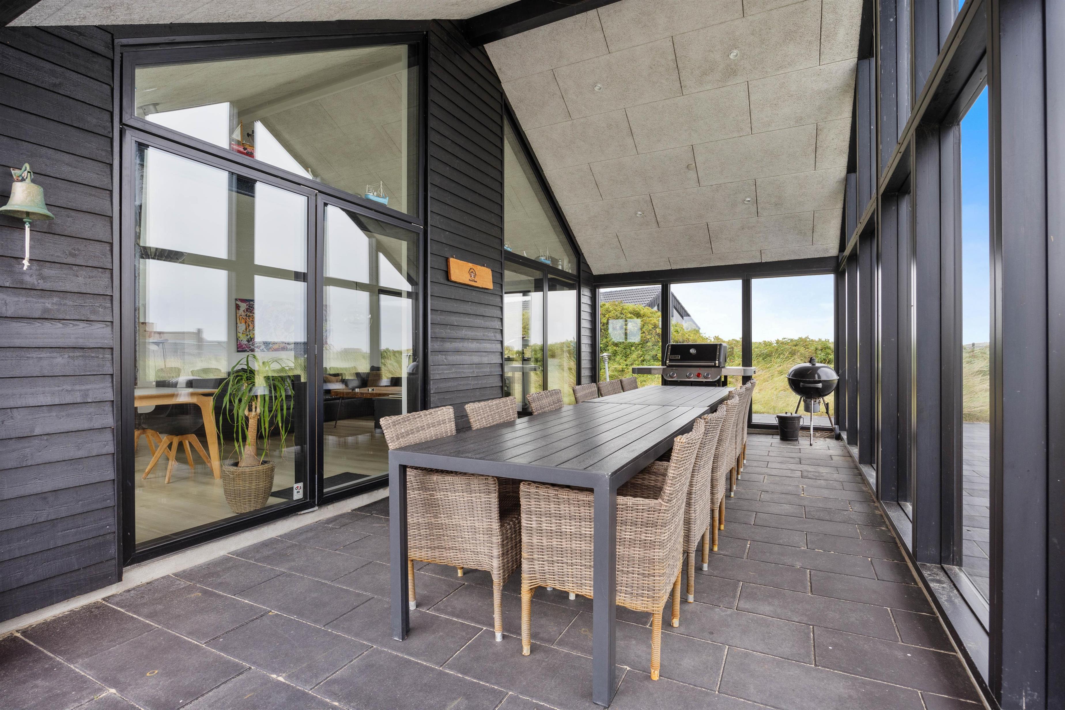 På Strandkrogvejen 38 finder du et lækkert og særdeles indbydende kvalitetshus beliggende på en kuperet klitgrund i Årgab. Herfra har du en skøn panoramaudsigt fra både stuen og den skønne overdækkede terrasse mod øst. Derudover er der terrasse hele vejen omkring feriehuset, så der kan altid findes et sted at opholde sig, uafhængig af sol og vind.