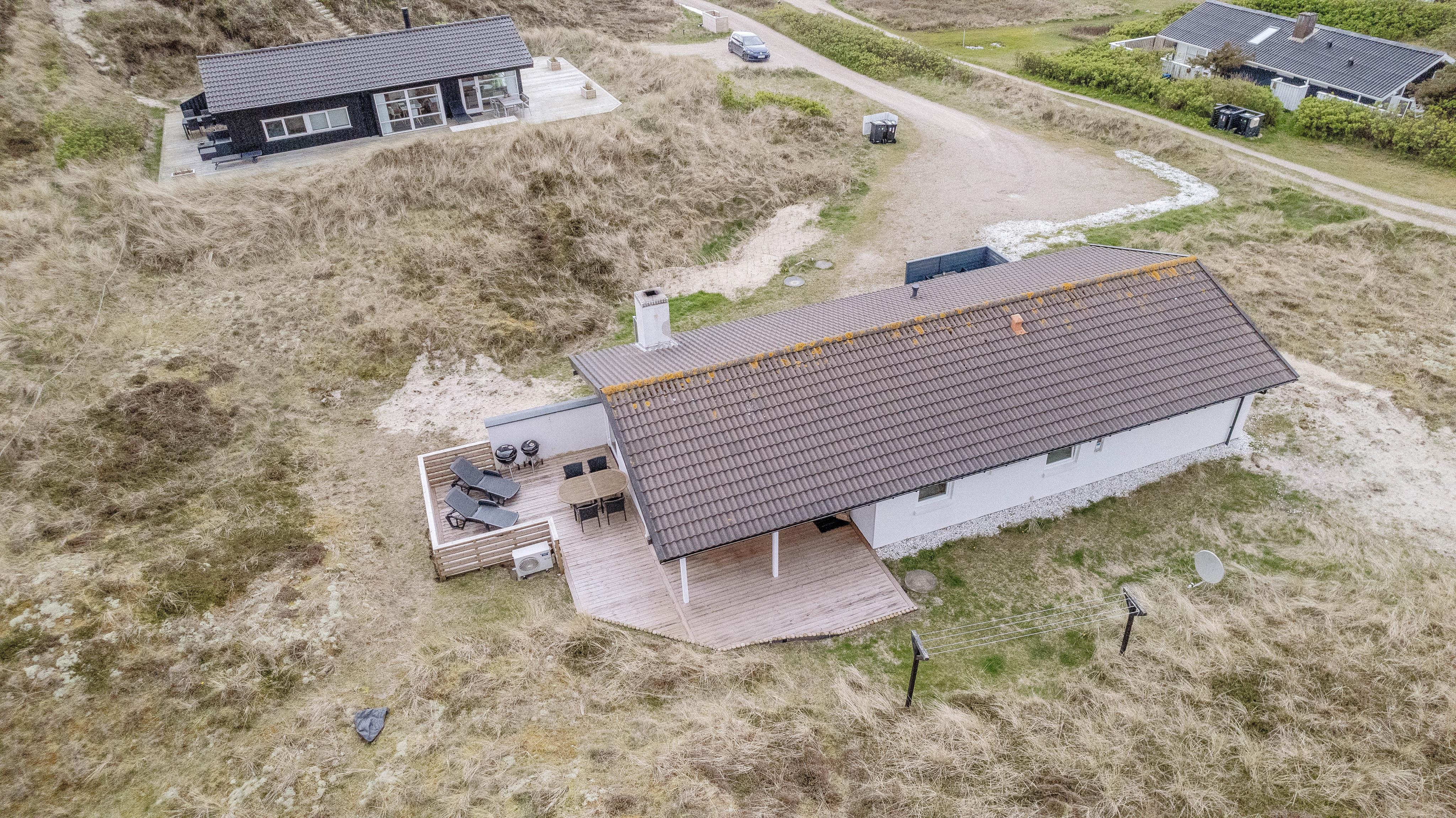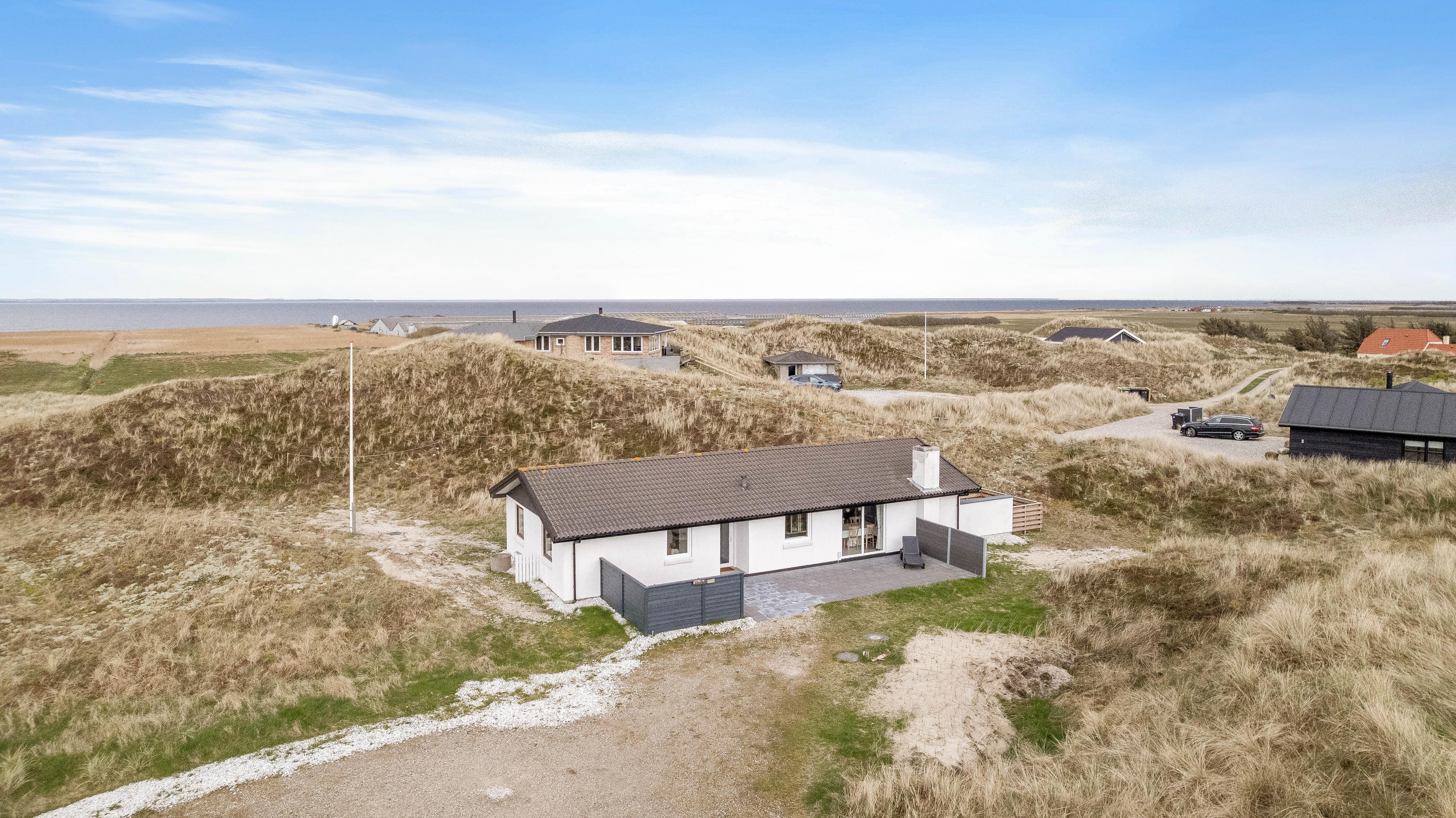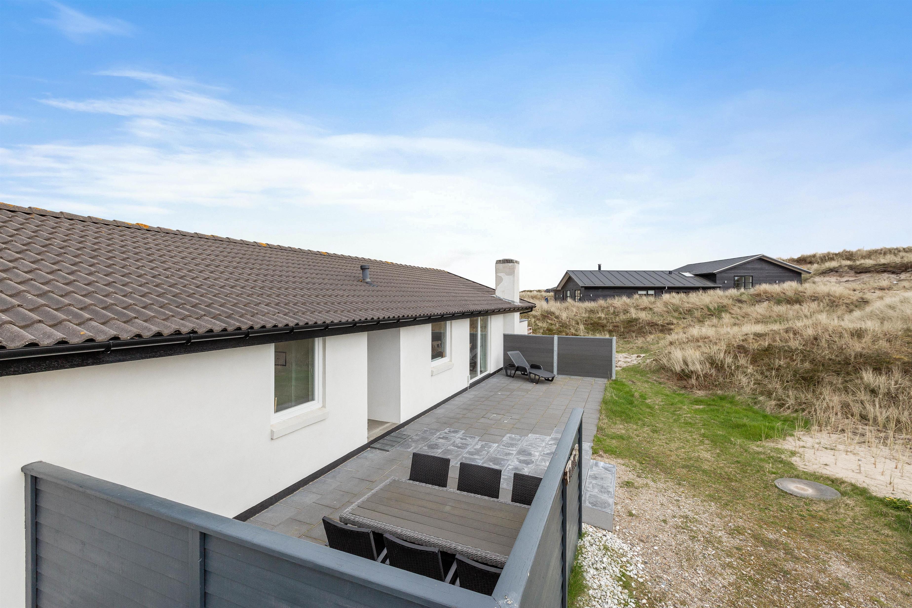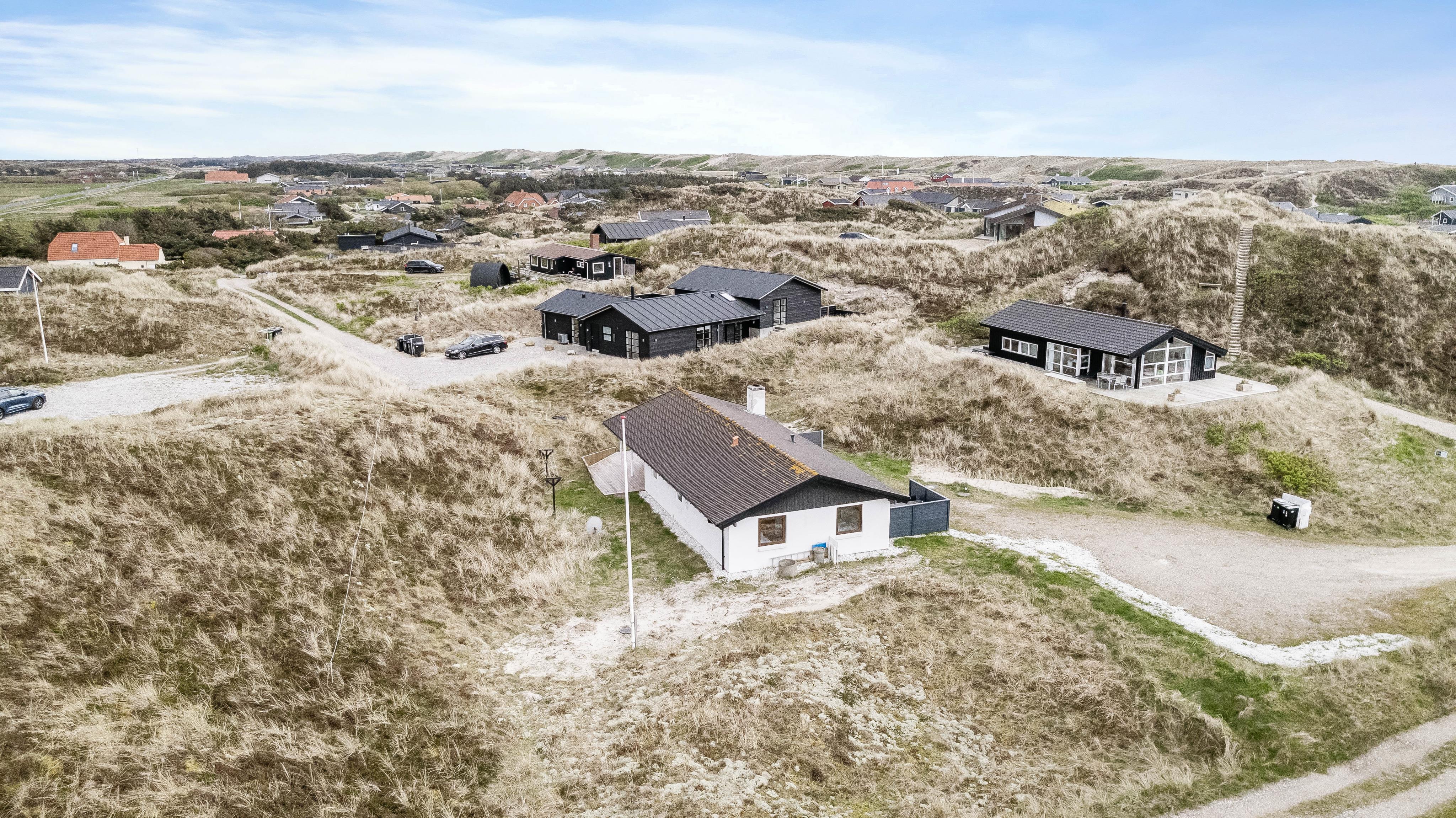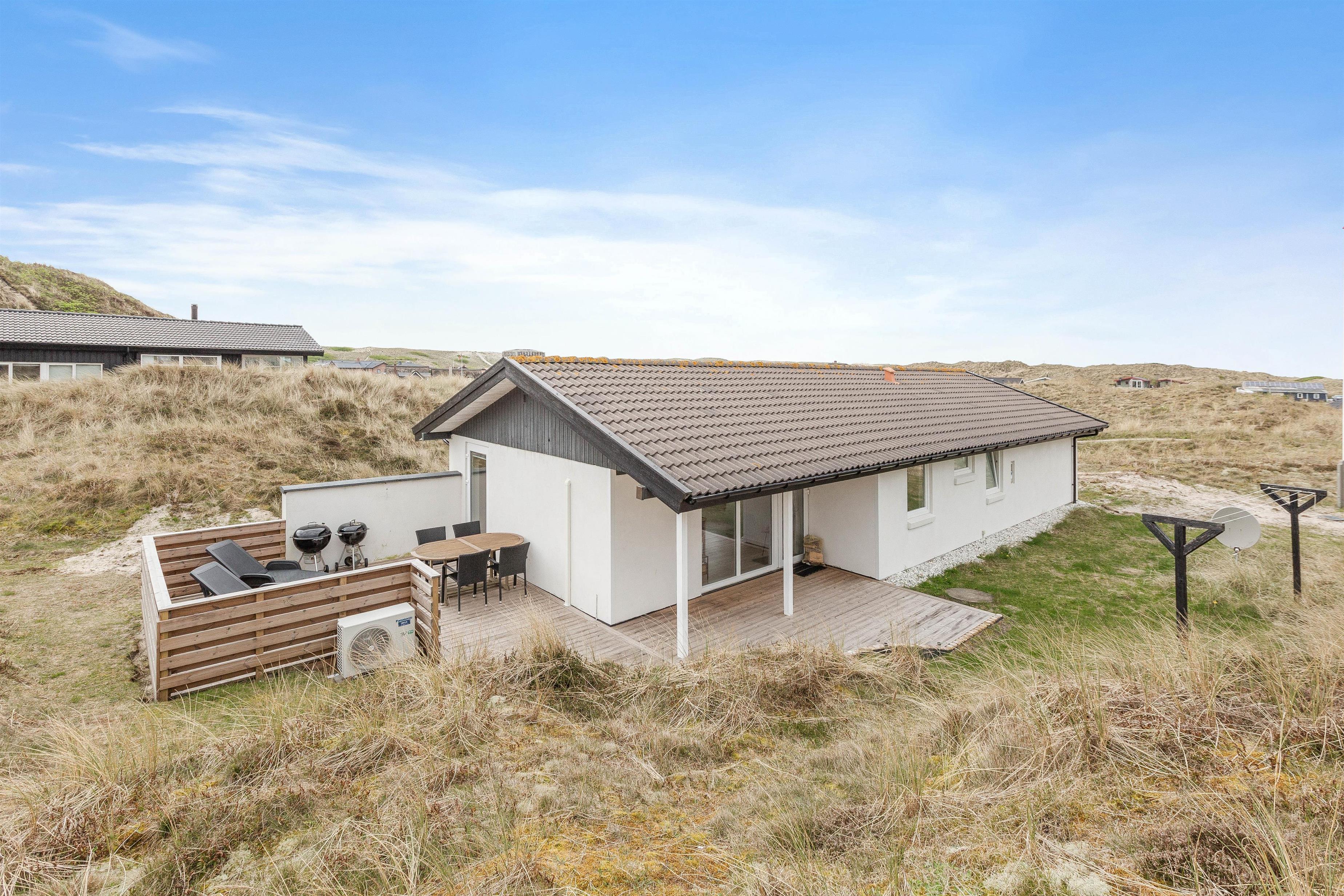 Huset er beliggende for enden af en stikvej, på en kuperet klitgrund i Årgab. Fra den vestvendte terrasse er der en smuk udsigt over landskabet og til klitterne. Mod syd og øst er terrasserne helt afskærmede, så du uforstyrret kan nyde freden og roen. Terrasserne er udstyret med havemøbler, liggestole og grill.