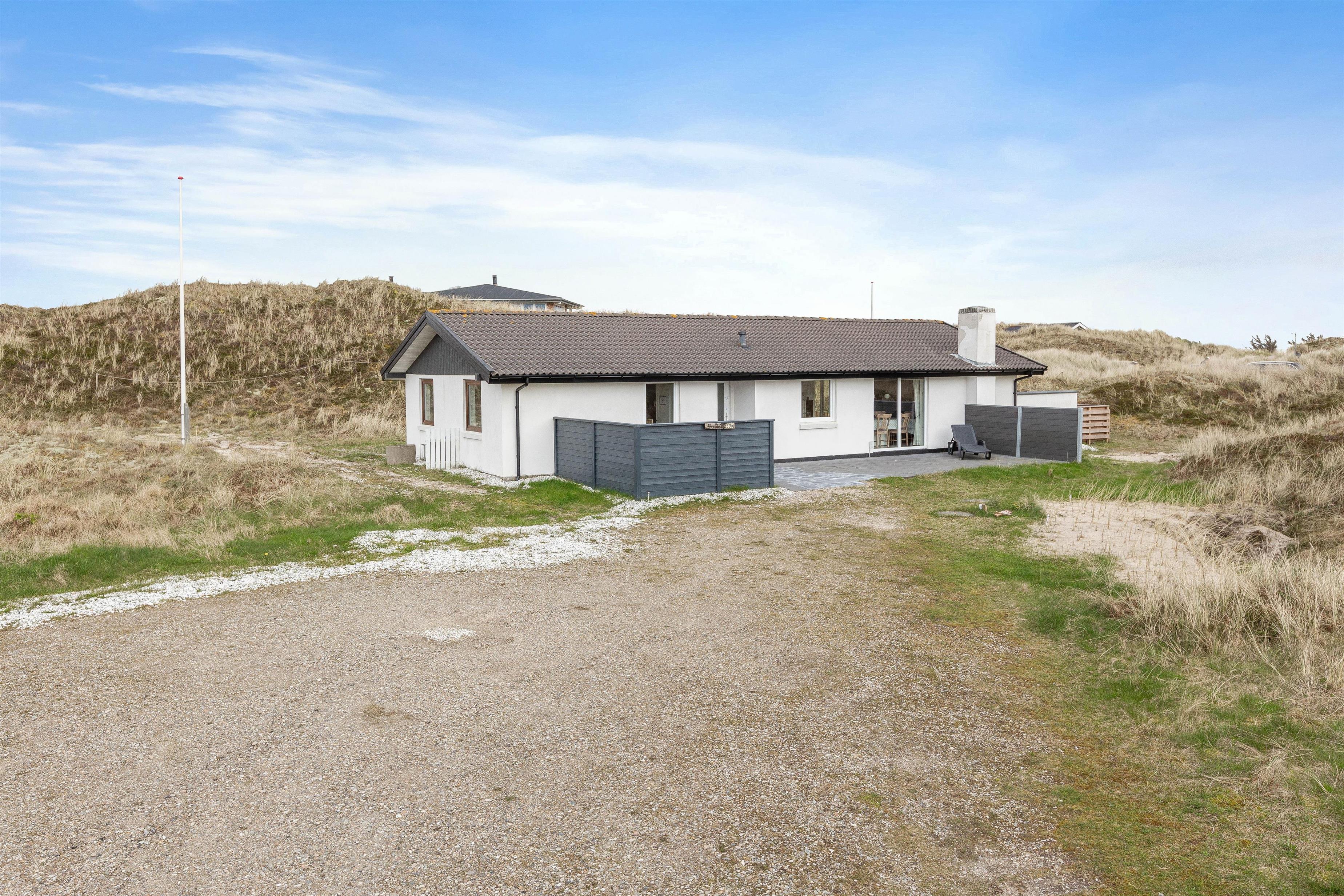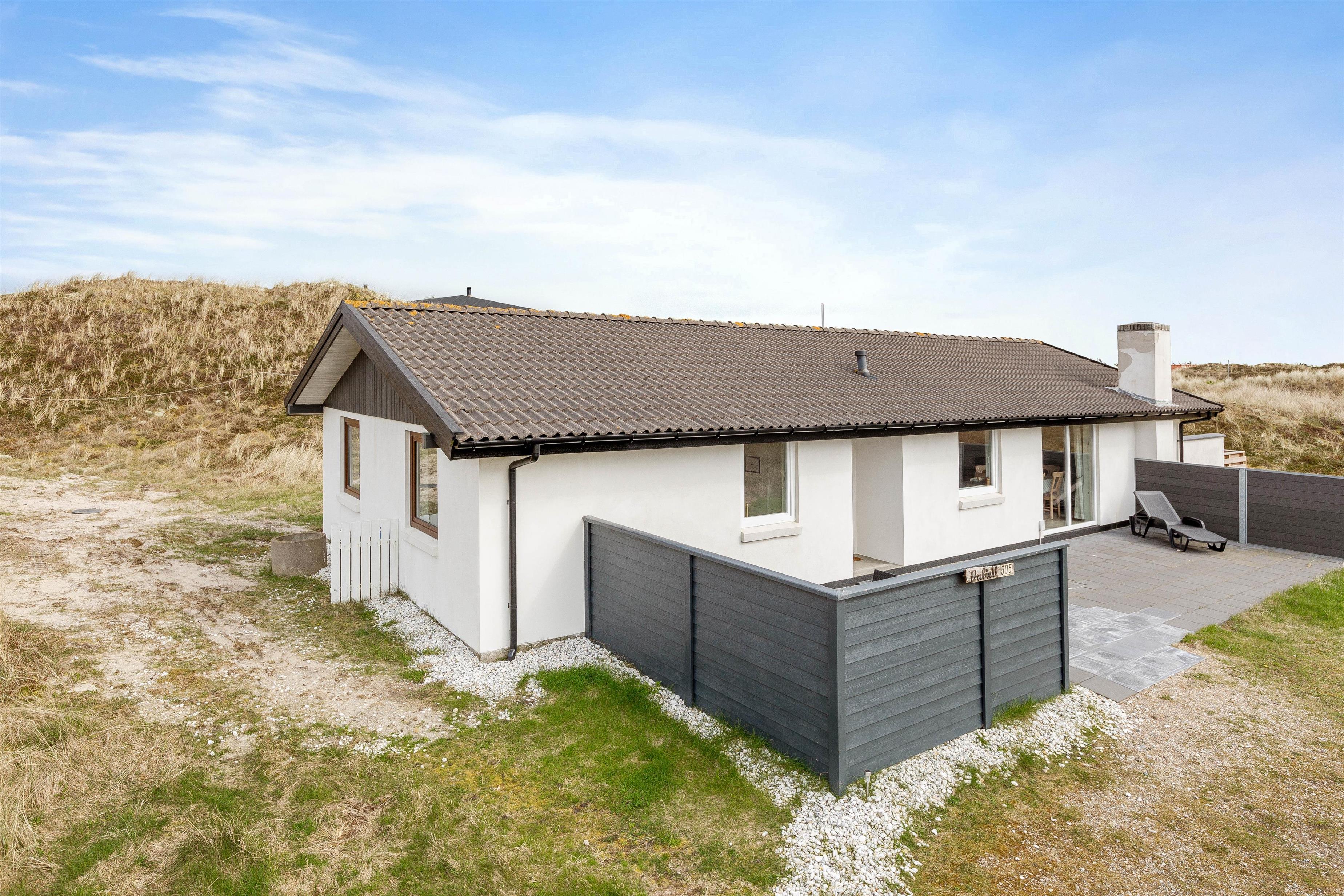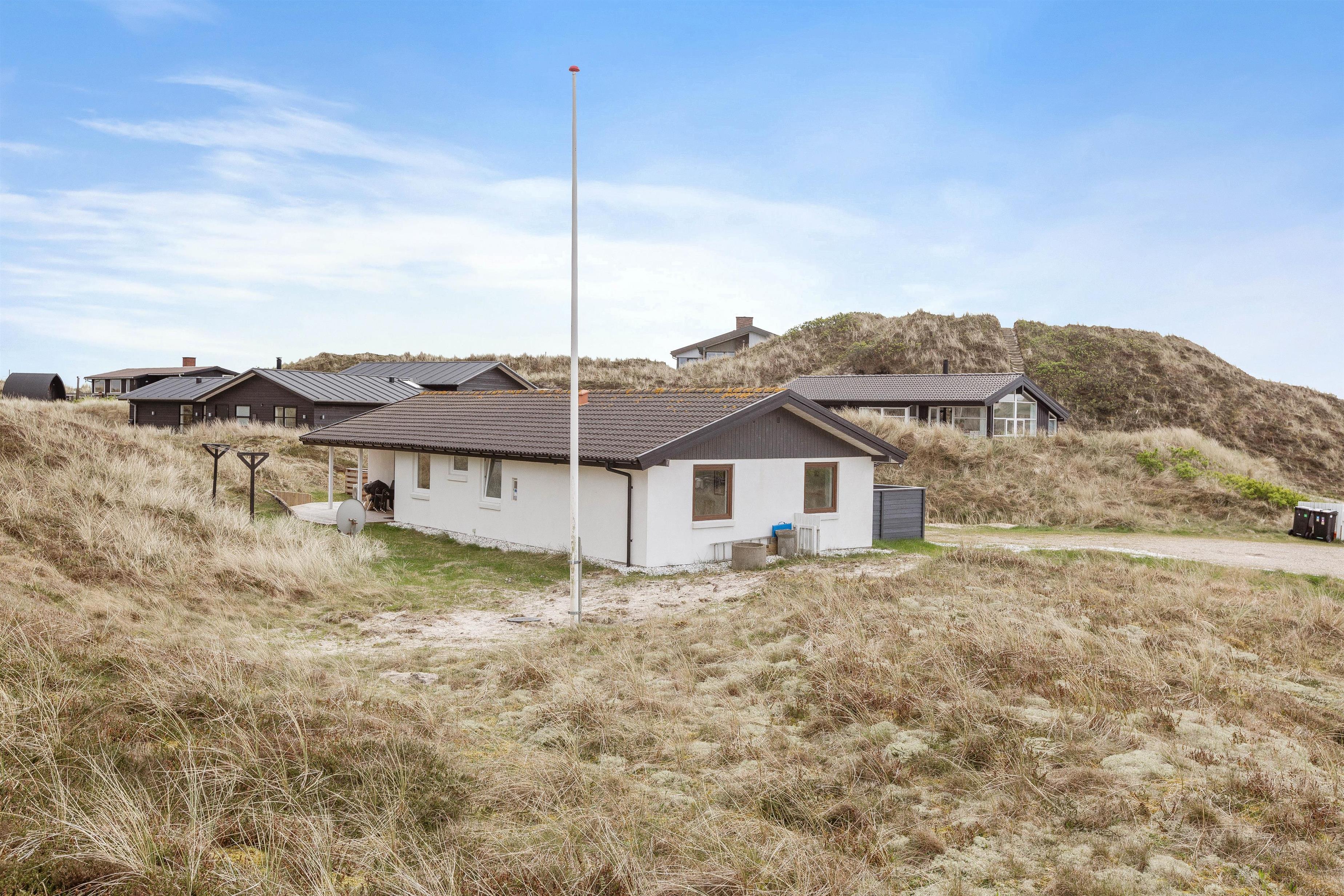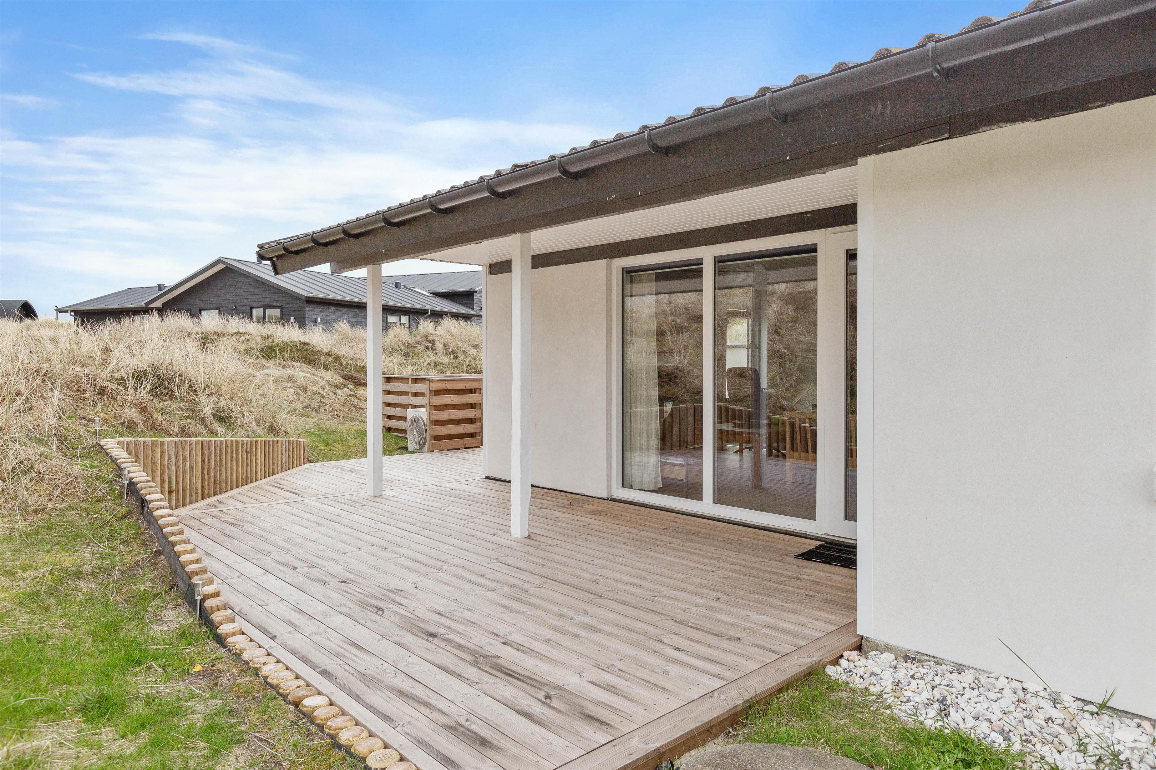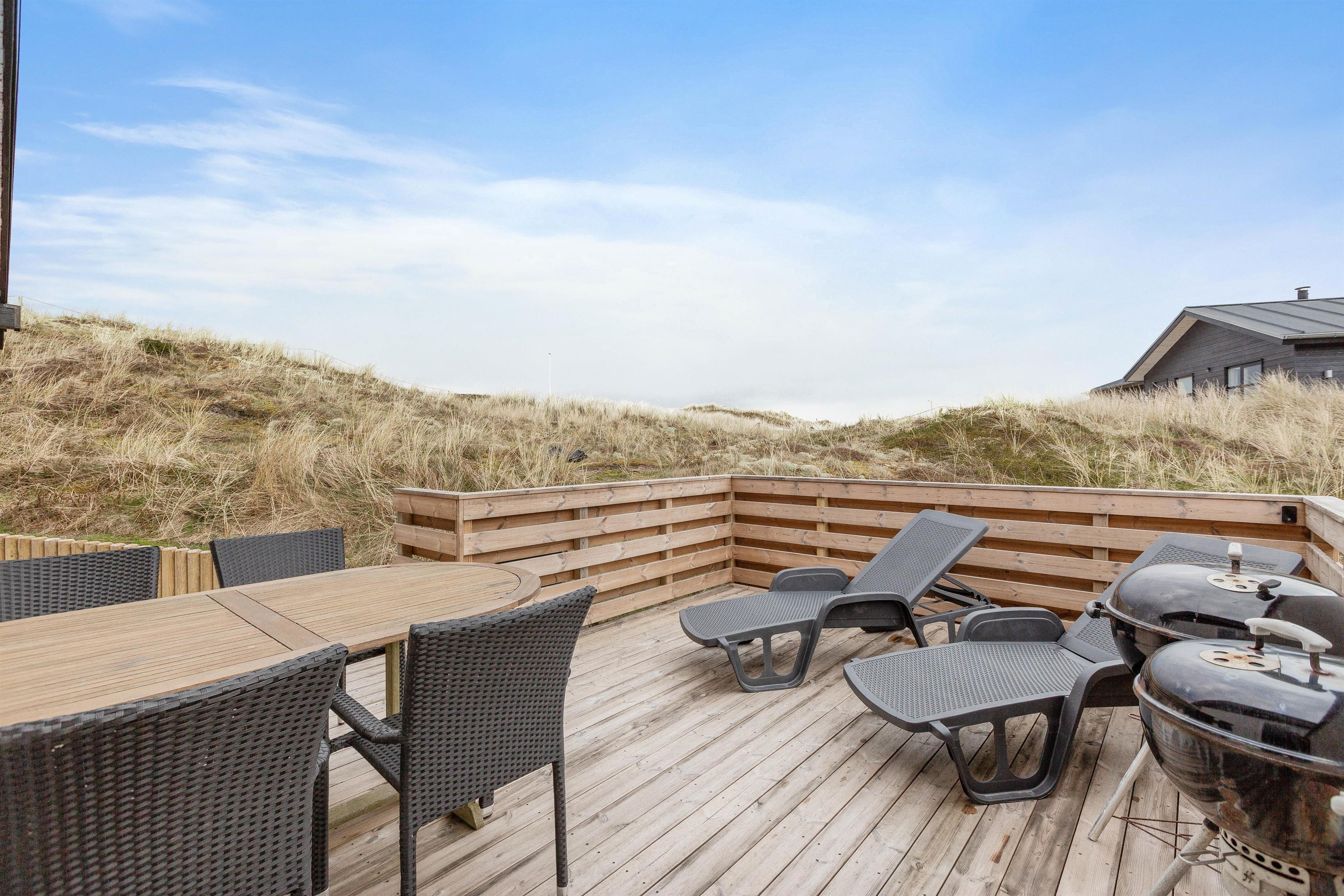 Huset er beliggende for enden af en stikvej, på en kuperet klitgrund i Årgab. Fra den vestvendte terrasse er der en smuk udsigt over landskabet og til klitterne. Mod syd og øst er terrasserne helt afskærmede, så du uforstyrret kan nyde freden og roen. Terrasserne er udstyret med havemøbler, liggestole og grill.