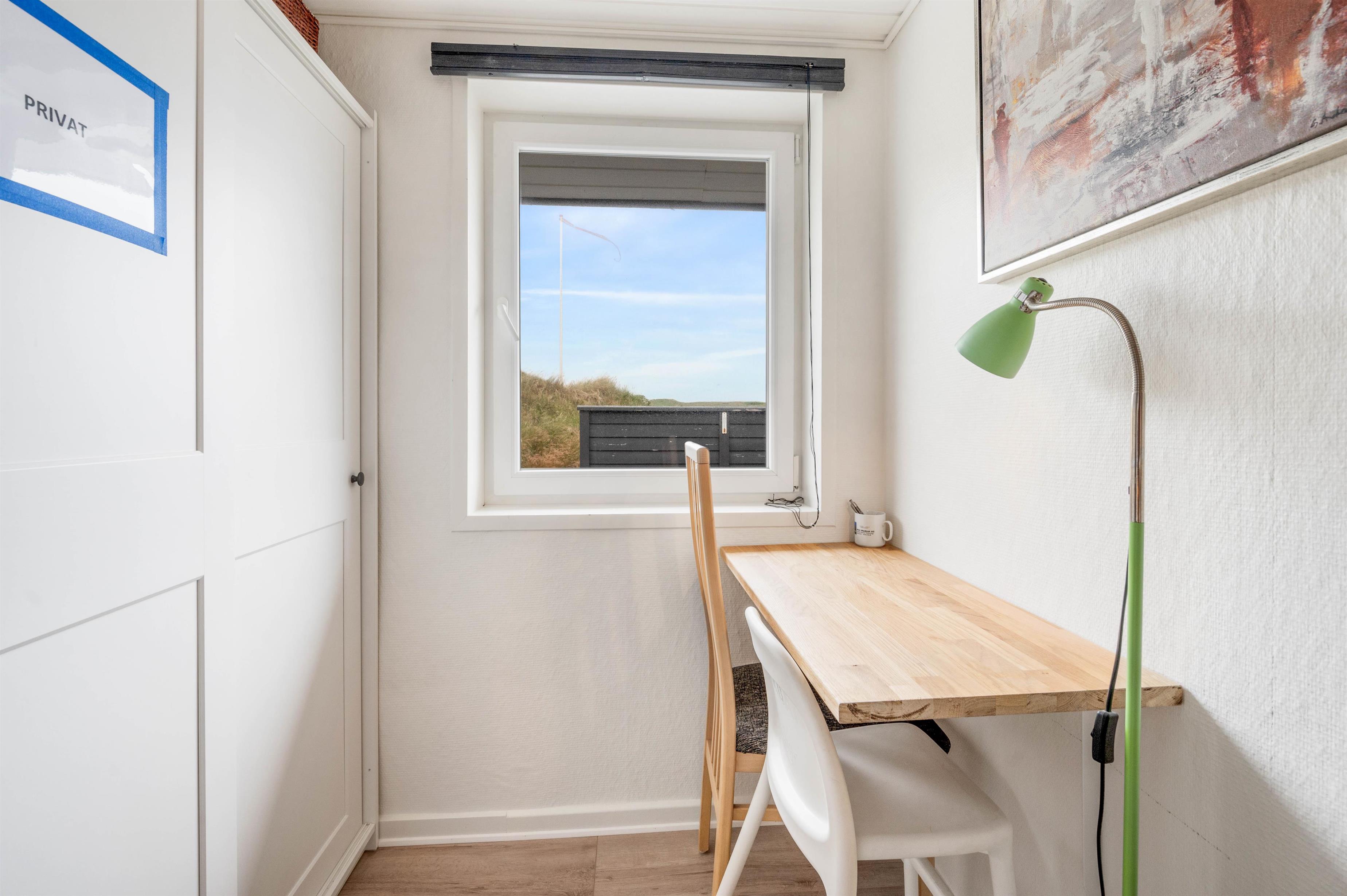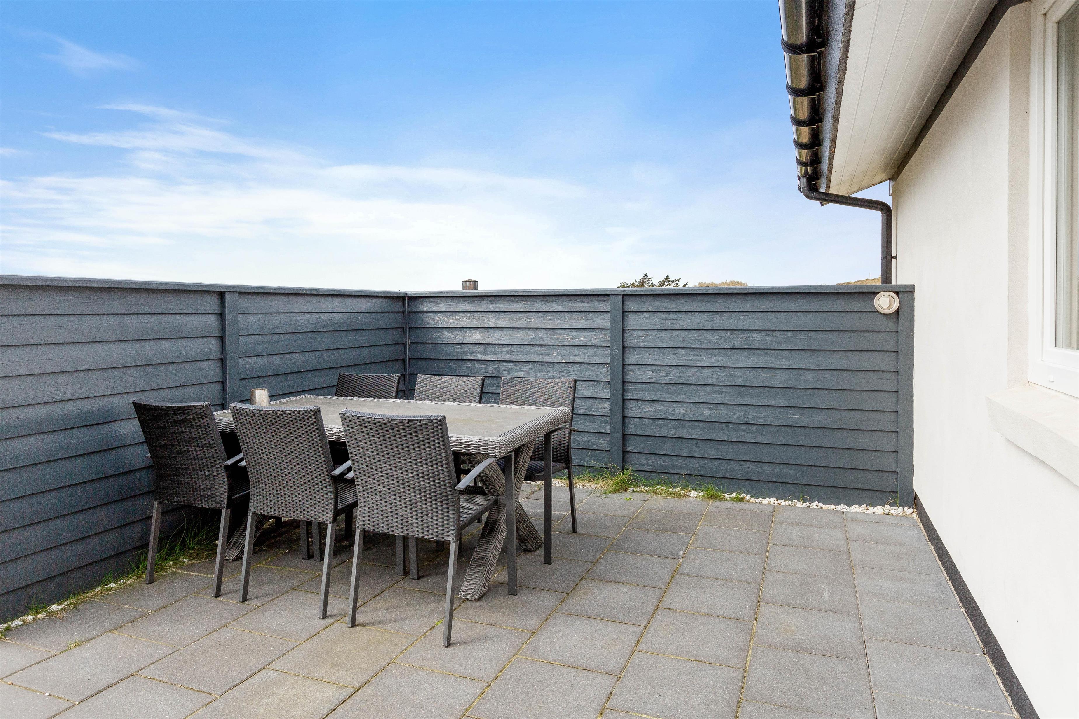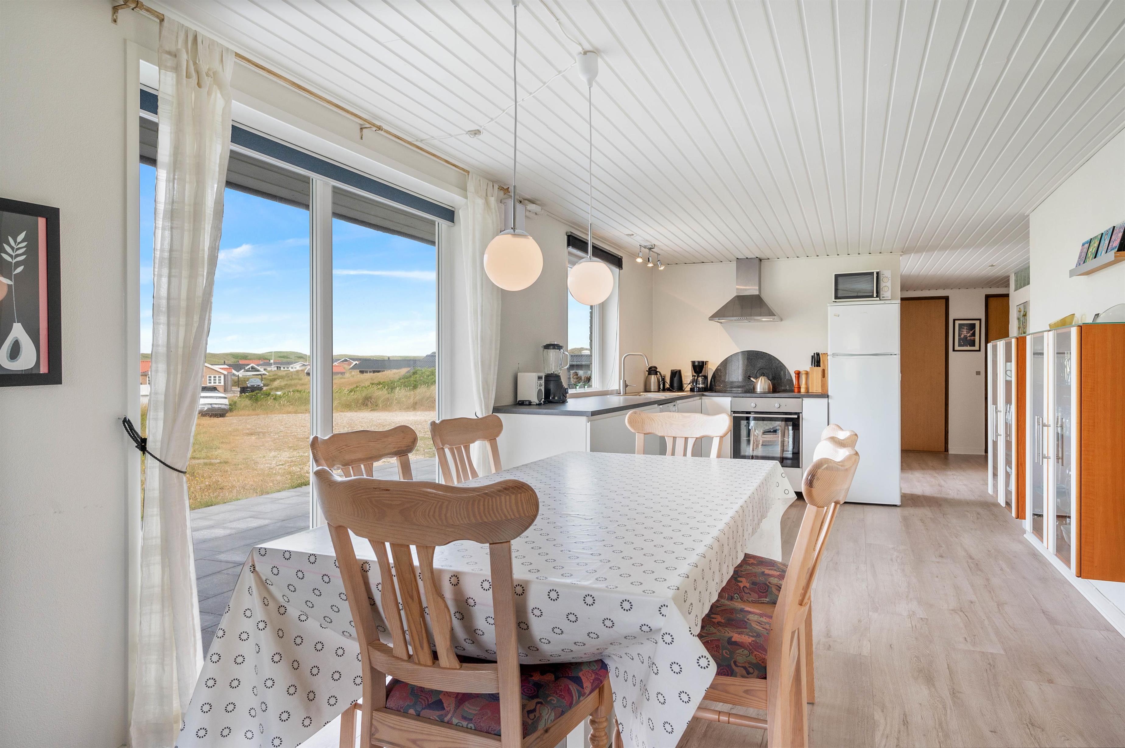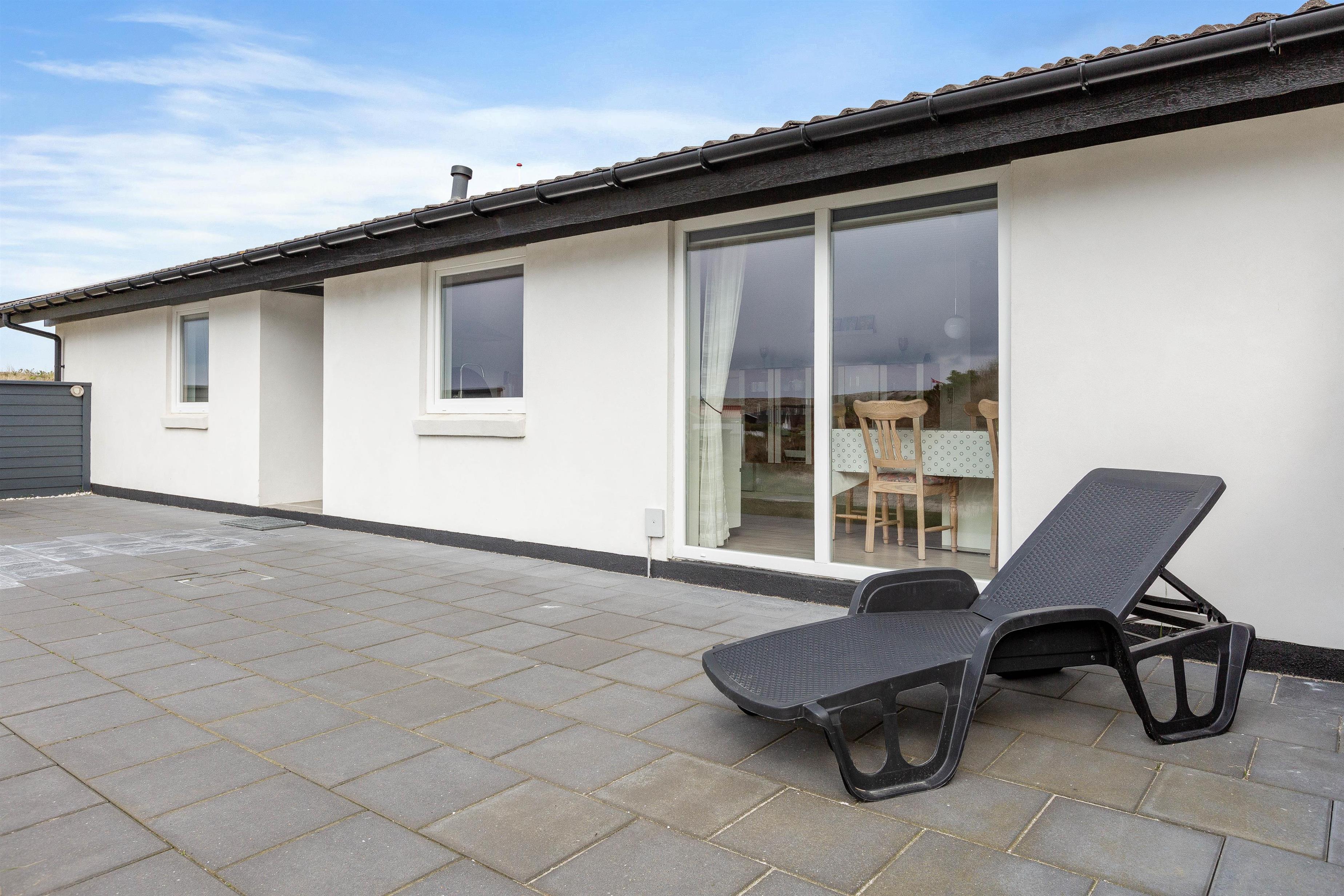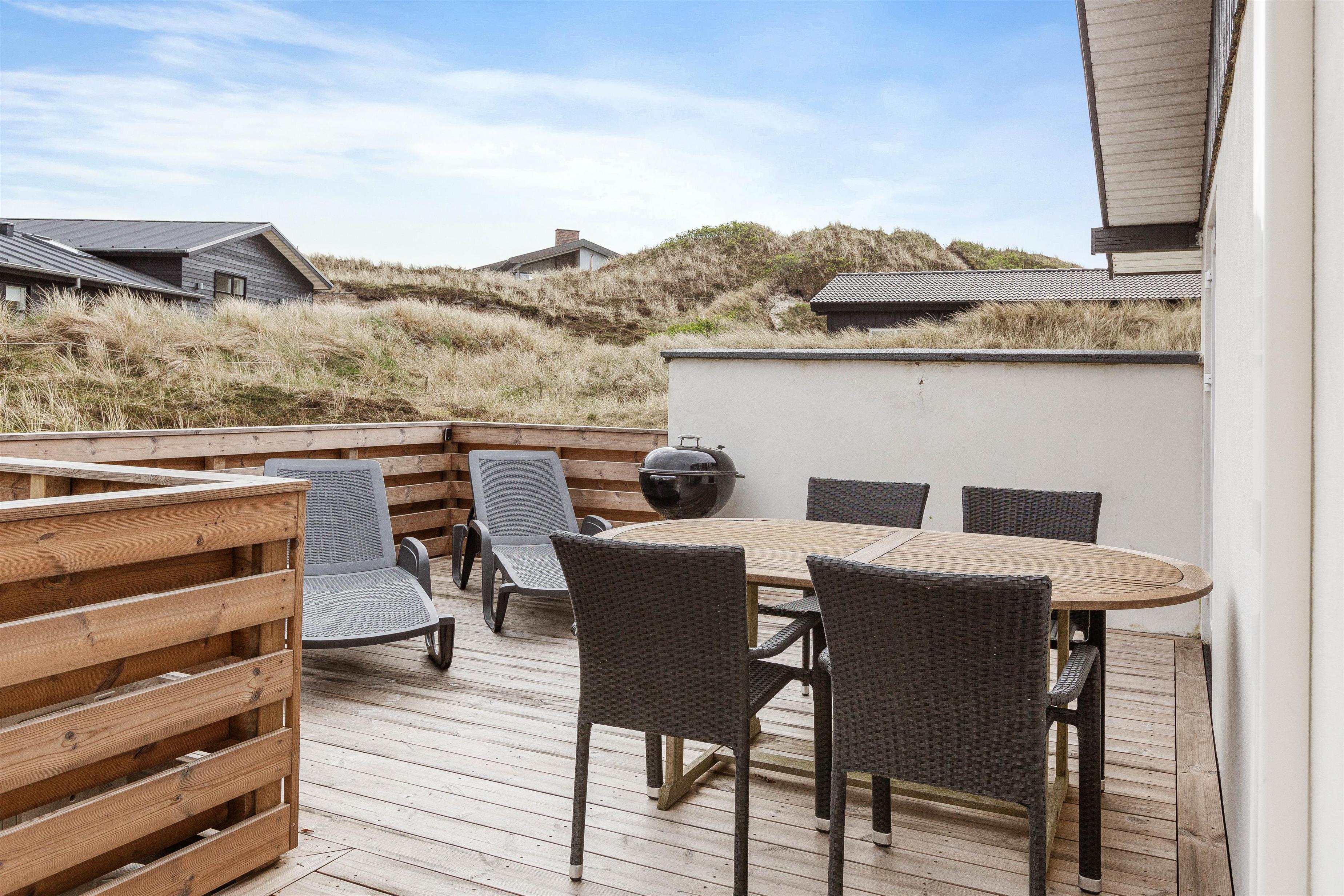 Huset er beliggende for enden af en stikvej, på en kuperet klitgrund i Årgab. Fra den vestvendte terrasse er der en smuk udsigt over landskabet og til klitterne. Mod syd og øst er terrasserne helt afskærmede, så du uforstyrret kan nyde freden og roen. Terrasserne er udstyret med havemøbler, liggestole og grill.