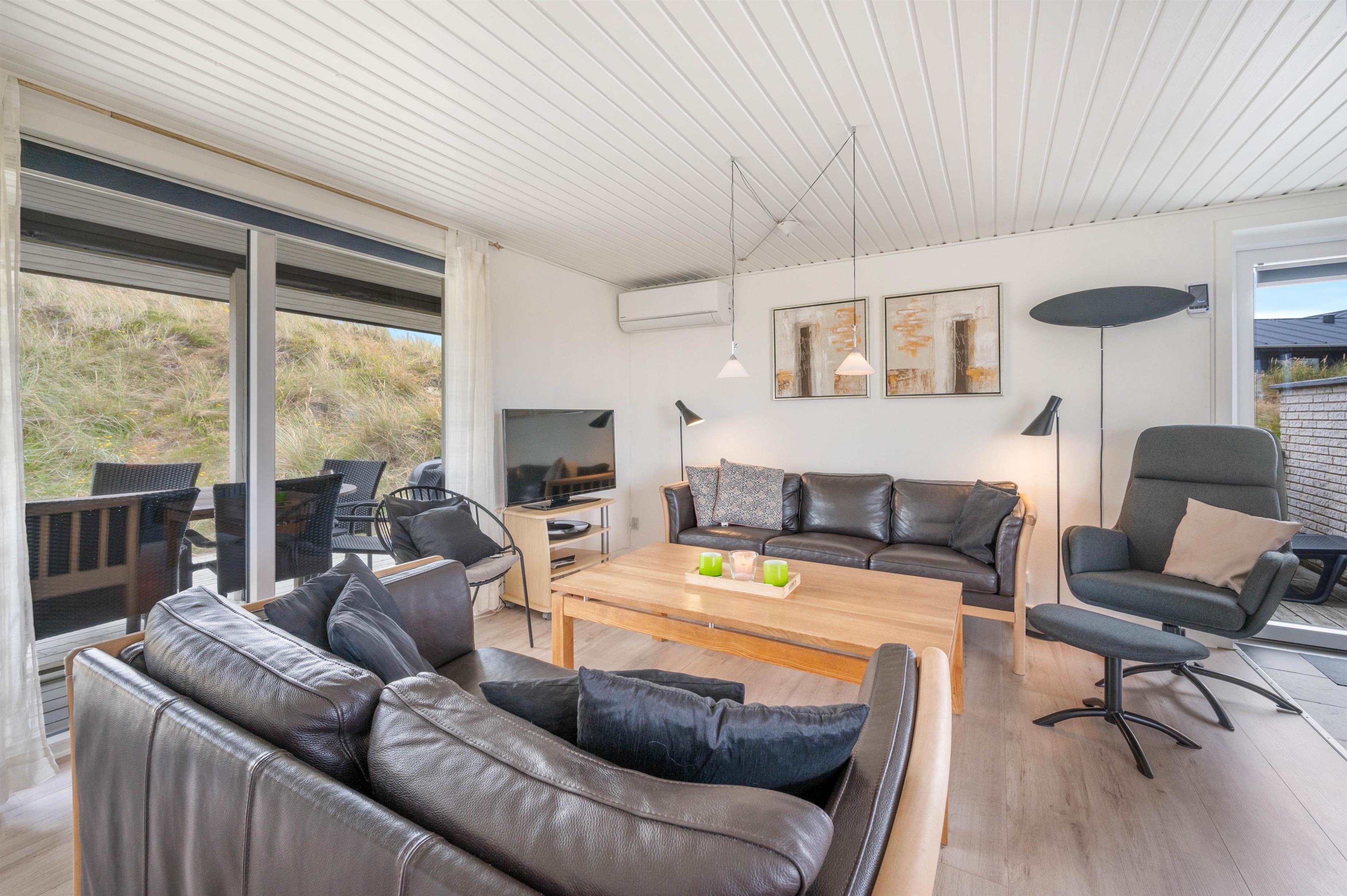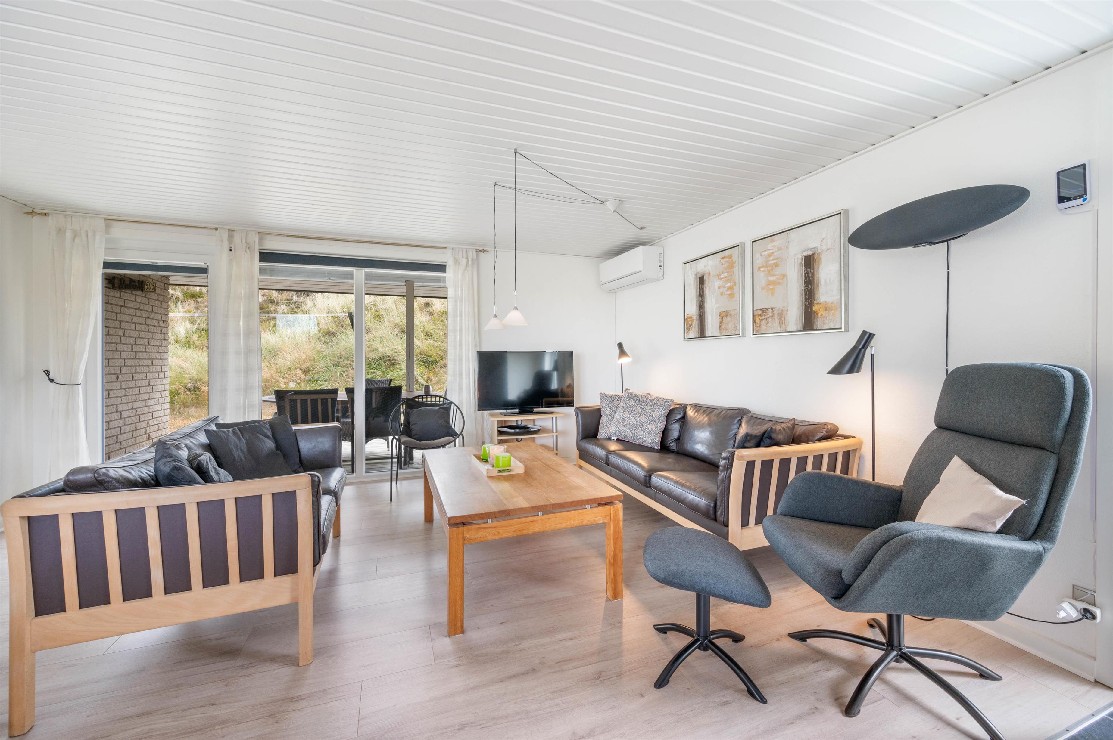 Et virkelig dejligt og flot indrettet feriehus med afskærmede terrasser mod øst og vest. Huset har en skøn beliggenhed på en kuperet naturgrund i Årgab med dejlig udsigt over området og til klitterne.