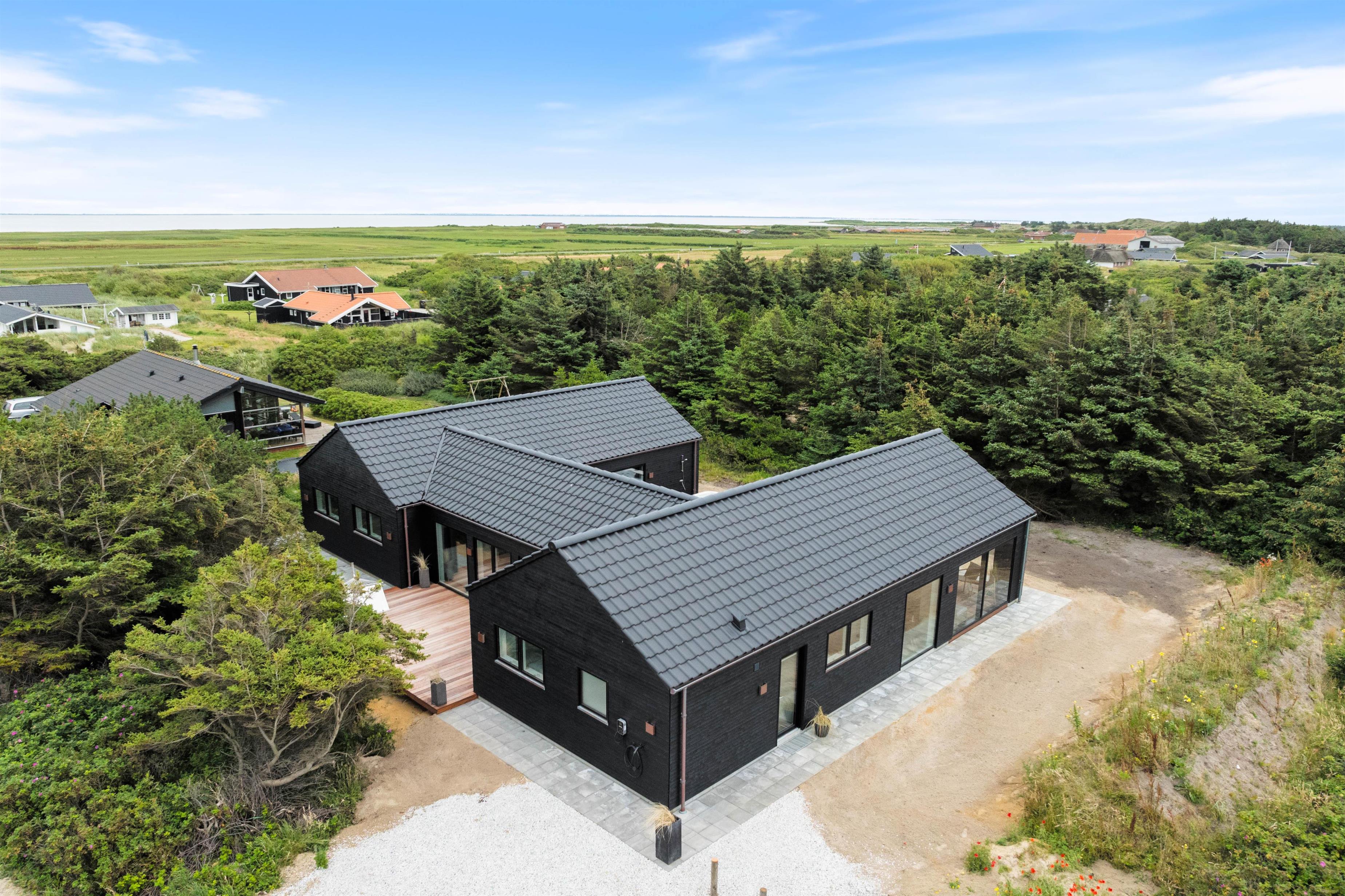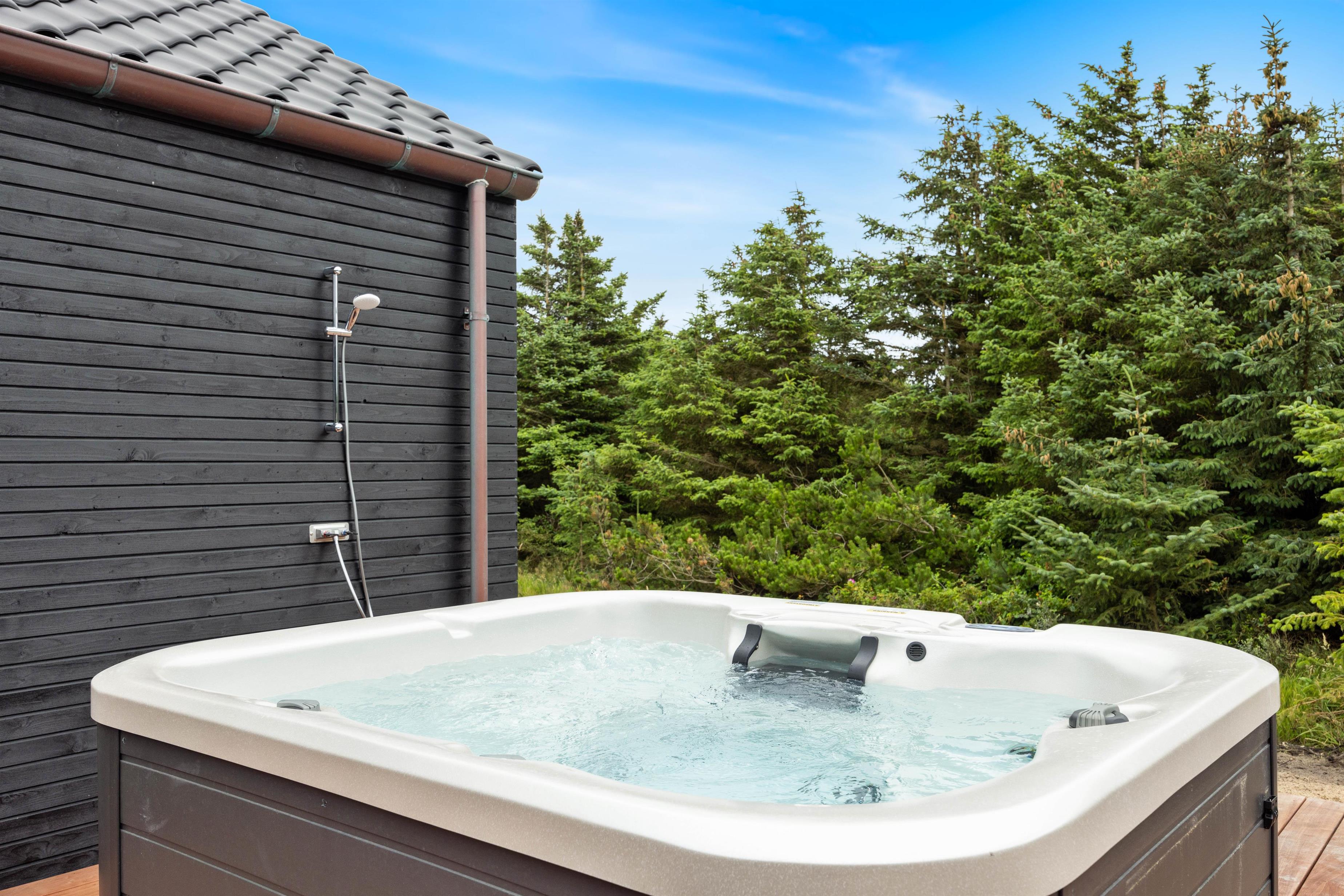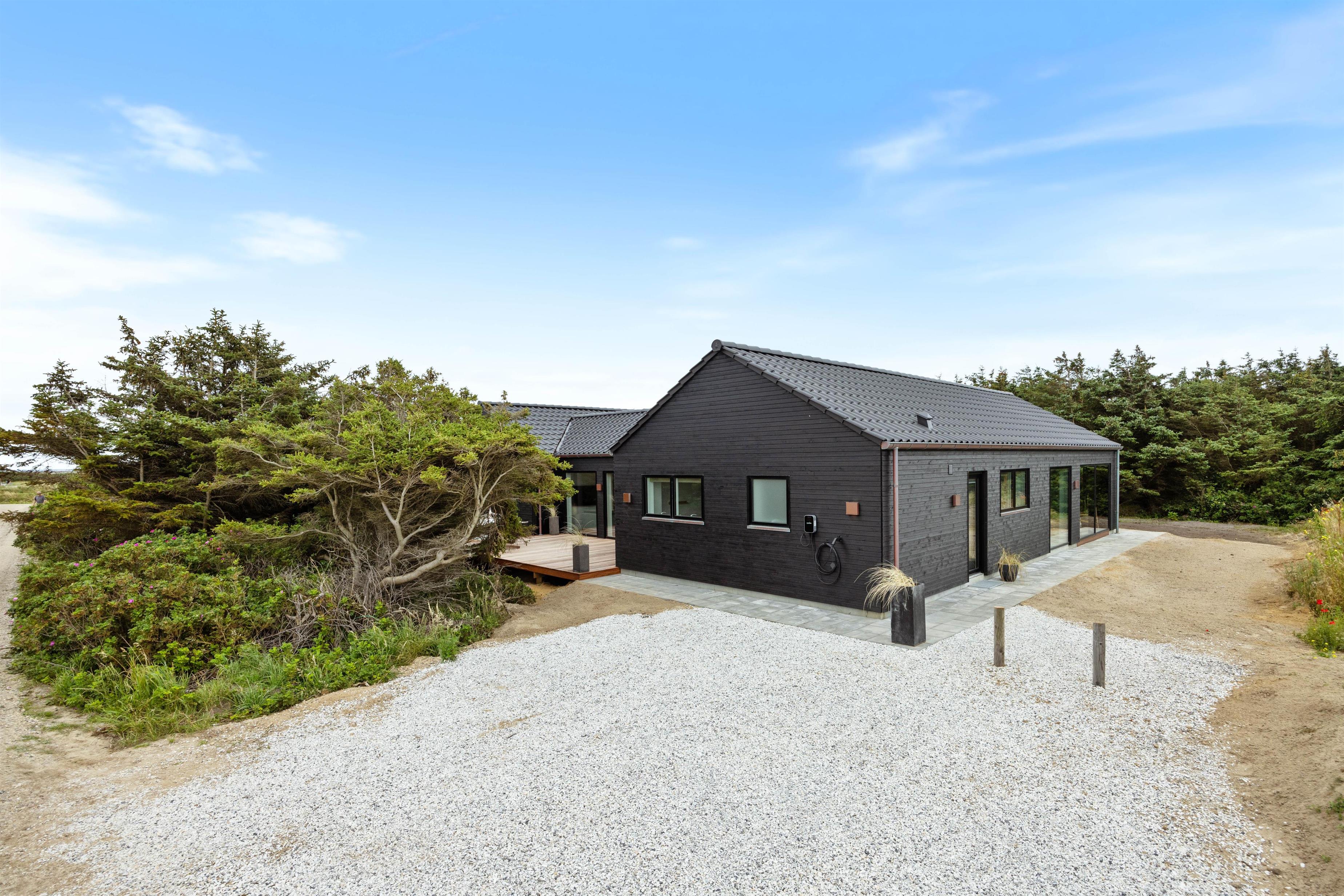 Dette moderne sommerhus er beliggende på en skøn naturgrund, som I kan nyde fra den store terrasse, der er delvist overdækket. Den store terrasse indbyder til mange hyggelige timer, da den blandt andet byder på en udespa, hvor I efter en lang dag kan komme helt ned i gear. Derudover finder I også en udendørs bruser, som I kan bruge fra april til november efter en dejlig tur ved Vesterhavet.
