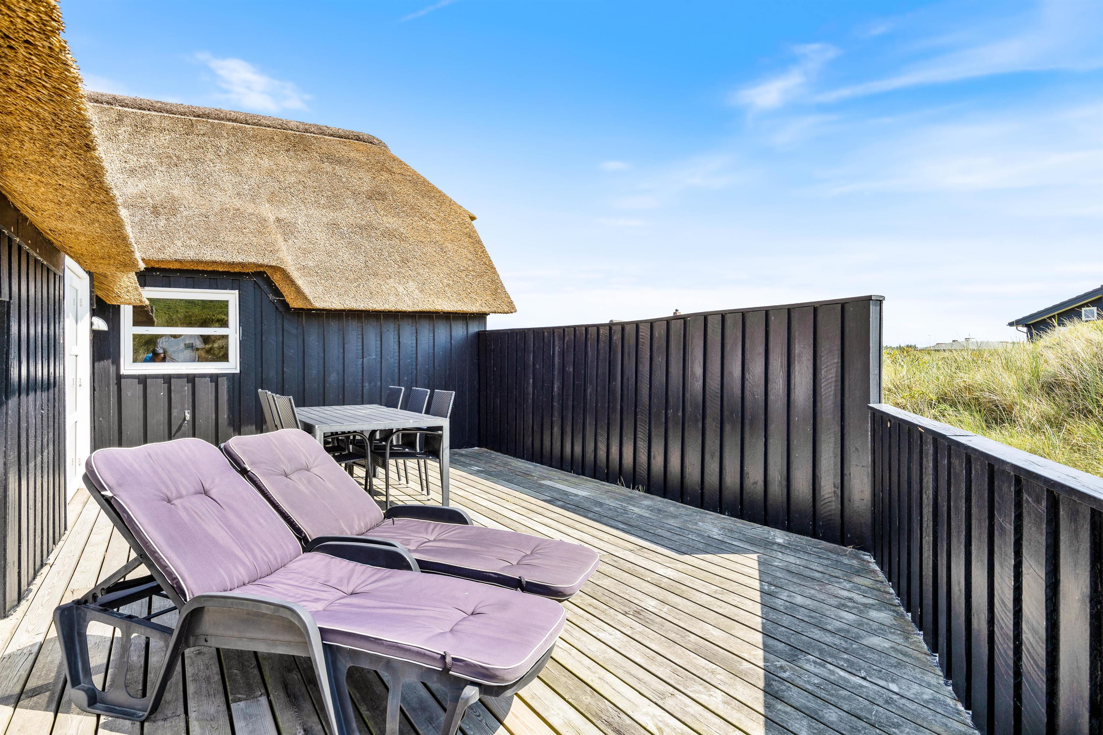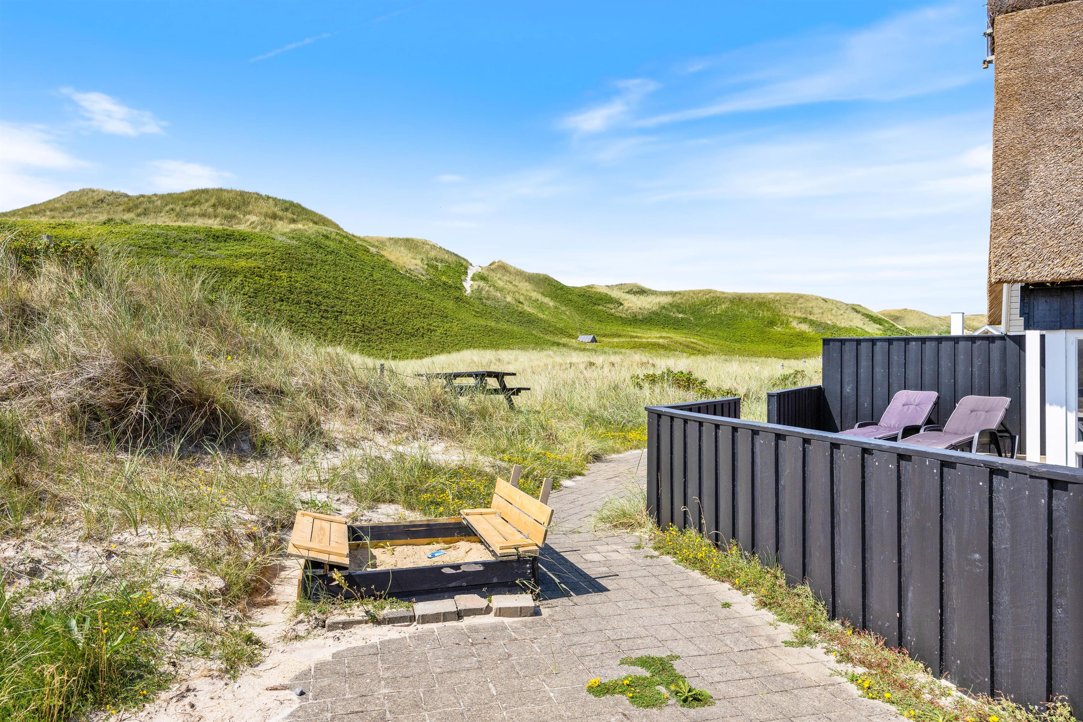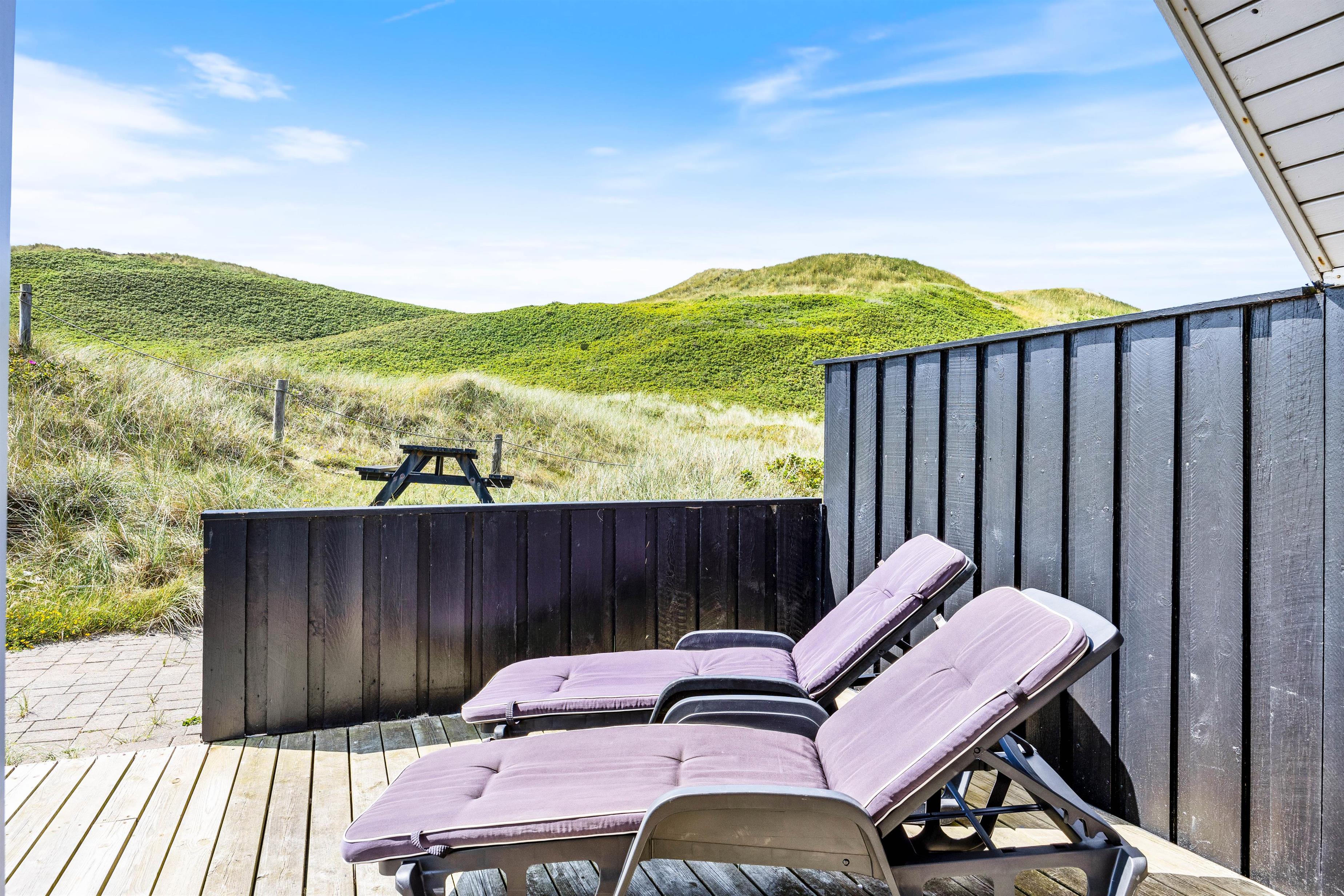 Fra terrassen er der en skøn udsigt til klitterne, som danner rammerne for en hyggelig grillaften med familie i de skønne havemøbler. Her er der også solvogne og parasol så man kan nyde solen om dagen, hvis man ikke vil en tur til stranden.