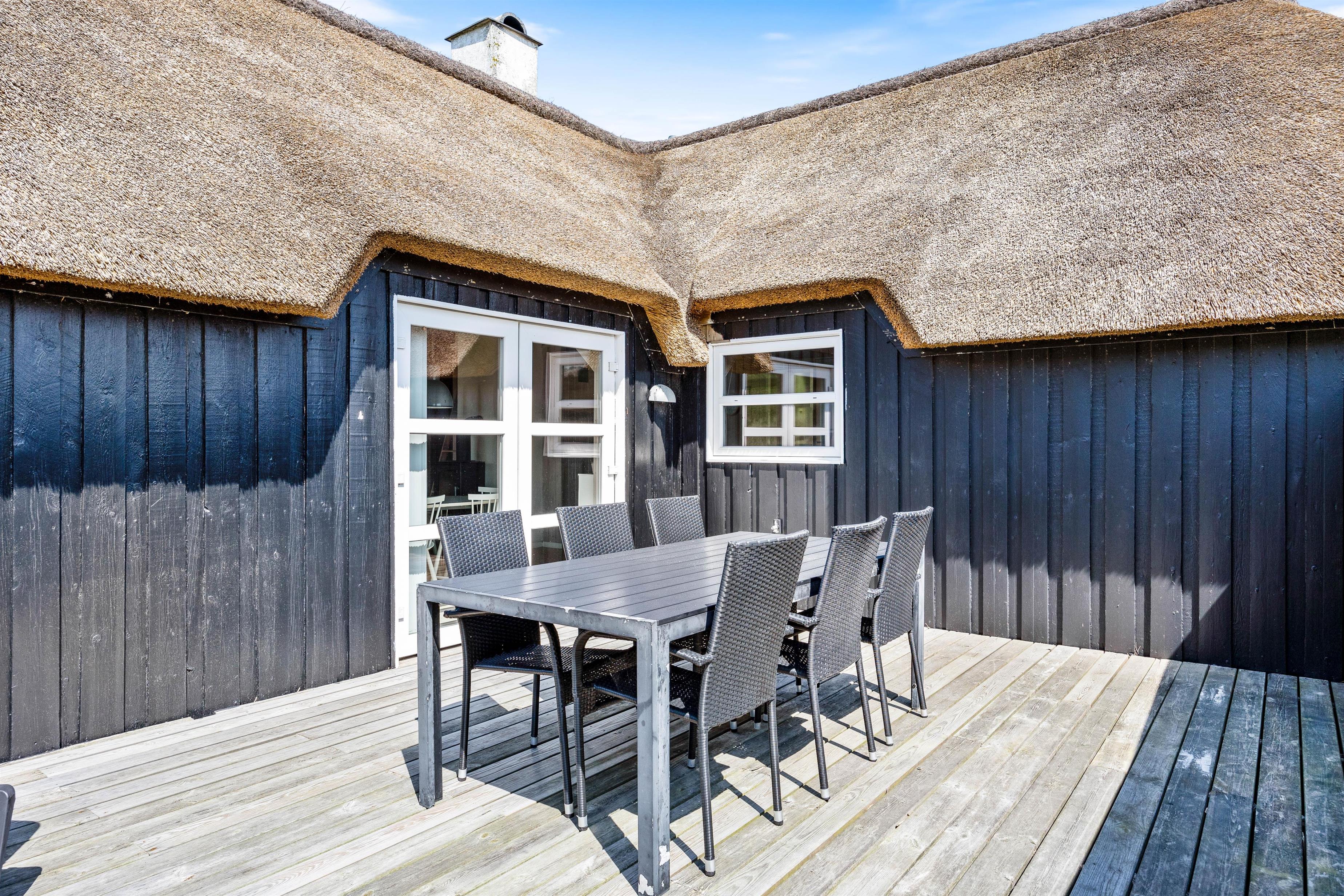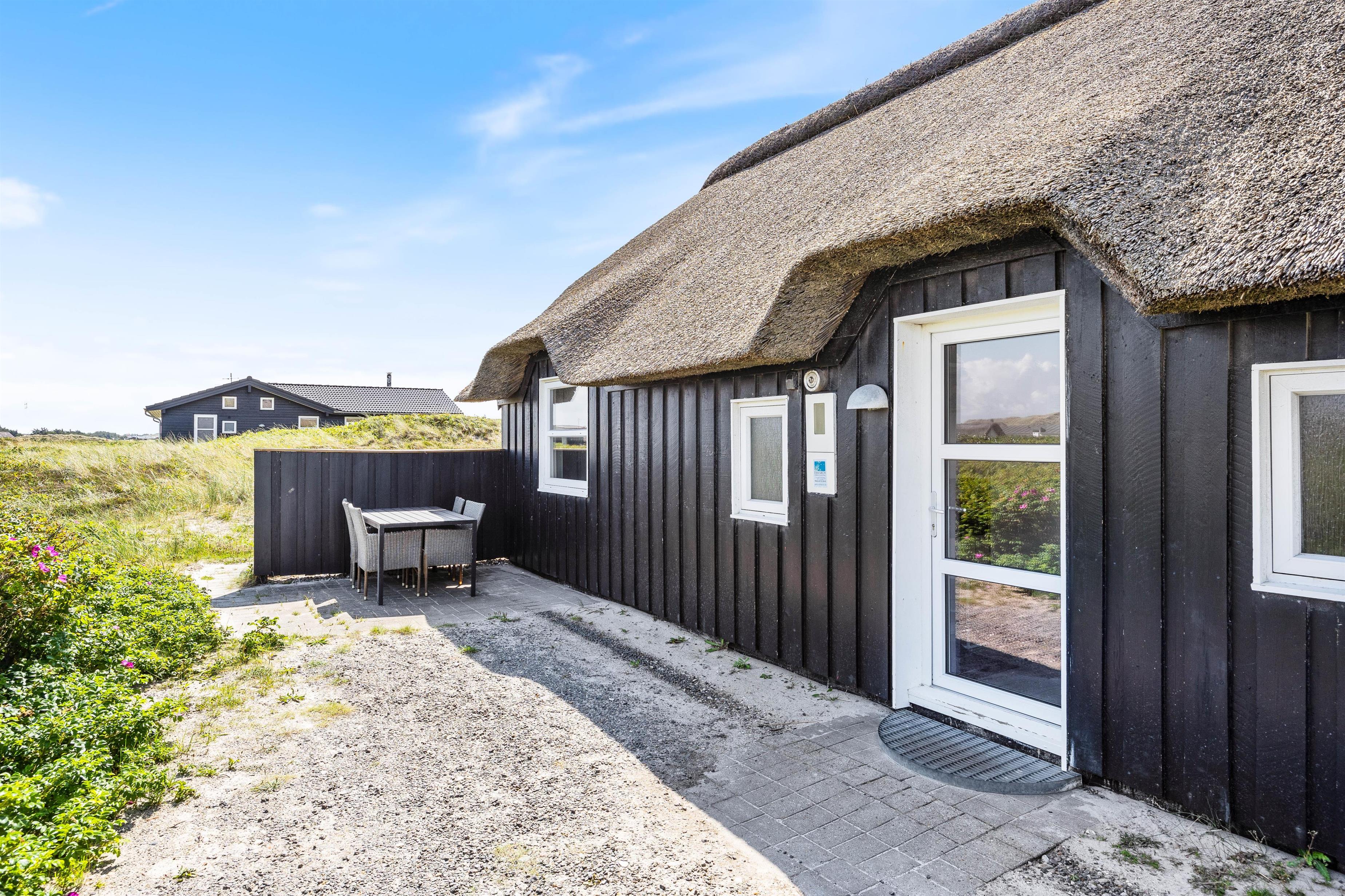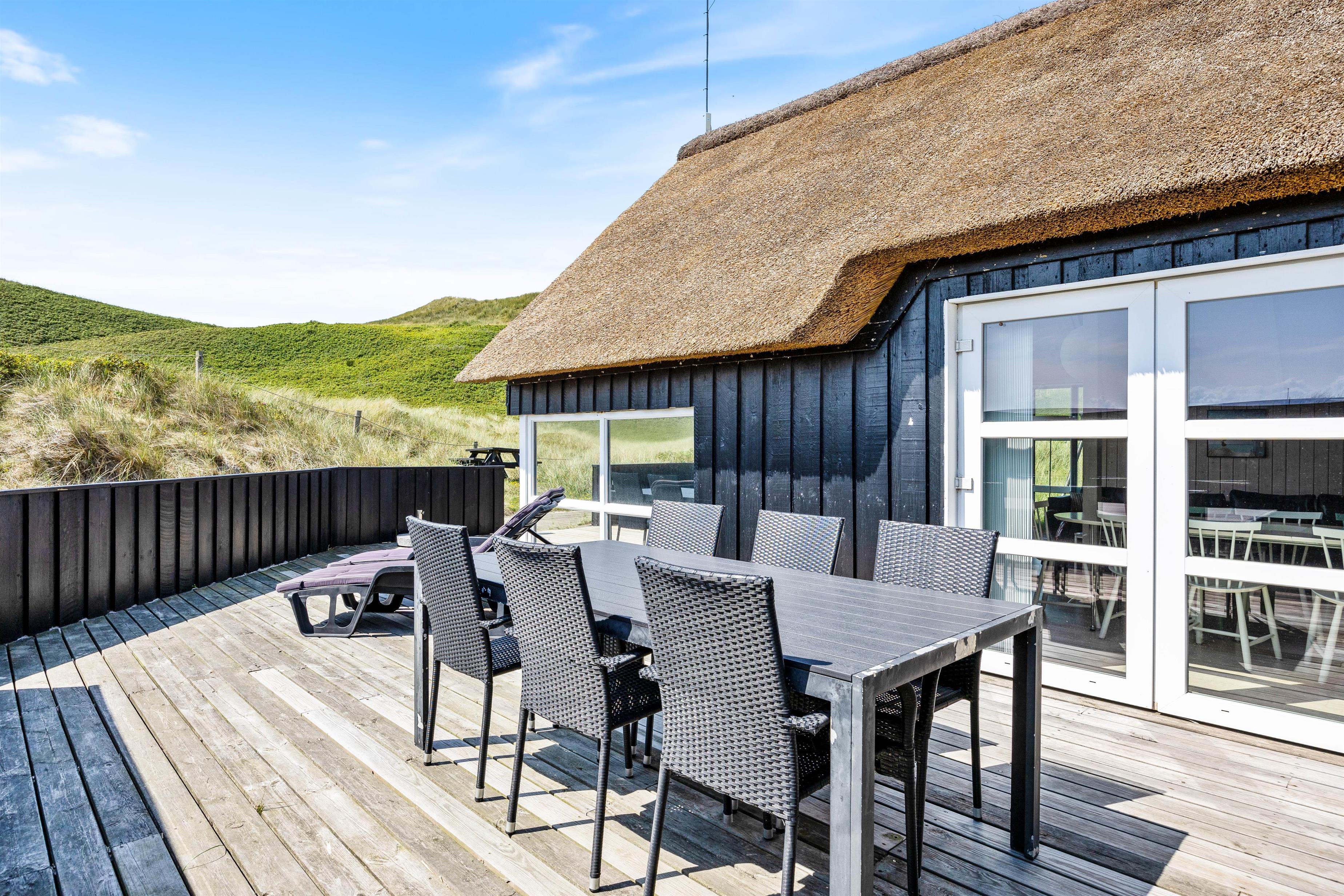 Fra terrassen er der en skøn udsigt til klitterne, som danner rammerne for en hyggelig grillaften med familie i de skønne havemøbler. Her er der også solvogne og parasol så man kan nyde solen om dagen, hvis man ikke vil en tur til stranden.