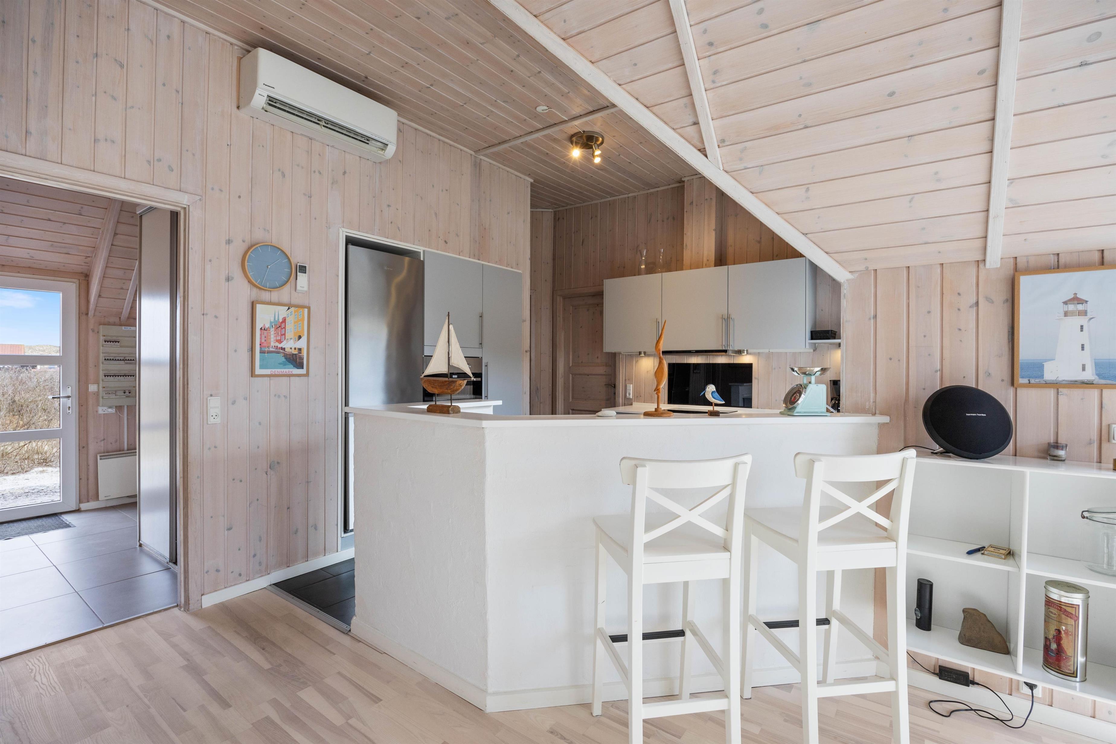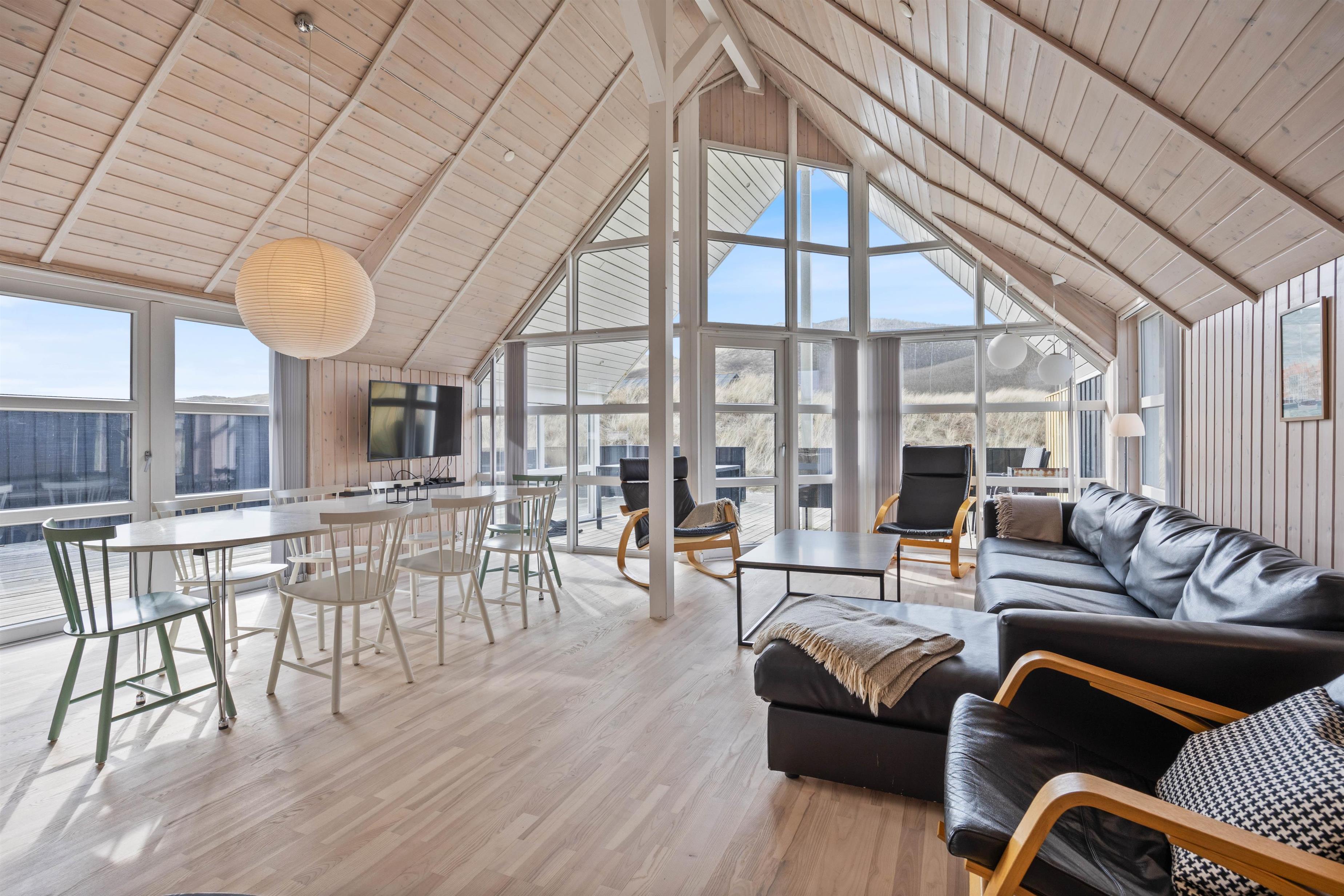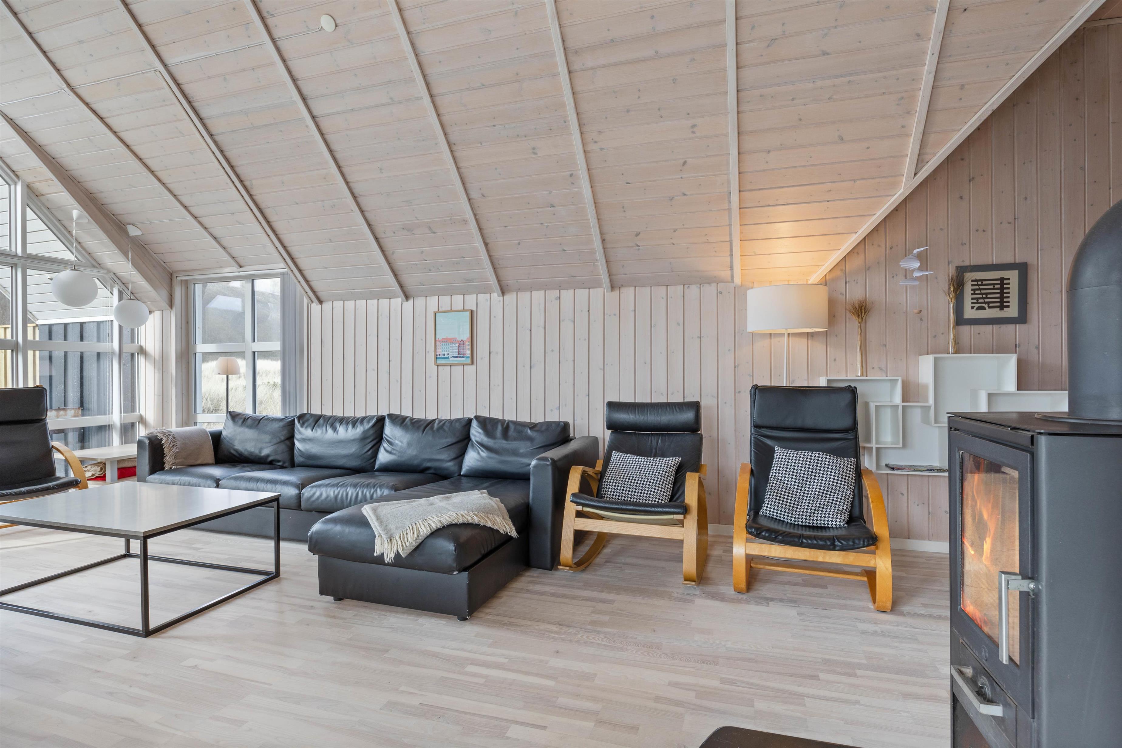 Sommerhuset blev bygget i 2004, men fremstår yderst indbydende, med de lyse træ loft, vægge og gulve samt store gulv til loft vinduer. Med det store vinduesparti i stuen, kan man nyde den danske natur med en skøn udsigt over klitterne. Her får i et fantastisk lysindfald, som giver en rigtig sommerhusstemning.