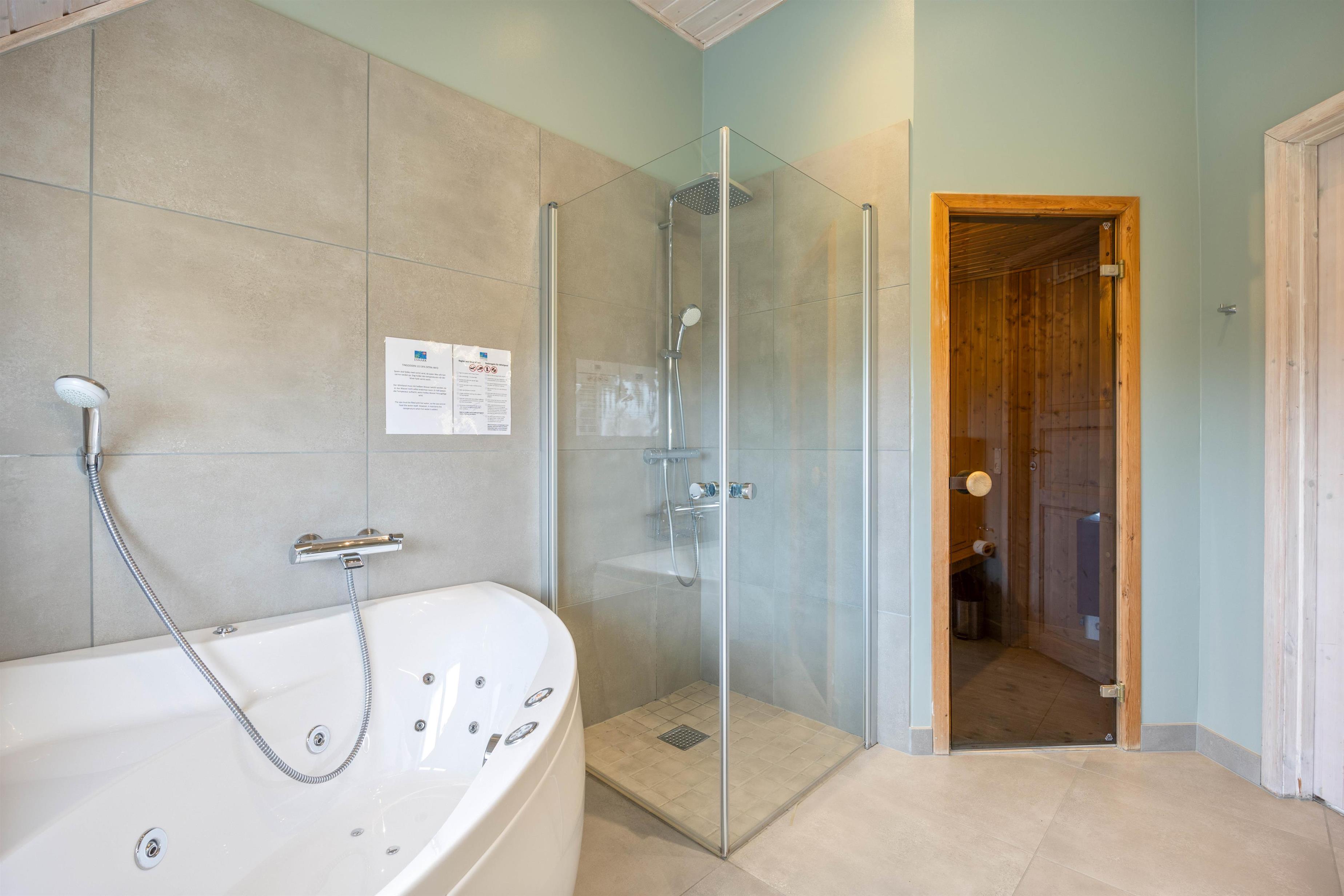 Sommerhusets omdrejningspunkt er med sikkerhed et af de 2 badeværelser. Her kan i nemlig slappe af i spabadet efterfulgt af en tur i saunaen. Så i de kolde måneder, kan i stadig blive opvarmet. Der er nemlig også gulvvarme på begge badeværelser.