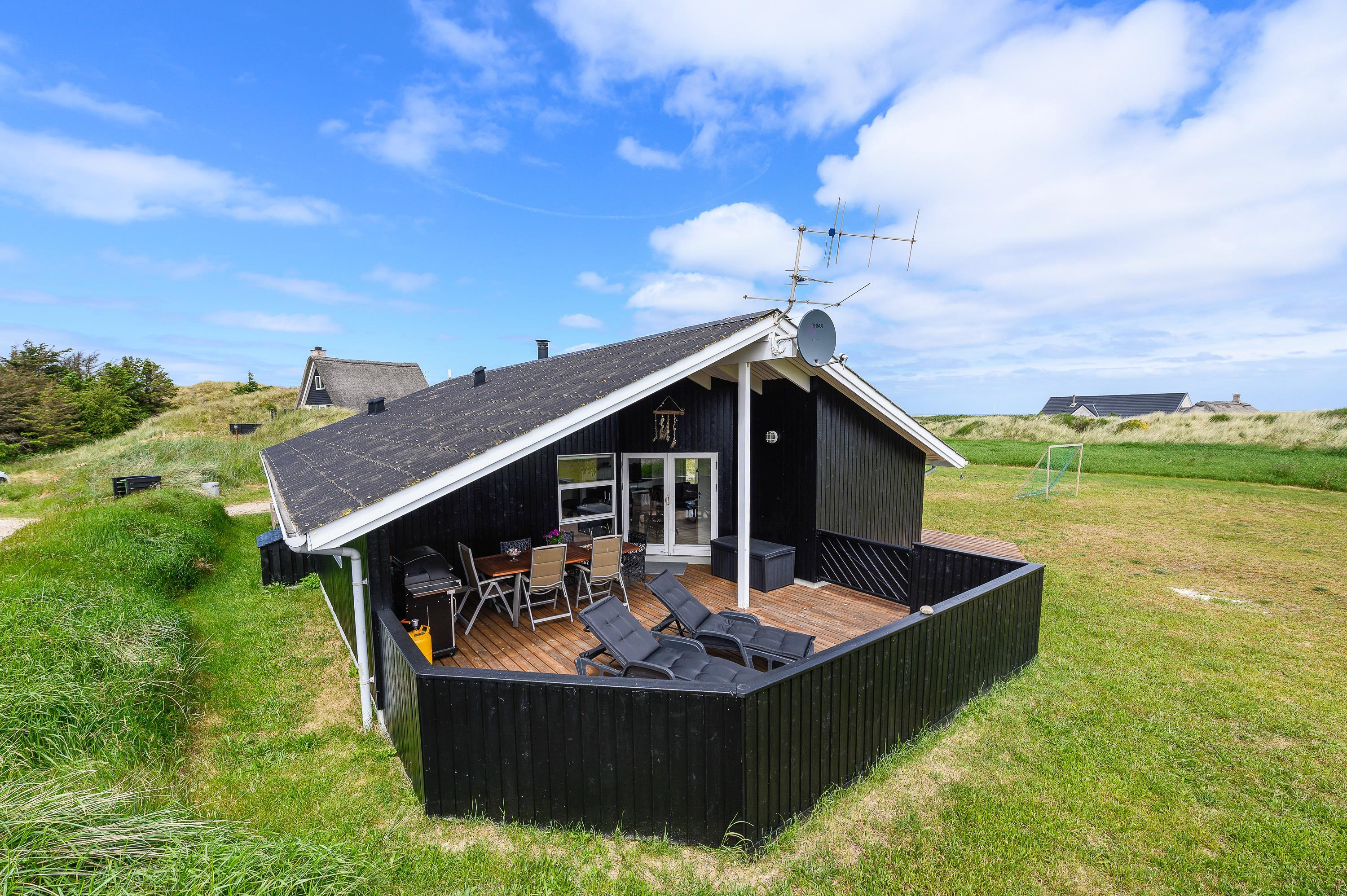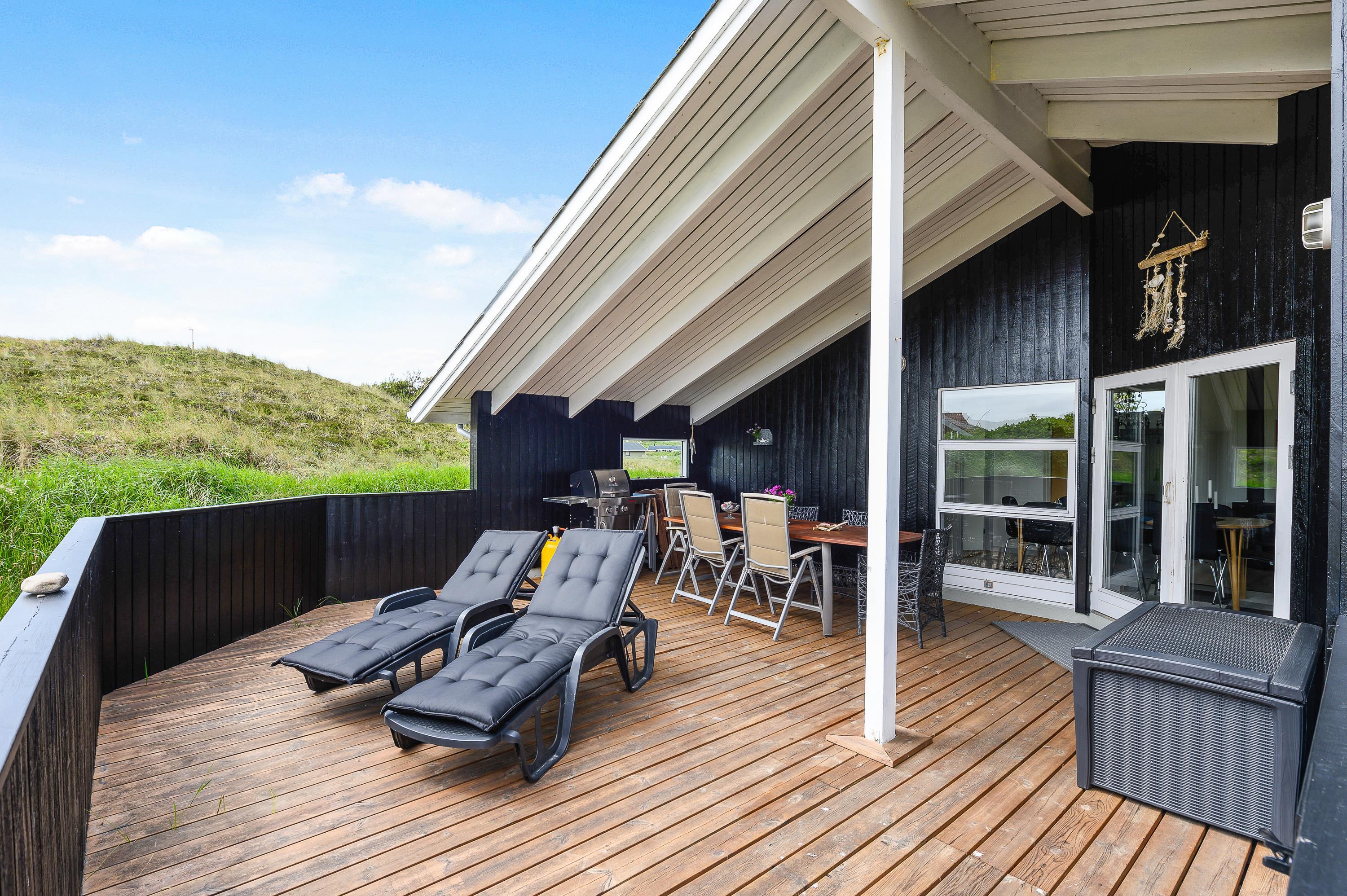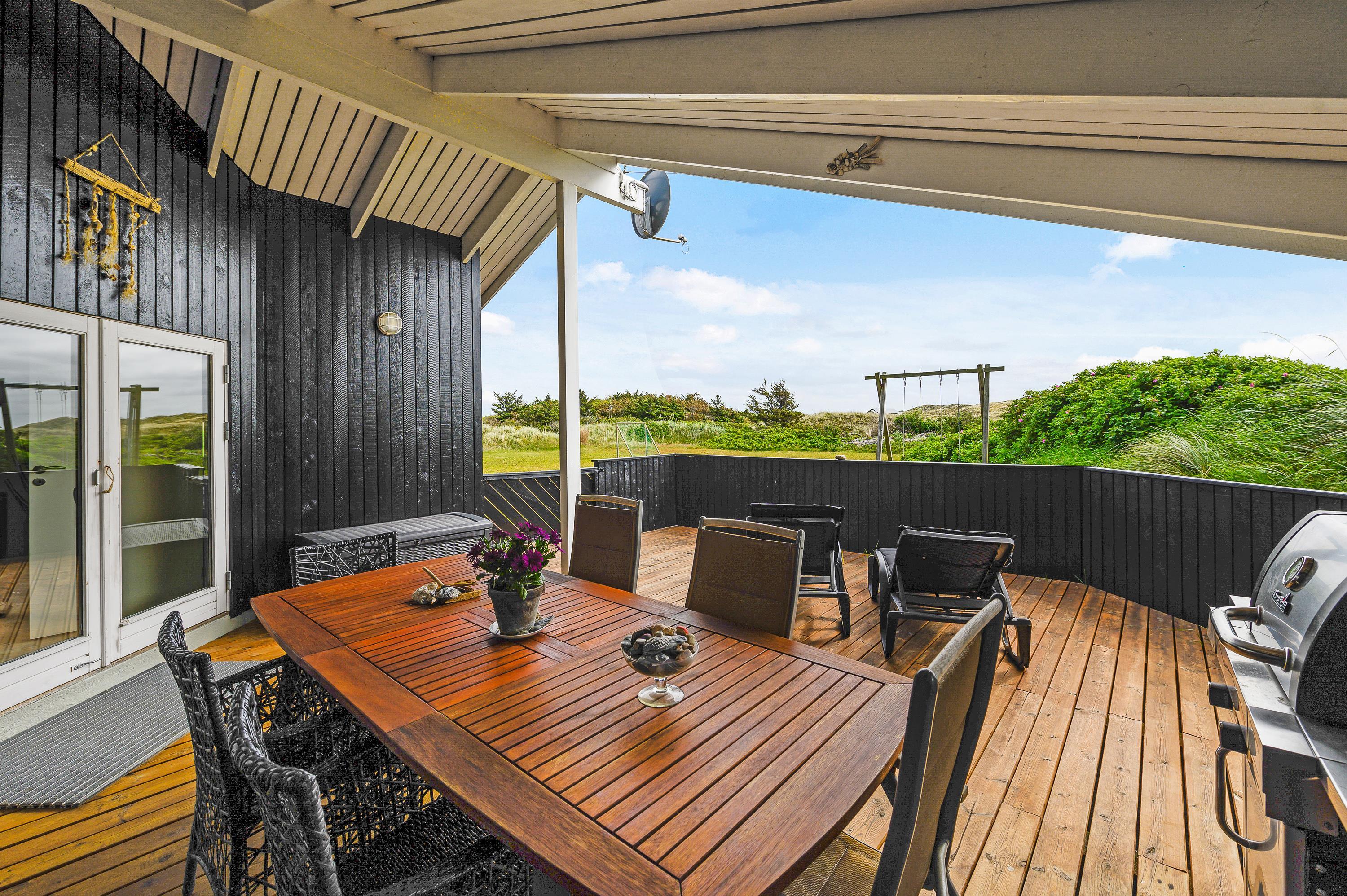 Sommerhuset har en dejlig træ terrasse, som omkranser næsten hele feriehuset. Her er der stort set mulighed for at finde læ, uanset hvor vinden kommer fra, og endvidere er noget af terrassen overdækket - skønt til de lange lyse aftener, hvor grillen har været igang, og man bare ikke har lyst til at gå ind.