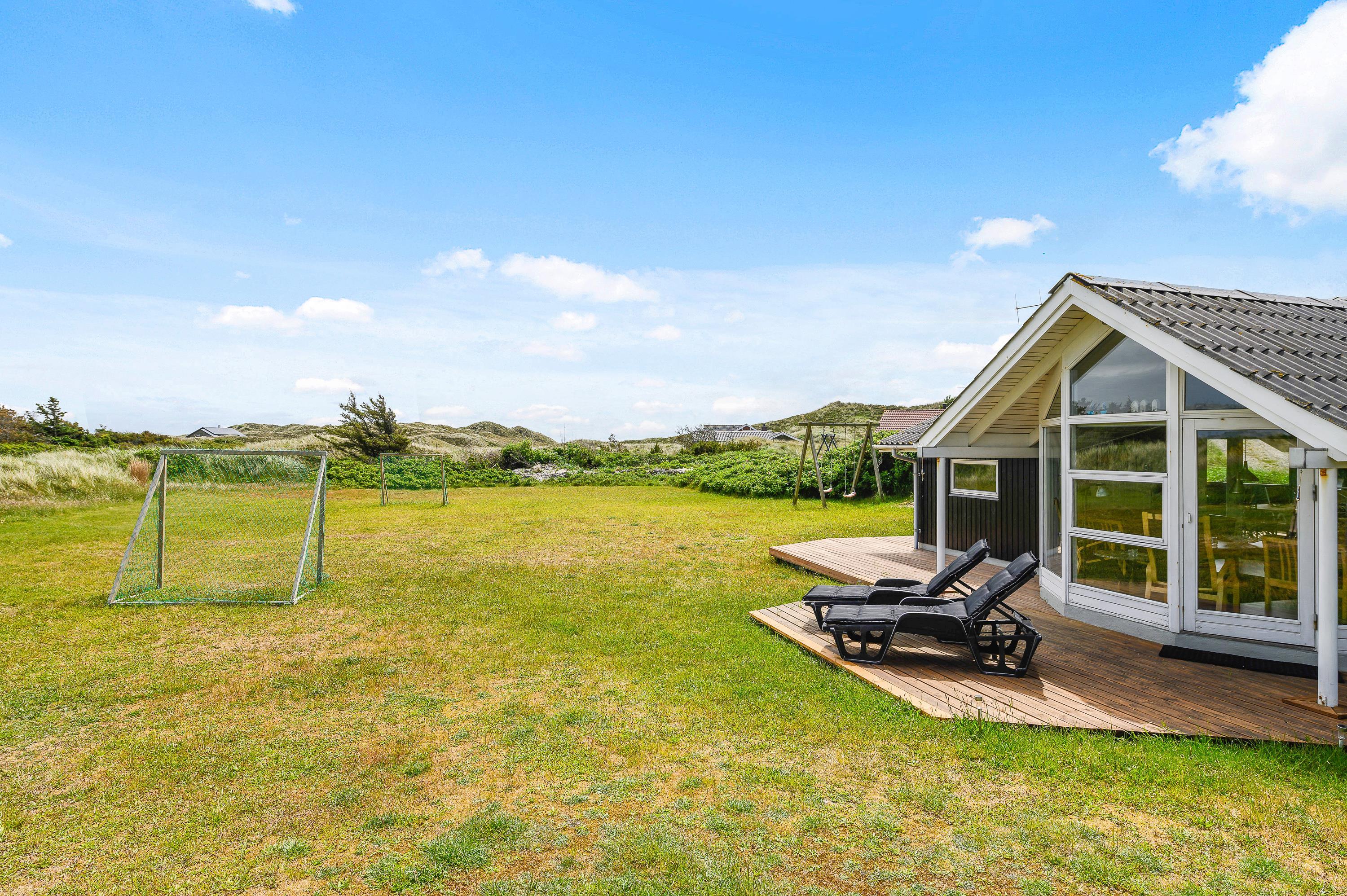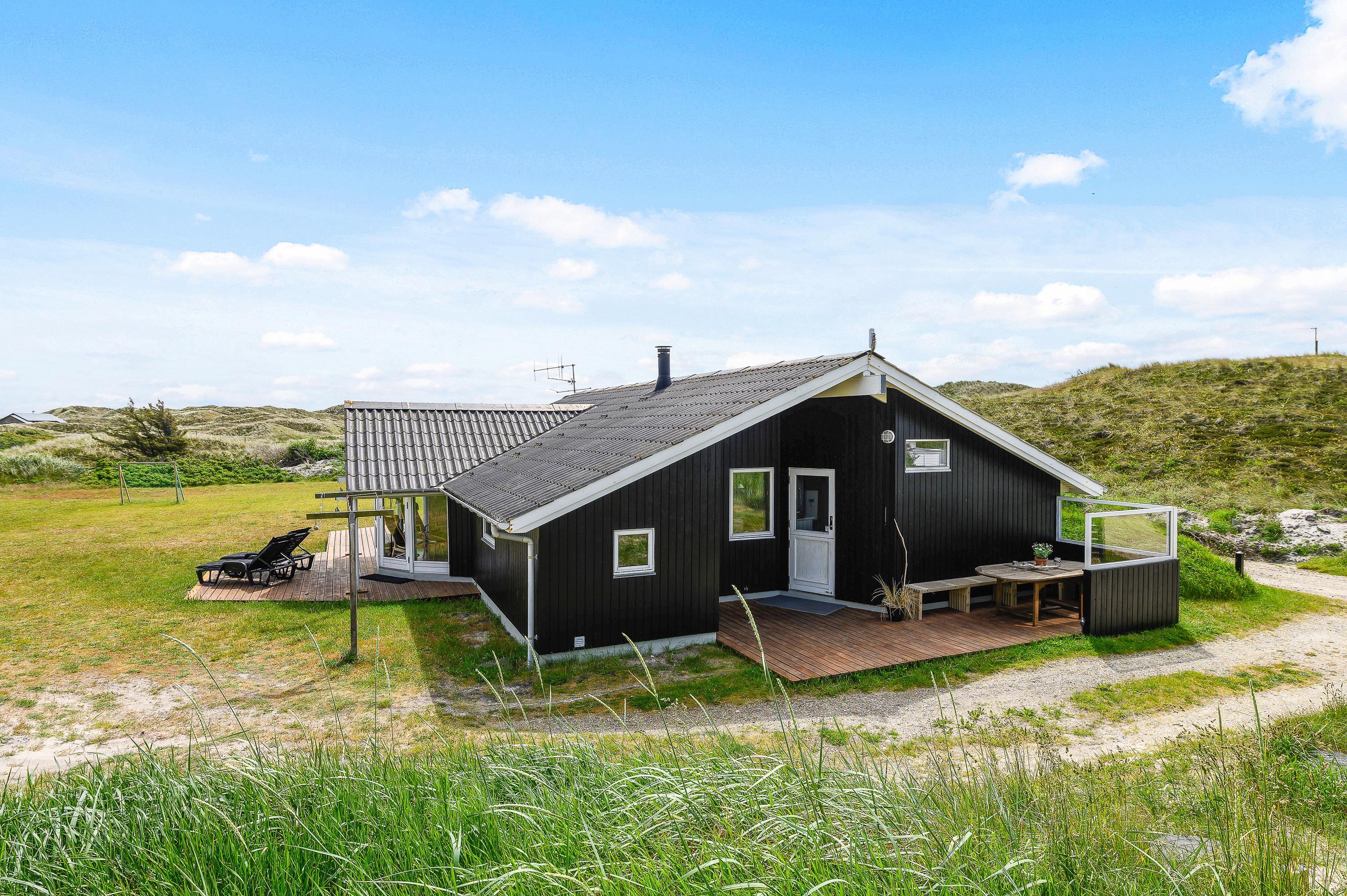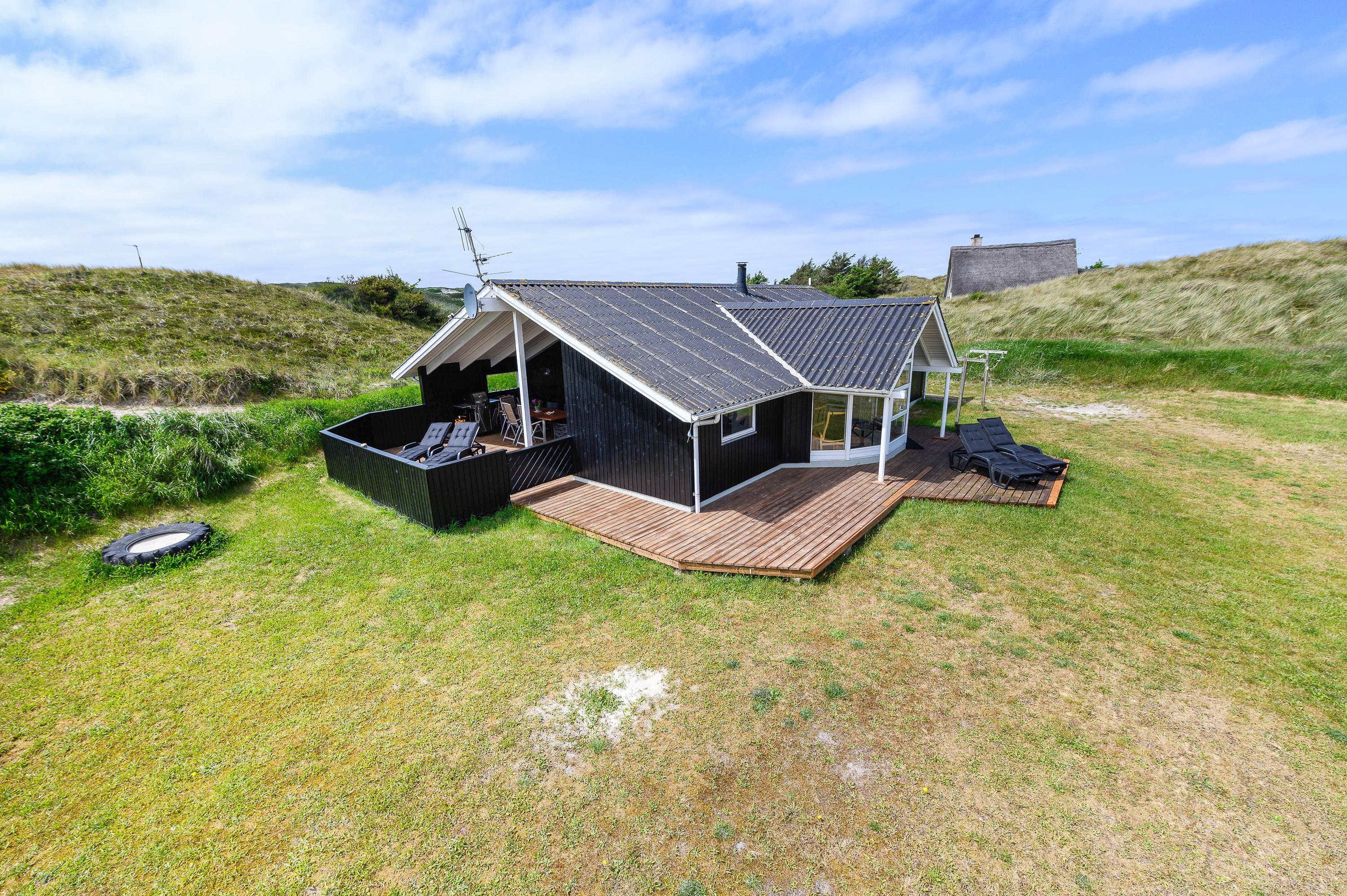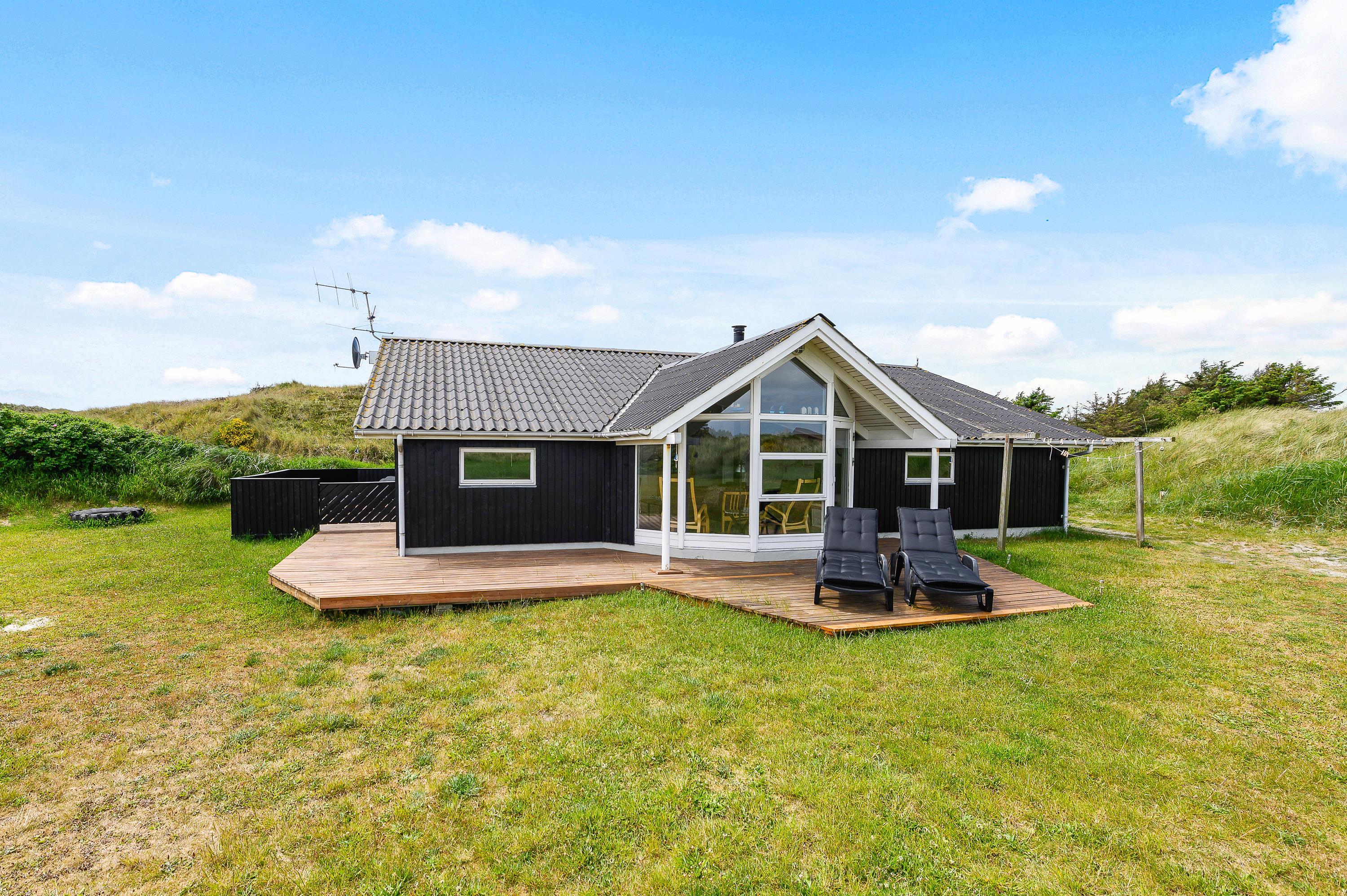 Sommerhuset har en dejlig træ terrasse, som omkranser næsten hele feriehuset. Her er der stort set mulighed for at finde læ, uanset hvor vinden kommer fra, og endvidere er noget af terrassen overdækket - skønt til de lange lyse aftener, hvor grillen har været igang, og man bare ikke har lyst til at gå ind.