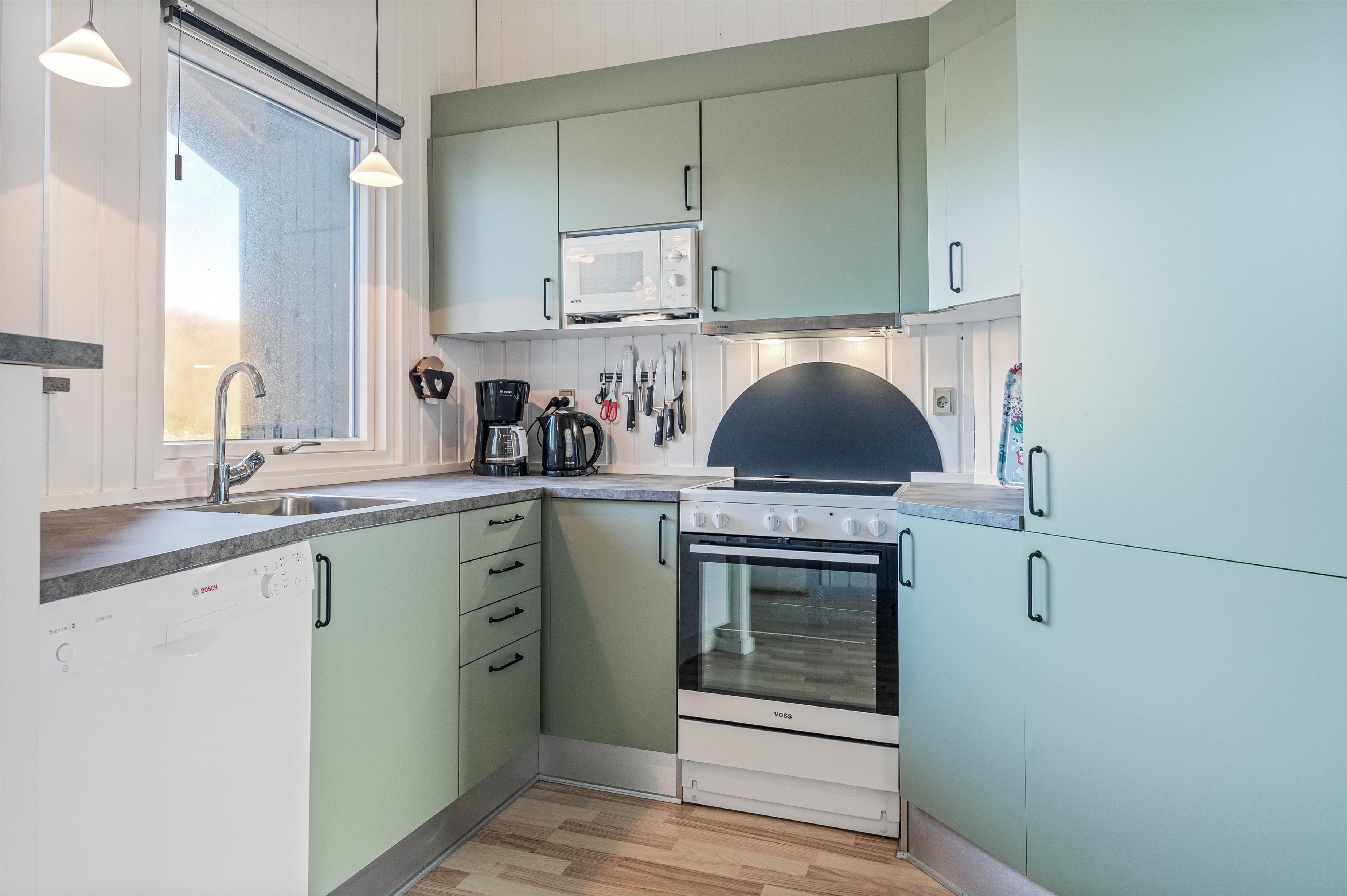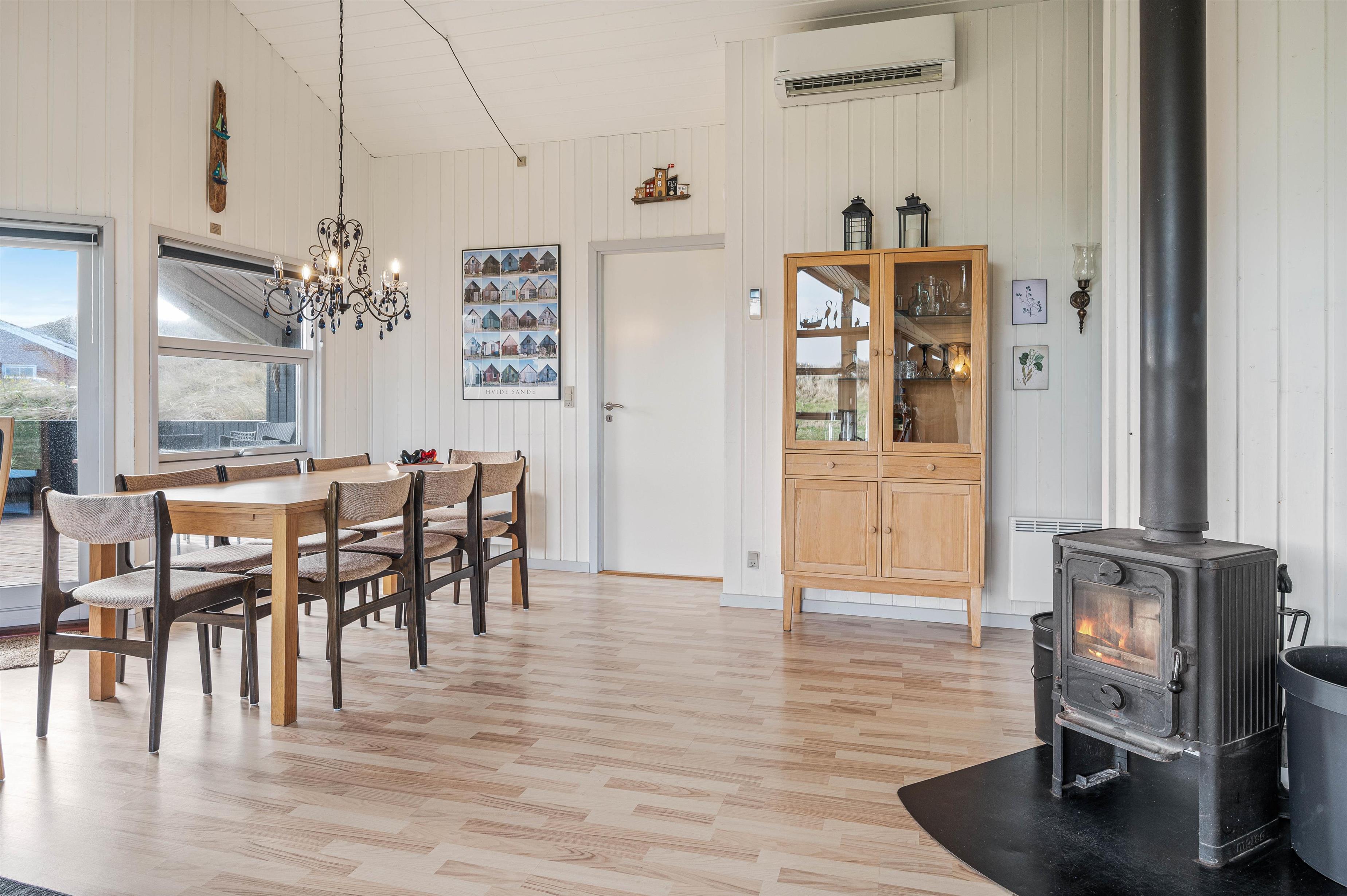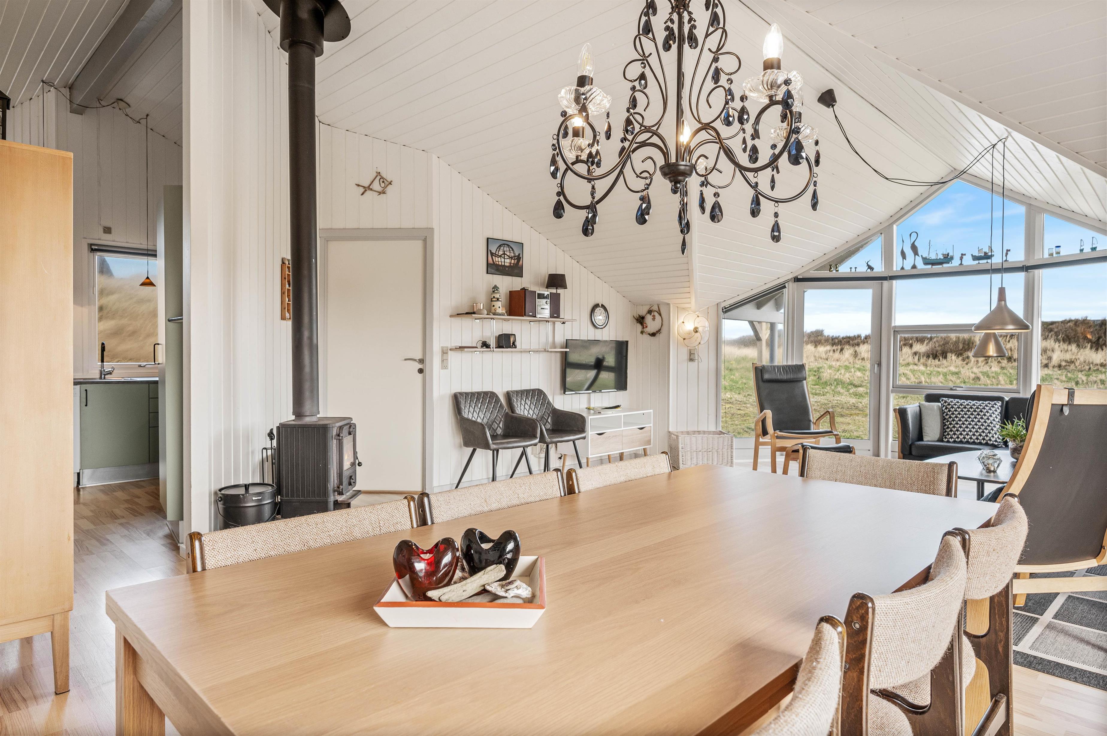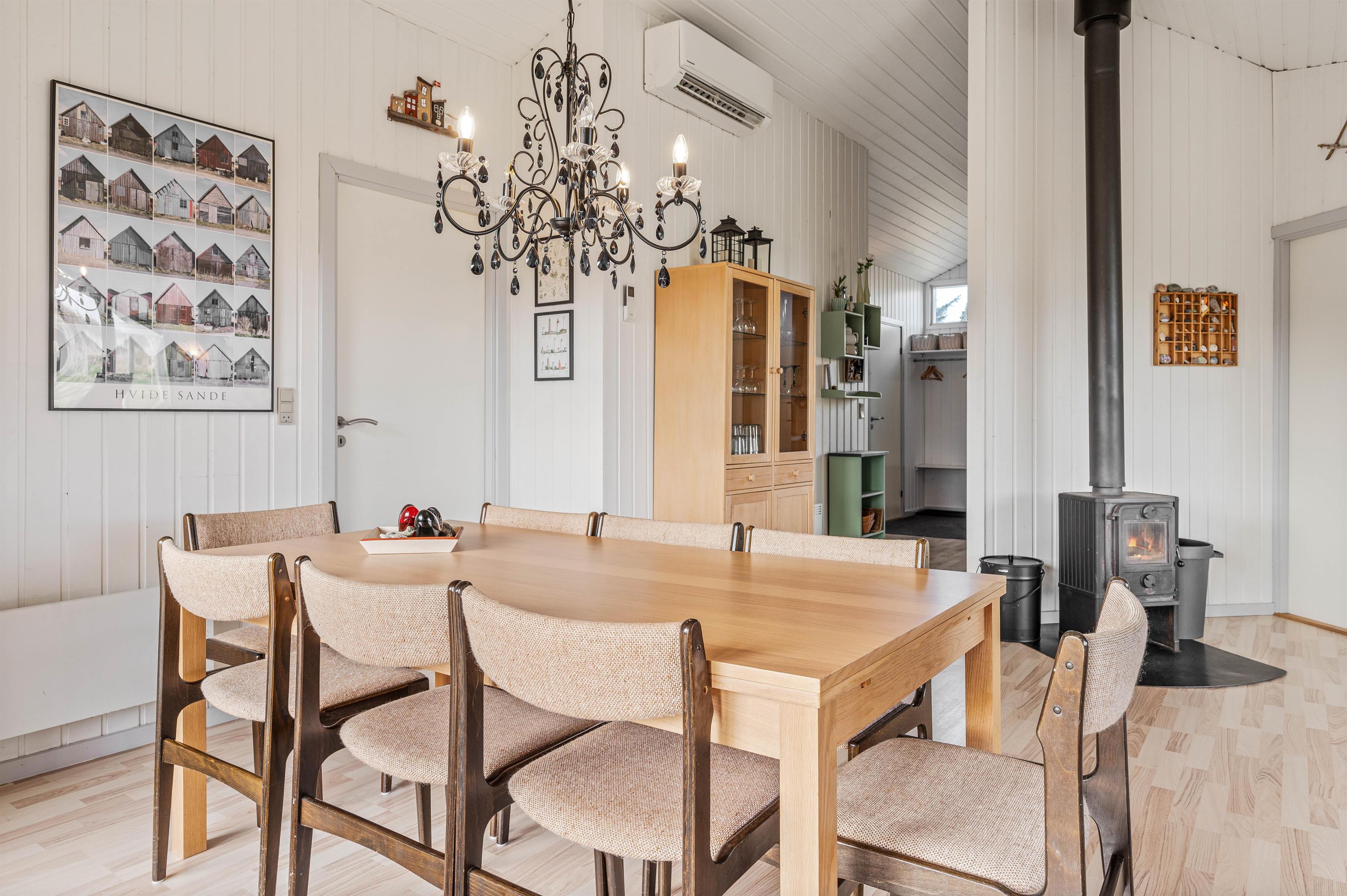 Det hyggelige feriehus har en fin og indbydende indretning. Her er et lyst og dejligt køkken i åben forbindelse med stue og spiseplads, indbyder til lange, hyggelige stunder sammen med familien og vennerne. Tænd op for brændovnen og lad varmen strømmen igennem hele huset, alt i mens du nyder en god bog eller benytter dig af huset trådløse internet.