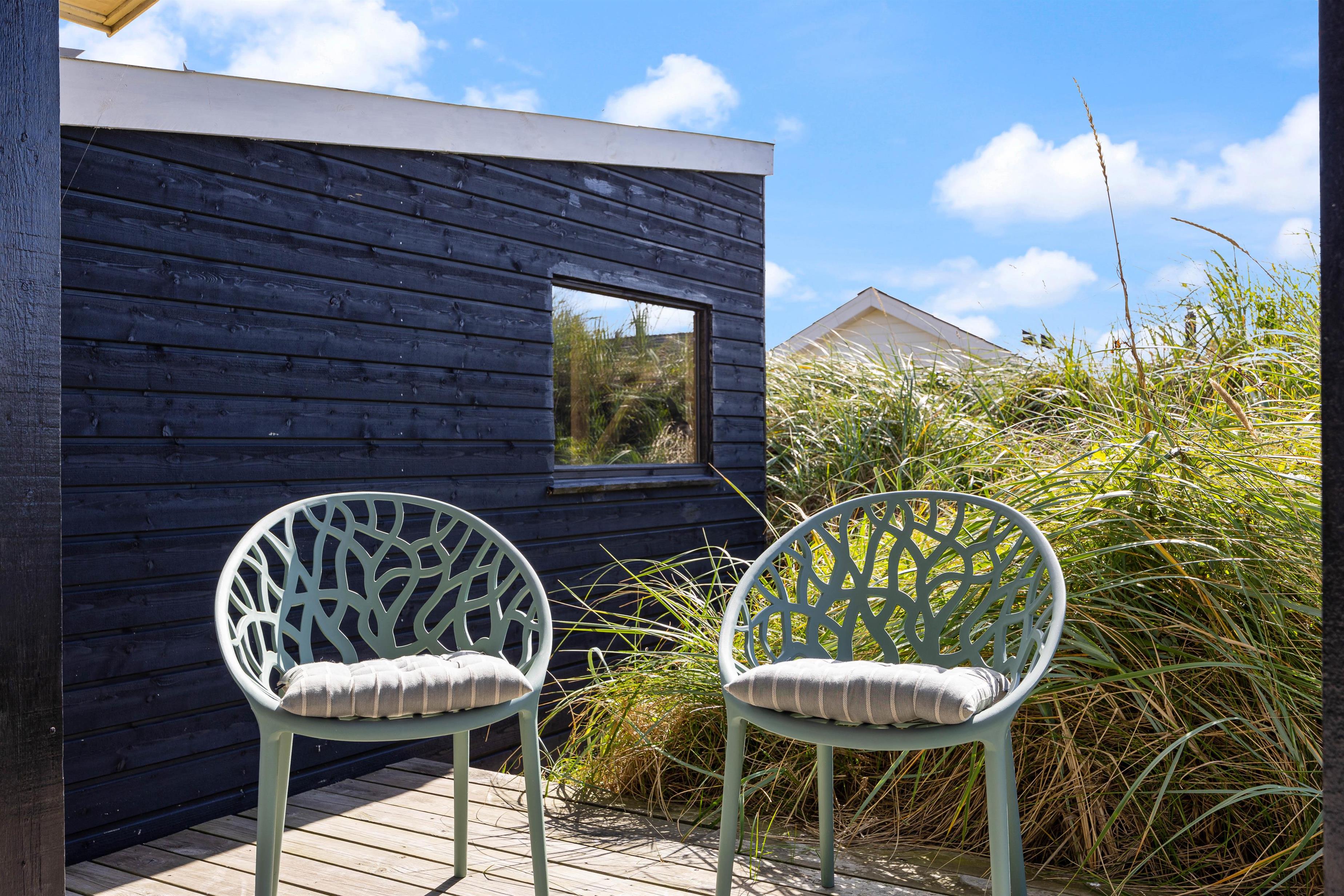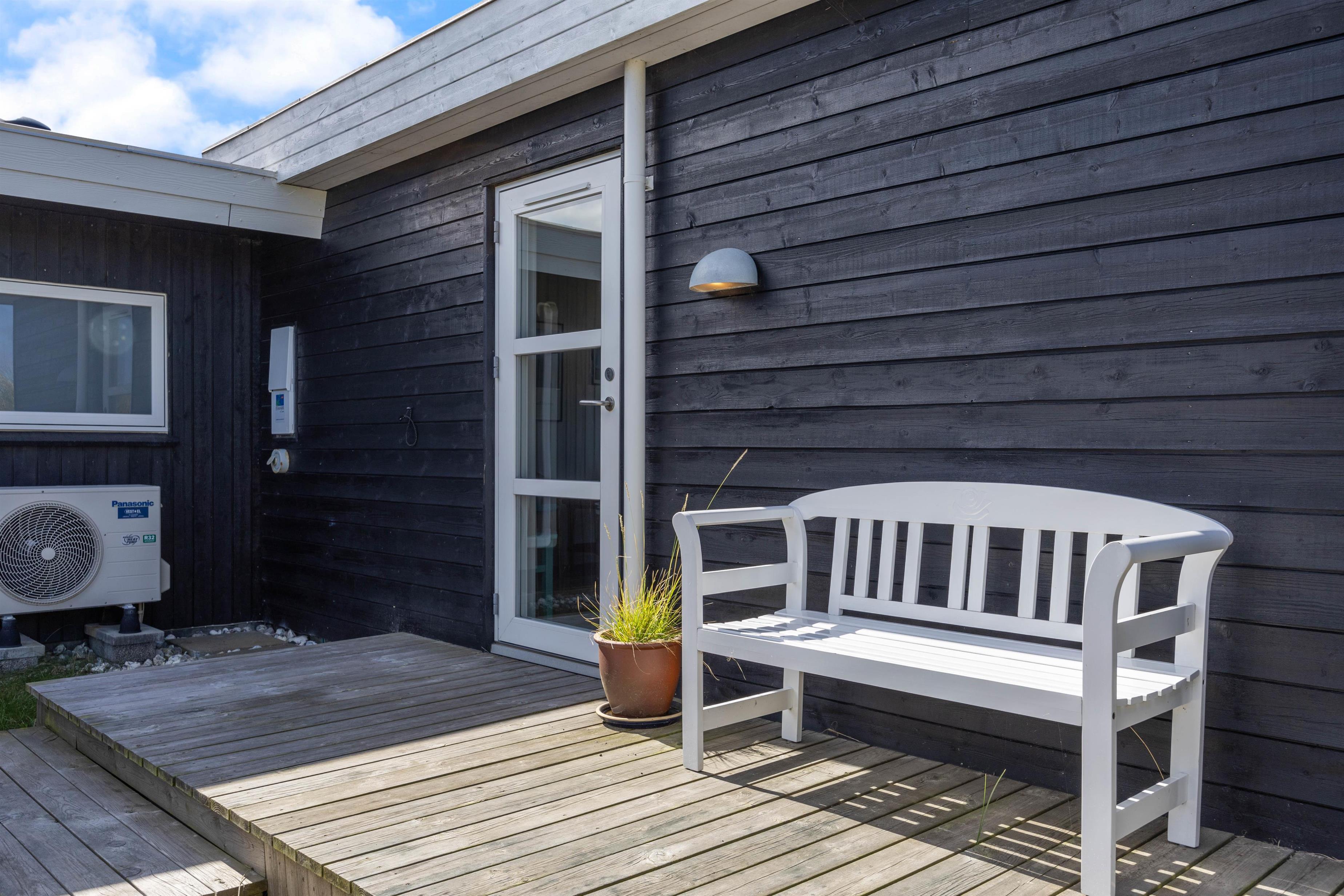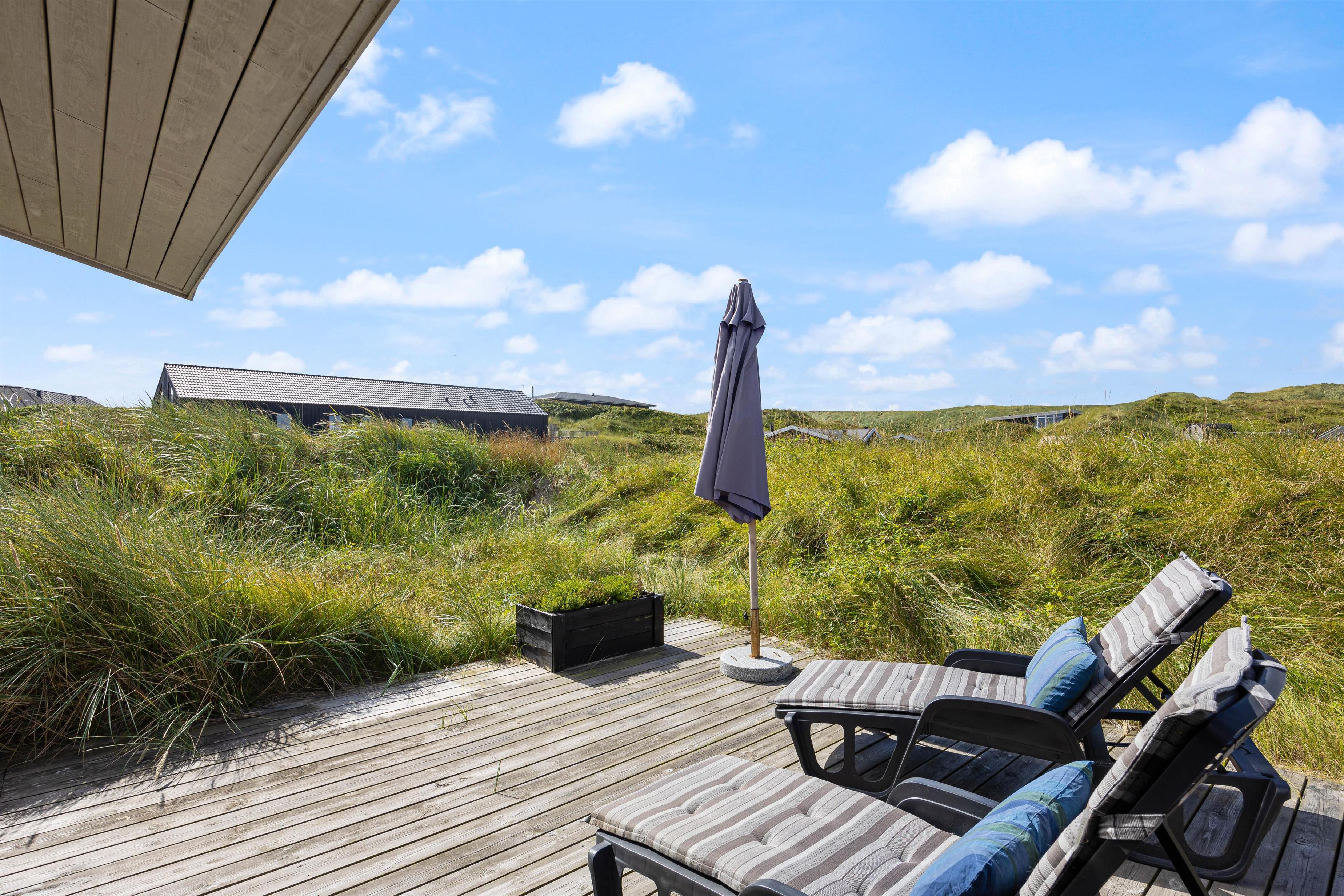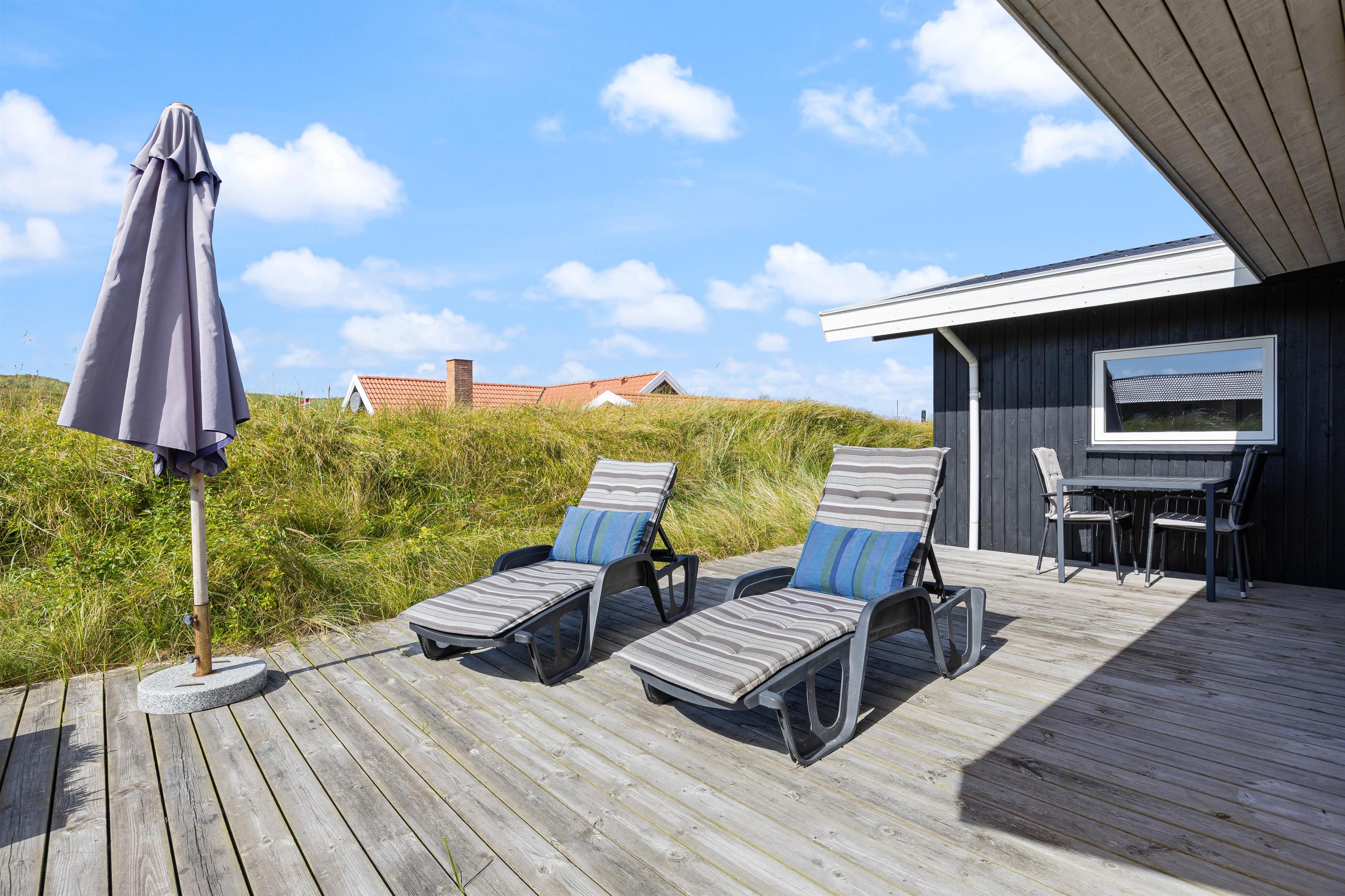På den store terrasse har I flere muligheder for at sidde i læ og nyde en dejlig varm kop kaffe. Det er også muligt at sidde ude under feriehusets parasol og nyde en appetitlig aftensmad lavet på sommerhusets grill.
