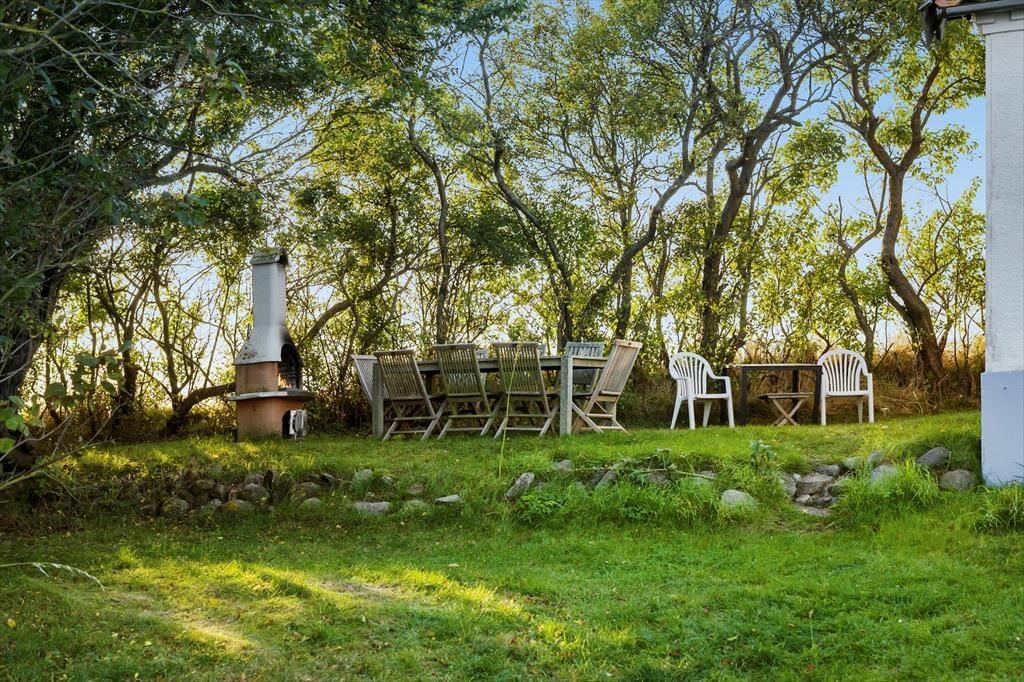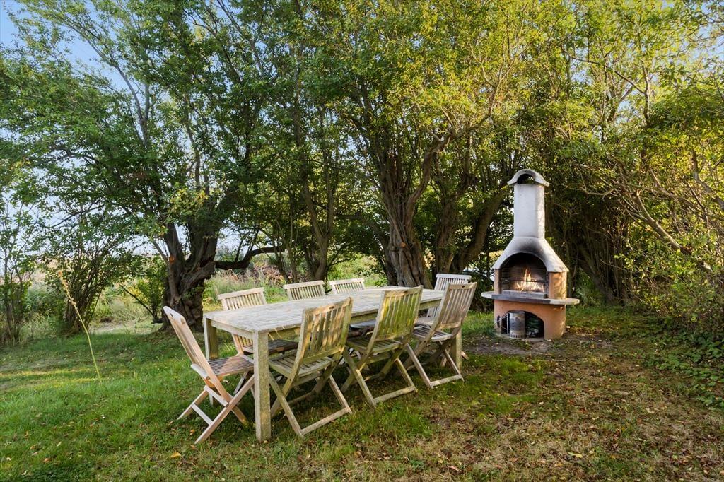 En stor udendørs pejs gør det muligt at sidde ude og nyde de lange lyse sommeraftener.