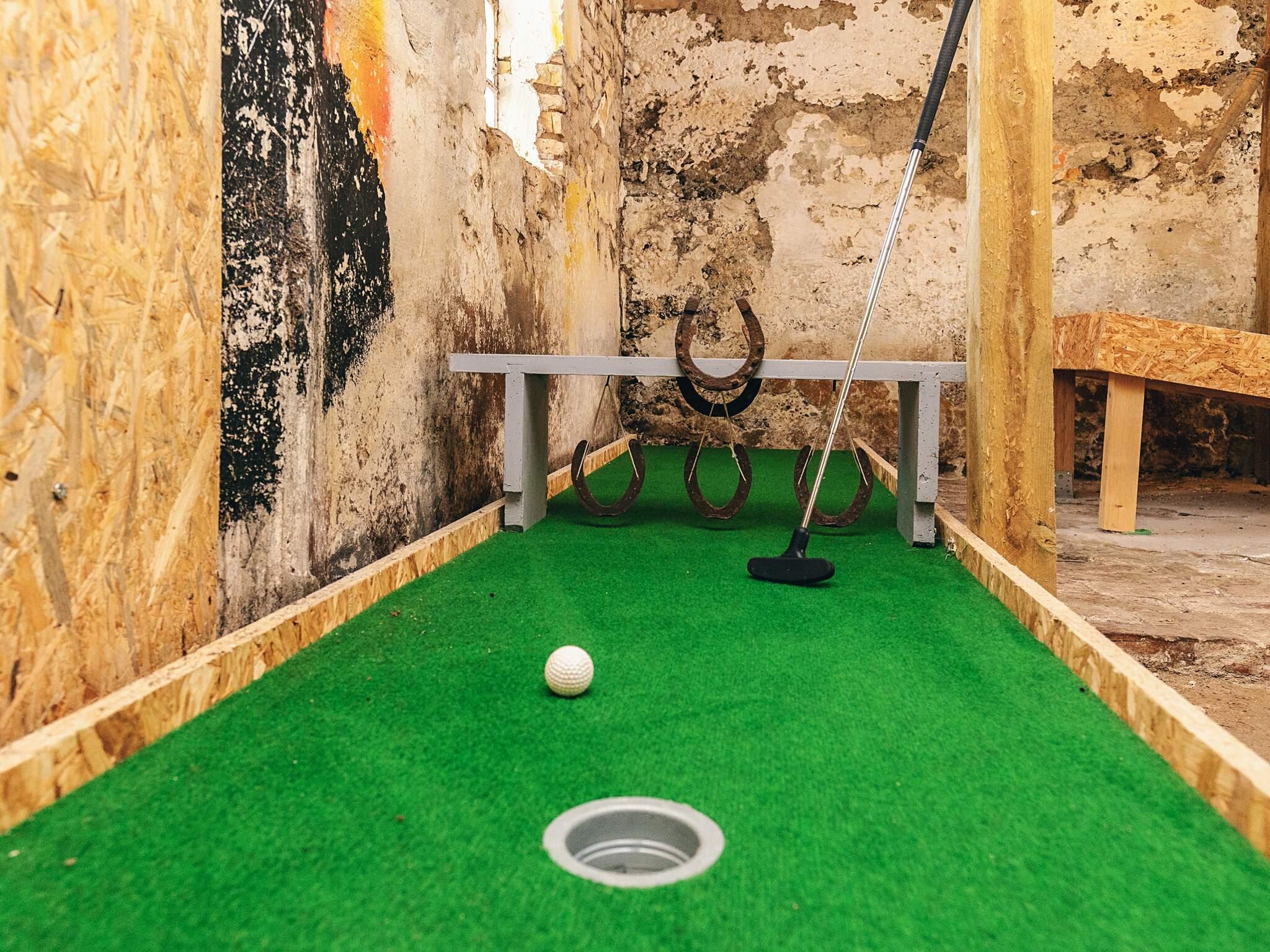 Ovenpå på hemsen finder gæsterne et stort soveværelse og et andet opholdsområde med udsigt over stuen nedenfor. For yderligere fritid er en tidligere stald blevet omdannet til en lille 9-hullers minigolfbane, hvilket giver sjov for alle aldre. Med sin blanding af indendørs komfort, udendørs plads og unikke faciliteter sikrer dette feriehus et afslappende og behageligt ophold. Udlejning er ikke tilladt til ungdomsgrupper, hvilket garanterer et fredeligt og familievenligt miljø under hele dit besøg.
