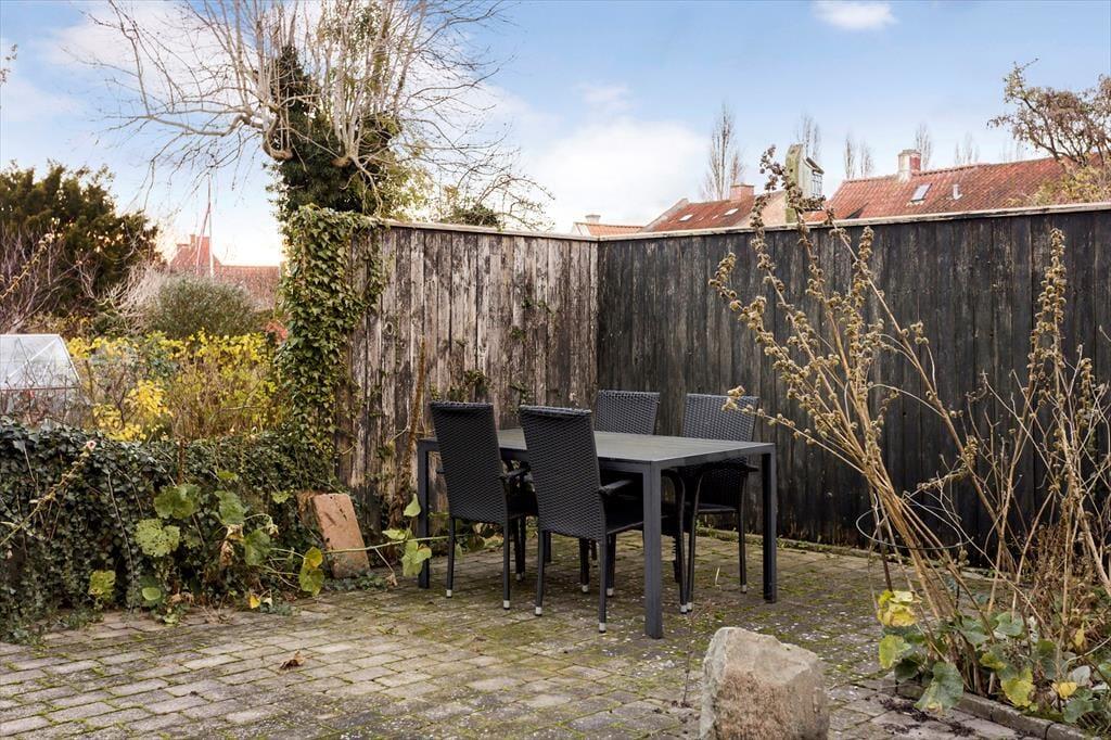 Badeværelse med brusekabine. Lukket gårdhave med terrasse. Havemøbler. Grill.