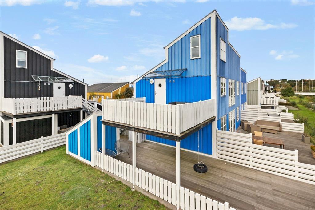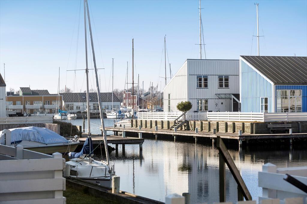 Med to store terrasser er der rig mulighed for at nyde ferien i det fri. Den sydvendte terrasse på 1. sal er indrettet med komfortable møbler og en grill, hvor I kan nyde lange sommeraftener. På terrassen i stueplan kan børnene more sig med gyngen eller slappe af i hængestolene. Ferielejligheden er omgivet af farverige feriehuse og ligger direkte ved kanalen, hvor den hyggelige maritime stemning skaber en helt særlig atmosfære.