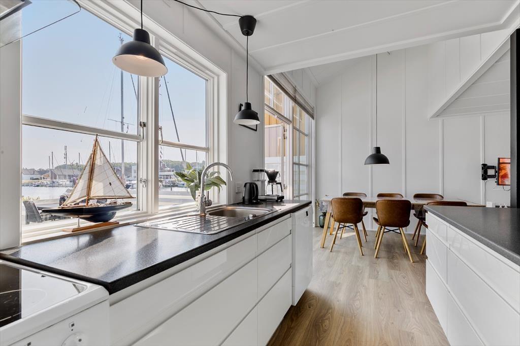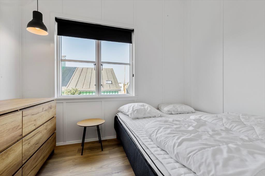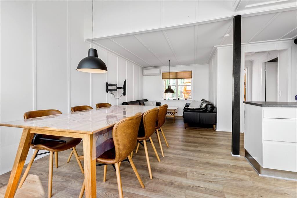 Når du åbner døren til sommerhuset, møder du et lyst og indbydende rum, hvor feriefølelsen straks falder på plads. Stuen er hyggeligt indrettet med komfortable møbler og store vinduer, der lukker masser af dagslys ind og giver dig udsigt til de rolige omgivelser. Køkkenet ligger i åben forbindelse med opholdsrummet, så du kan være en del af fællesskabet, mens du laver mad. Her er alt, hvad du skal bruge til både en hurtig morgenmad og en lækker feriemiddag. De tre soveværelser er velindrettede og giver dig et behageligt sted at trække dig tilbage efter dagens oplevelser. Badeværelset er lyst og funktionelt – præcis som man ønsker sig i et moderne feriehus.