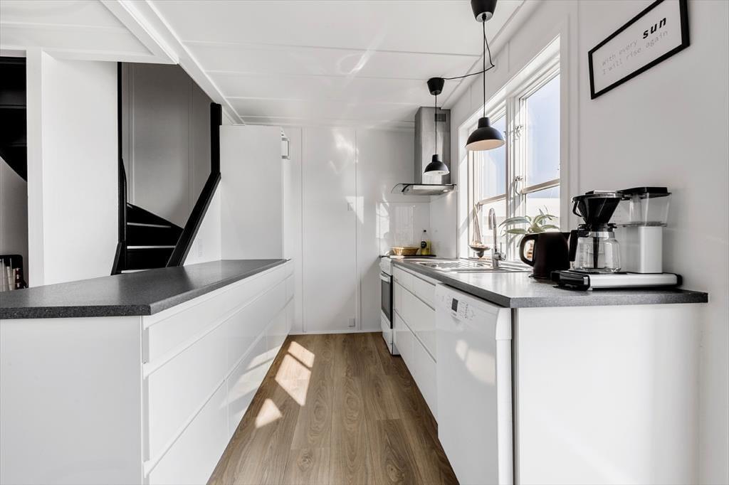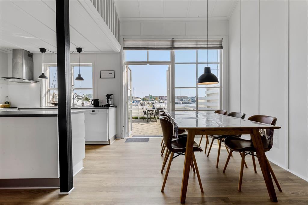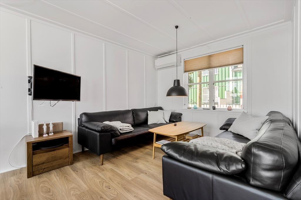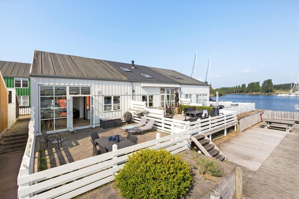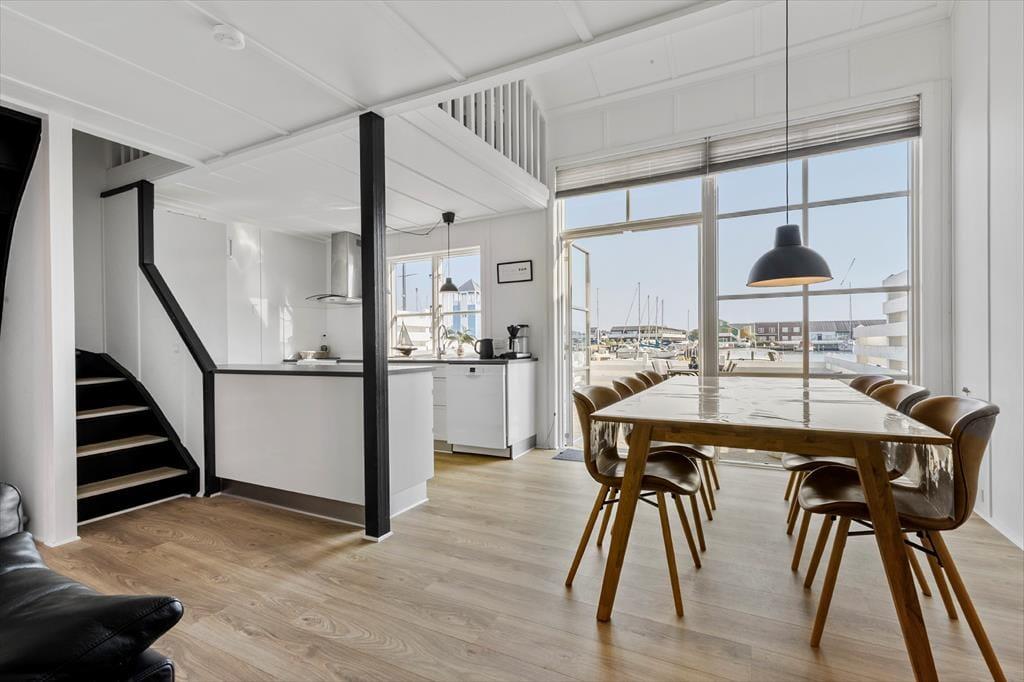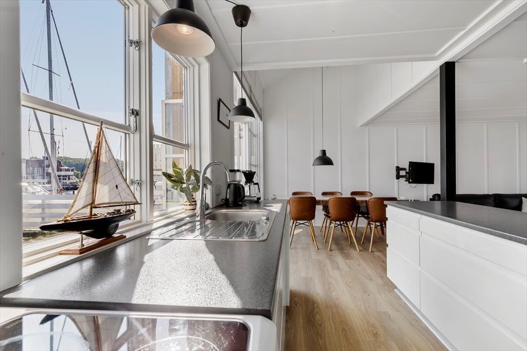 Udenfor venter to solrige terrasser, hvor du kan finde din plads til afslapning – uanset om du foretrækker morgensolen eller aftenens gyldne stråler. Her kan du sidde med en kop kaffe, læse en god bog eller grille, mens du lytter til roen i kanalomgivelserne. Den sydvendte orientering betyder, at du kan nyde solens varme det meste af dagen. Har du lyst til at samle familien til hyggelige stunder, så er loungemøblerne og parasollen klar til netop det.