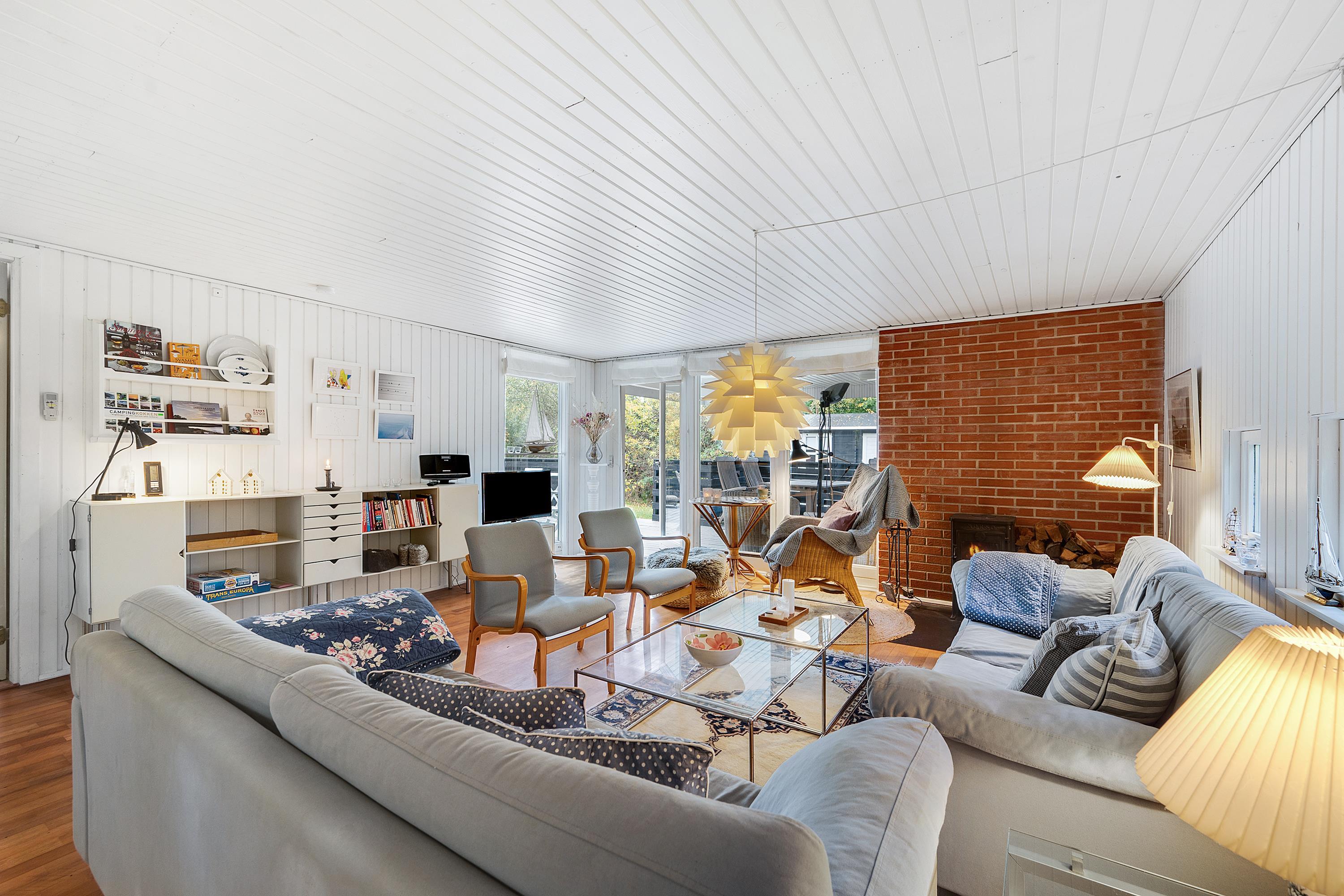 Allerede når man åbner døren og træder ind i entreen, fornemmer man den ægte sommerhusstemning der er i dette hus. Her finder man en velindrettet og rigtig hyggelig stue med gode møbler og b.la varmepumpe og brændeovn. Fra stuen er der udgang til en dejlig overdækket terrasse, hvor man i fred og ro kan sidde og spise og samtidig følge med i det rige dyreliv, der er i området. I forbindelse med spiseafdelingen, finder man det mindre men funktionelle køkken med B.la. opvaskemaskine. Husets sengepladser finder man i tre skønne værelser; heraf et med dobbeltseng, samt to værelser med to enkeltsenge i hvert. Pænt badeværelse med bruseniche og gulvvarme. TV foregår via chromecast. Huset er beliggende på en skøn og ugenert grund med stor græsplæne.