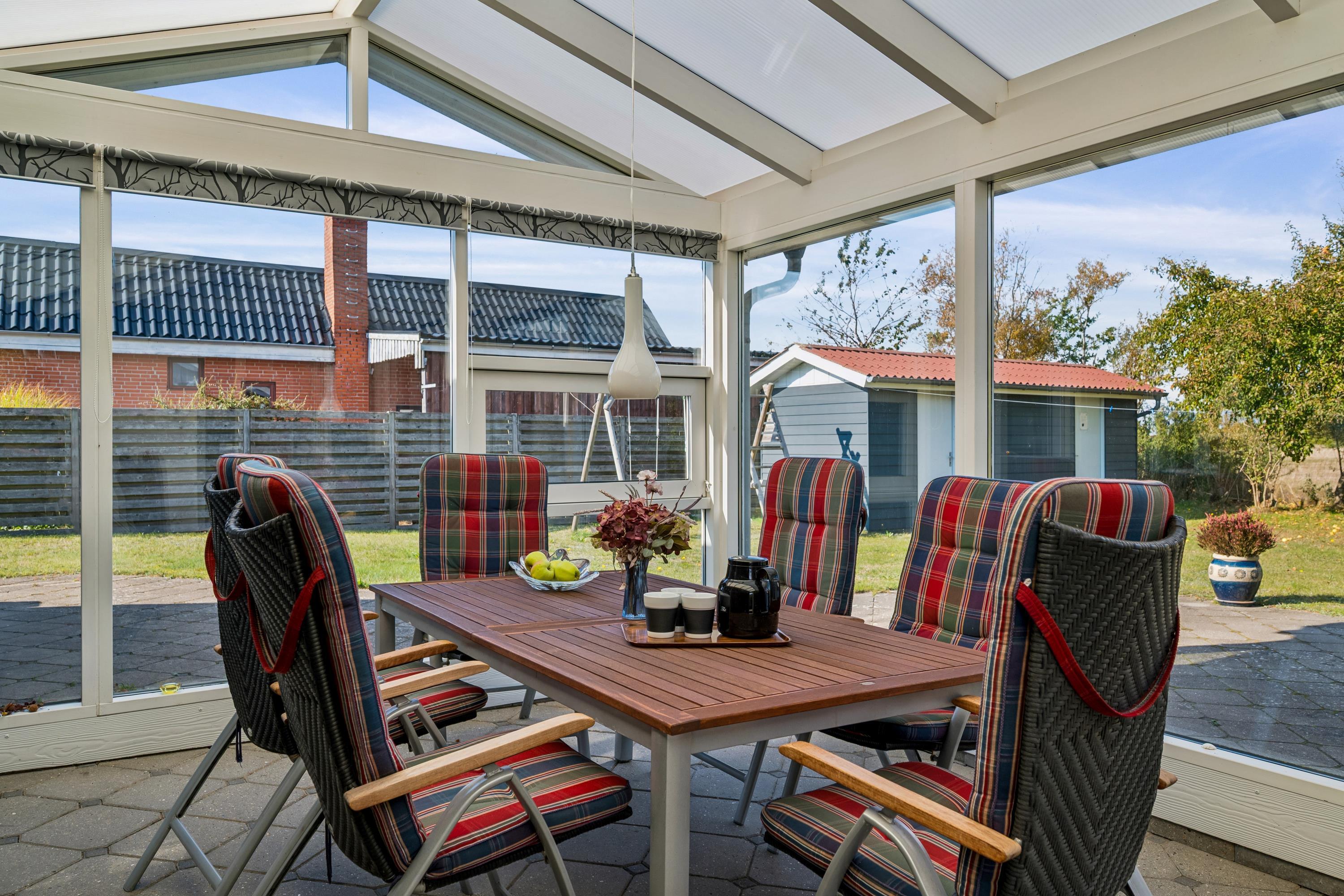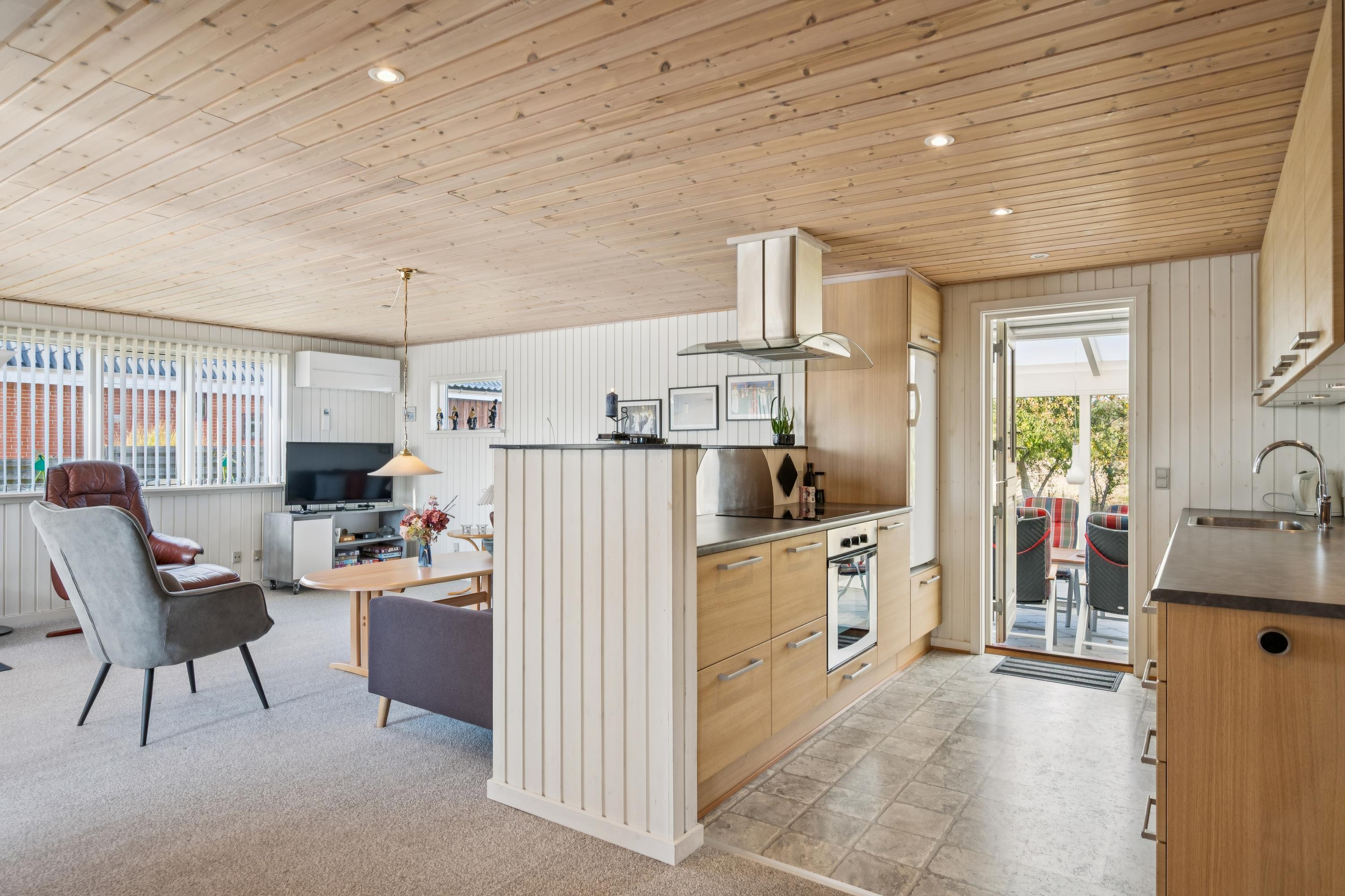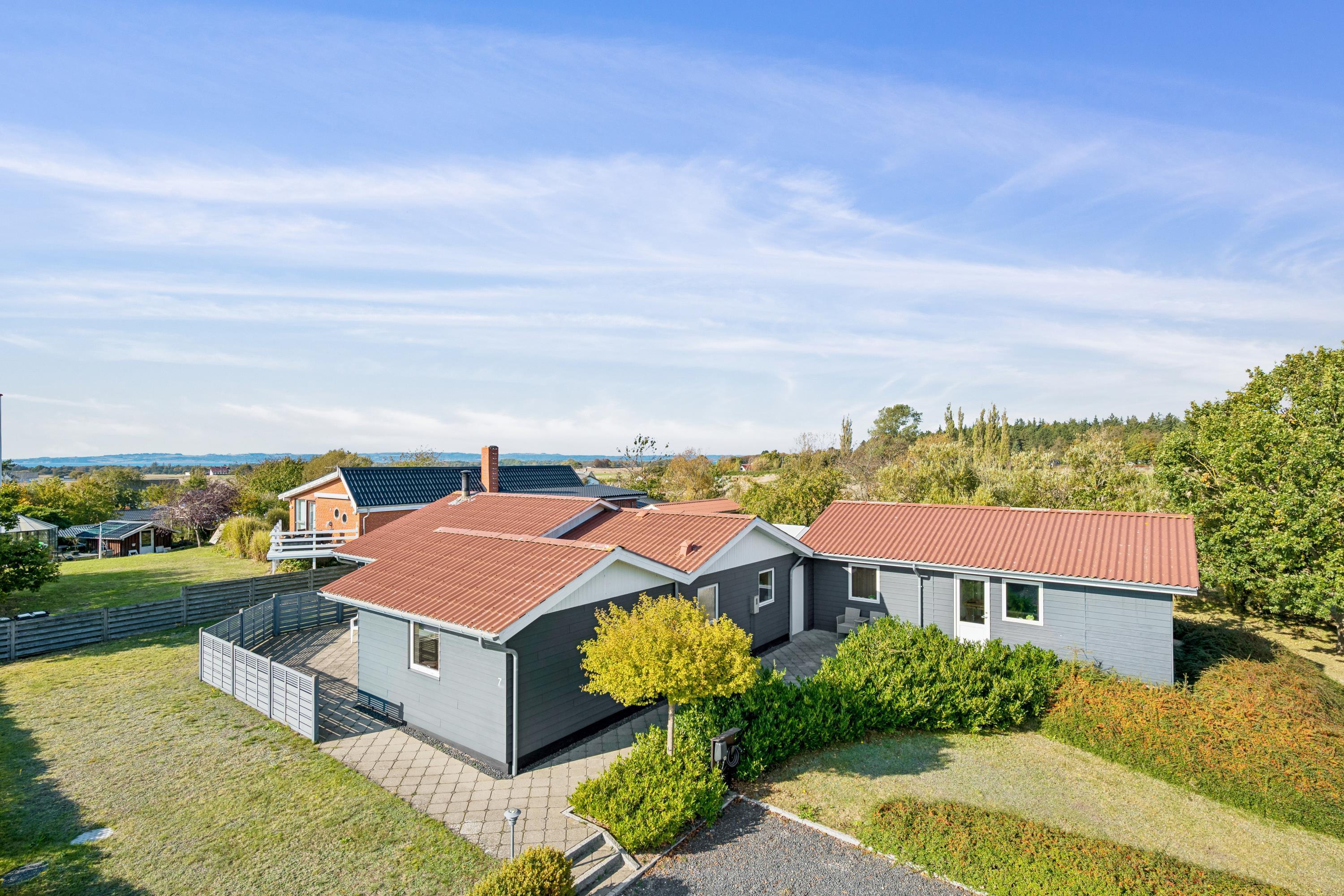 Dette rummelige, velholdte og løbende moderniserede feriehus er højt beliggende i den nordlige del af det store sommerhusområde mellem Ebeltoft og Øer. Stor, nordvestvendt fliseterrasse med skøn udestue, hvor man kan nyde middagsmaden og udsigten uanset vejret, samt dejlig, afskærmet, sydvendt fliseterrasse. Her er havemøbler og grill.