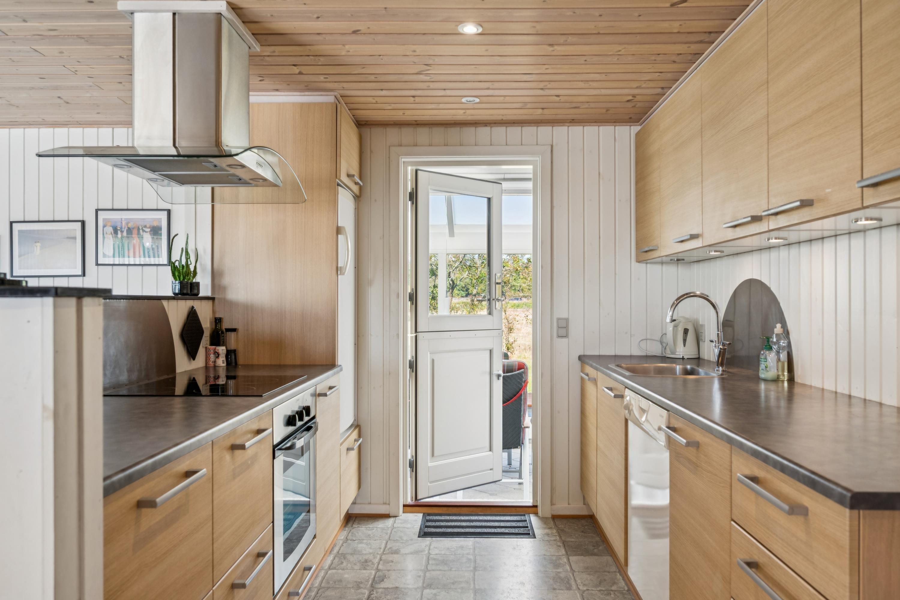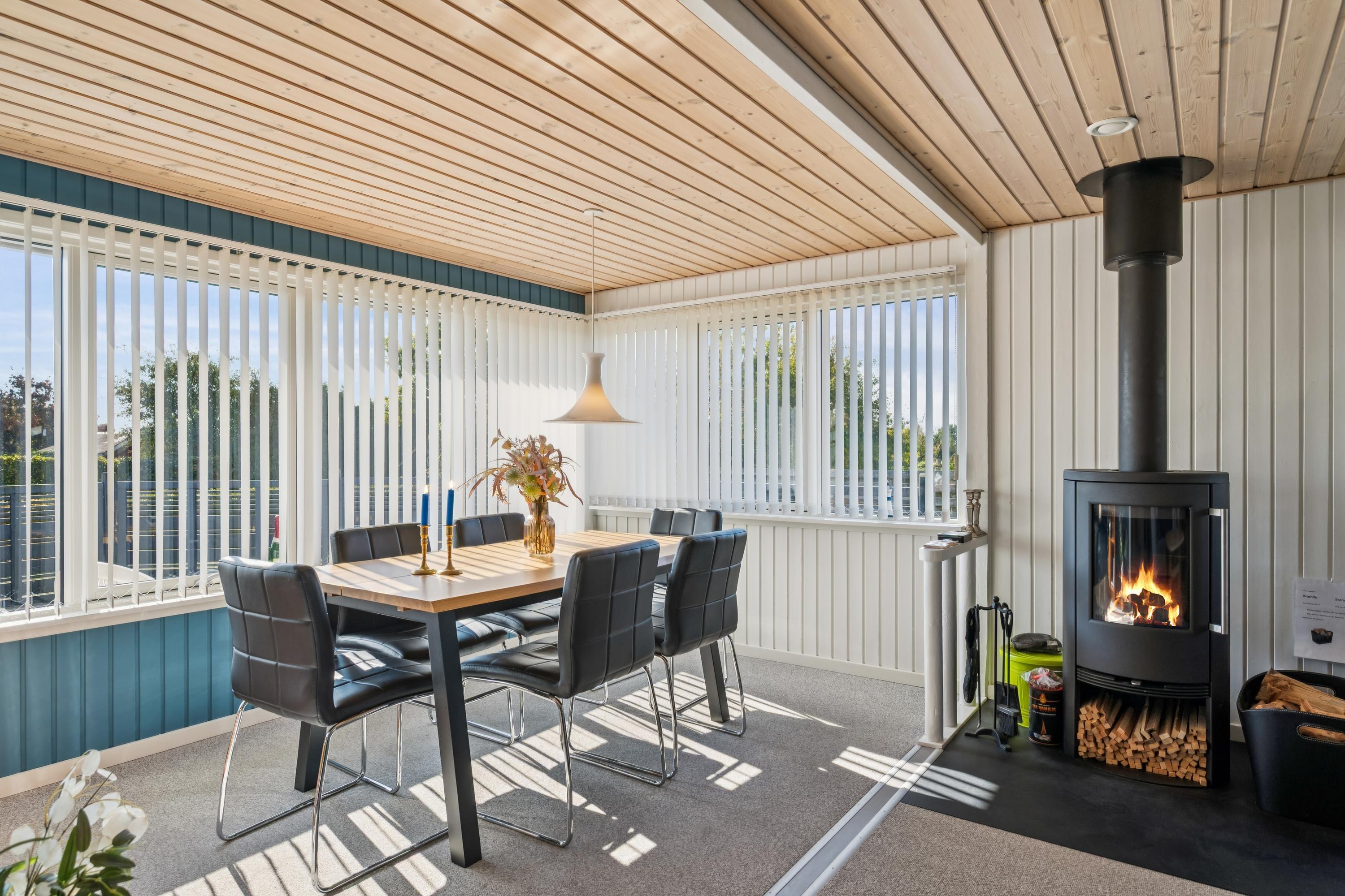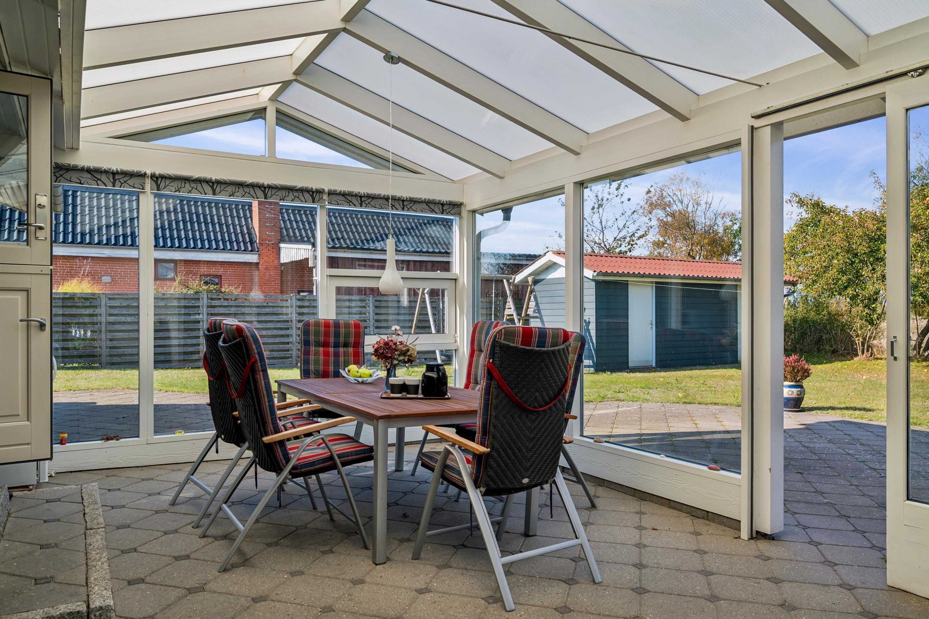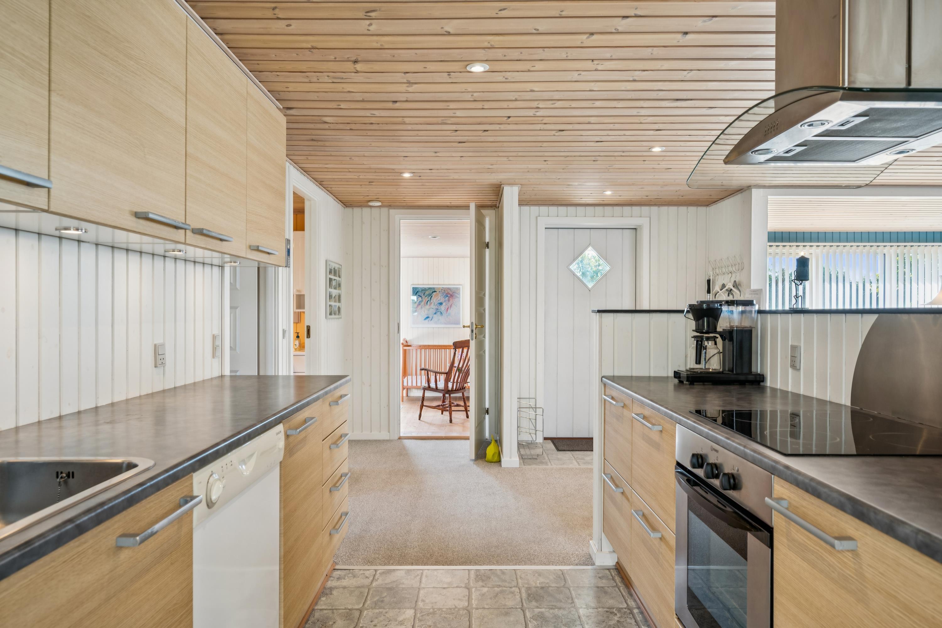 Dette rummelige, velholdte og løbende moderniserede feriehus er højt beliggende i den nordlige del af det store sommerhusområde mellem Ebeltoft og Øer. Stor, nordvestvendt fliseterrasse med skøn udestue, hvor man kan nyde middagsmaden og udsigten uanset vejret, samt dejlig, afskærmet, sydvendt fliseterrasse. Her er havemøbler og grill.
