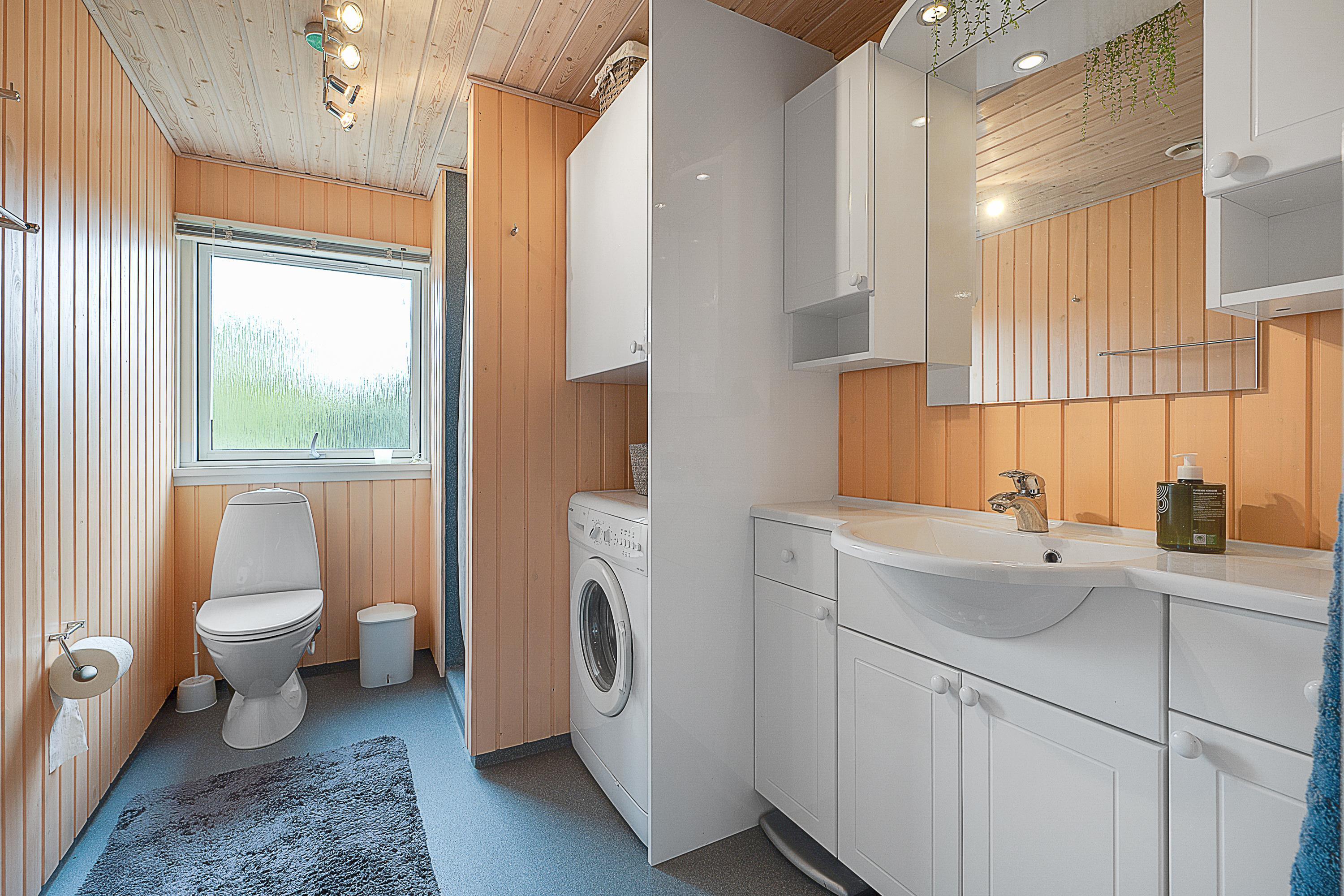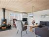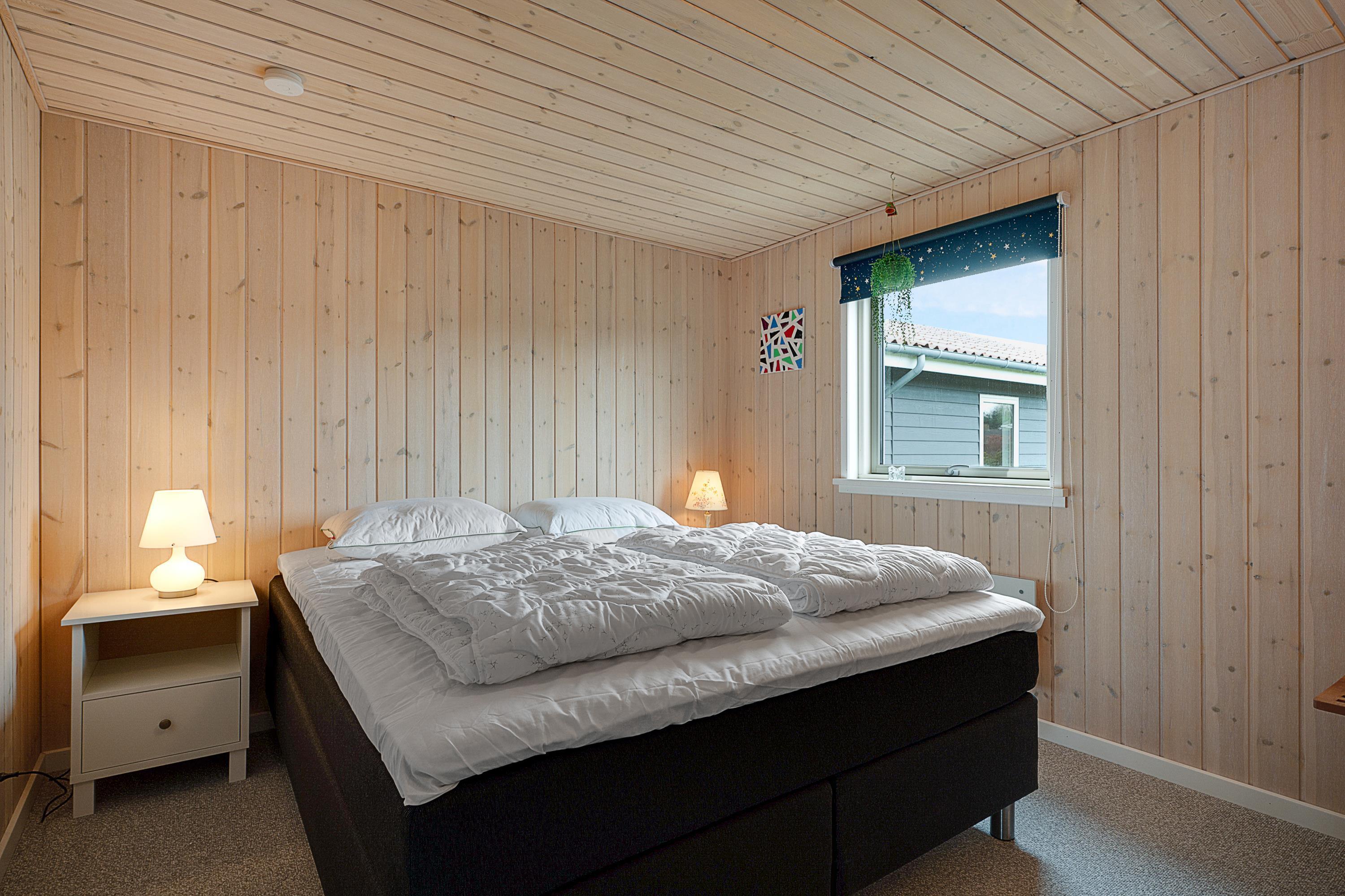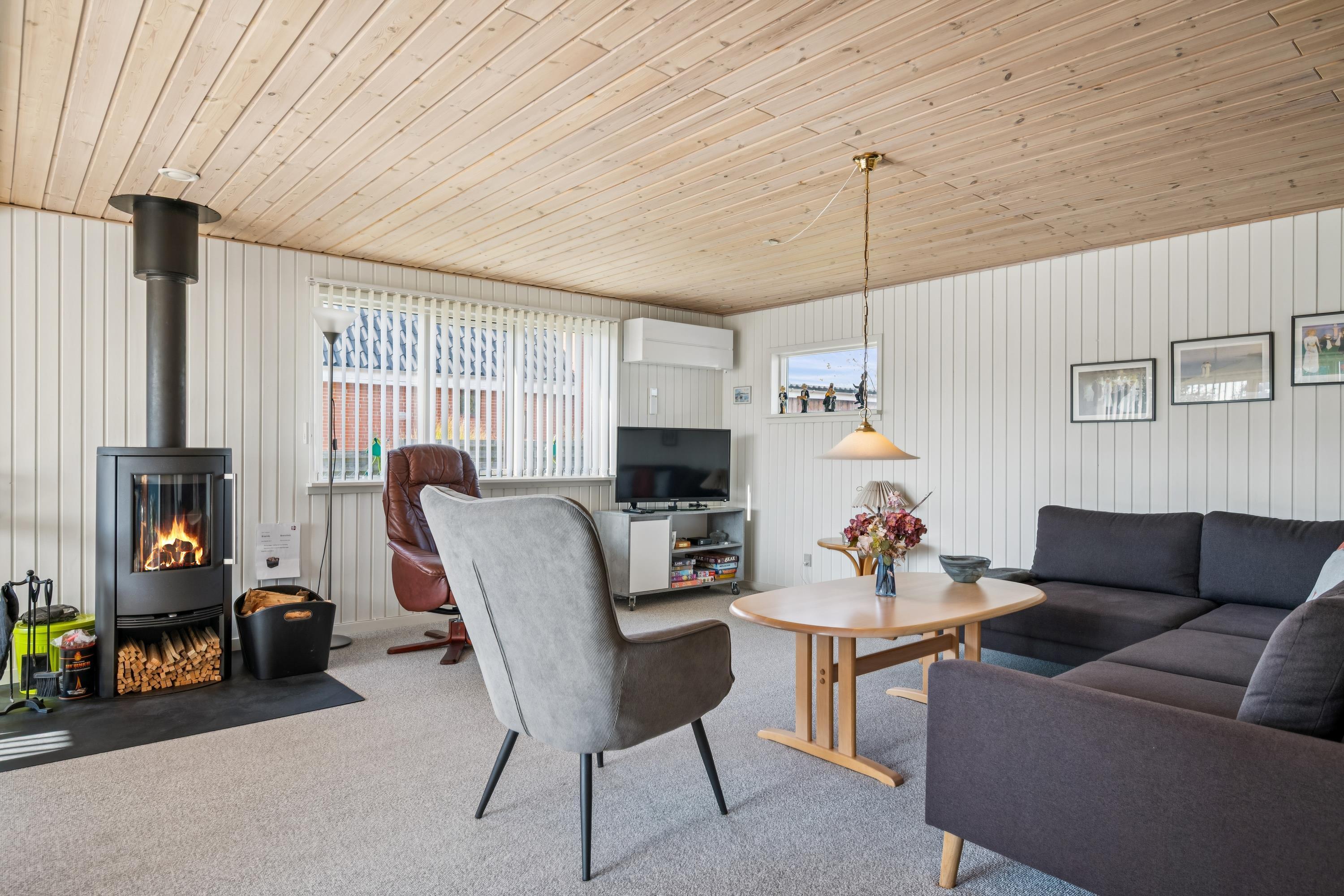 Man kommer direkte ind i den store stue/alrum med brændeovn, mageligt sofahjørne, TV med danske (inkl. TV2) og tyske kanaler samt særskilt spiseafdeling til 6 personer med udsigt til haven. I åben forbindelse med stuen er der virkelig pænt, veludstyret køkken med god arbejdsplads og komfur med keramiske kogeplader og ovn, køle-/fryseskab, opvaskemaskine og mikrobølgeovn. Fra køkkenet er der desuden udgang til havestuen. Huset rummer 6 sovepladser fordelt på 2 gode soveværelser med dobbeltseng og 1 lidt mindre værelse/anneks med indgang fra havestuen. Nyere, regulært badeværelse med bruseniche, skabsarrangement og vaskemaskine. Der er internetadgang.