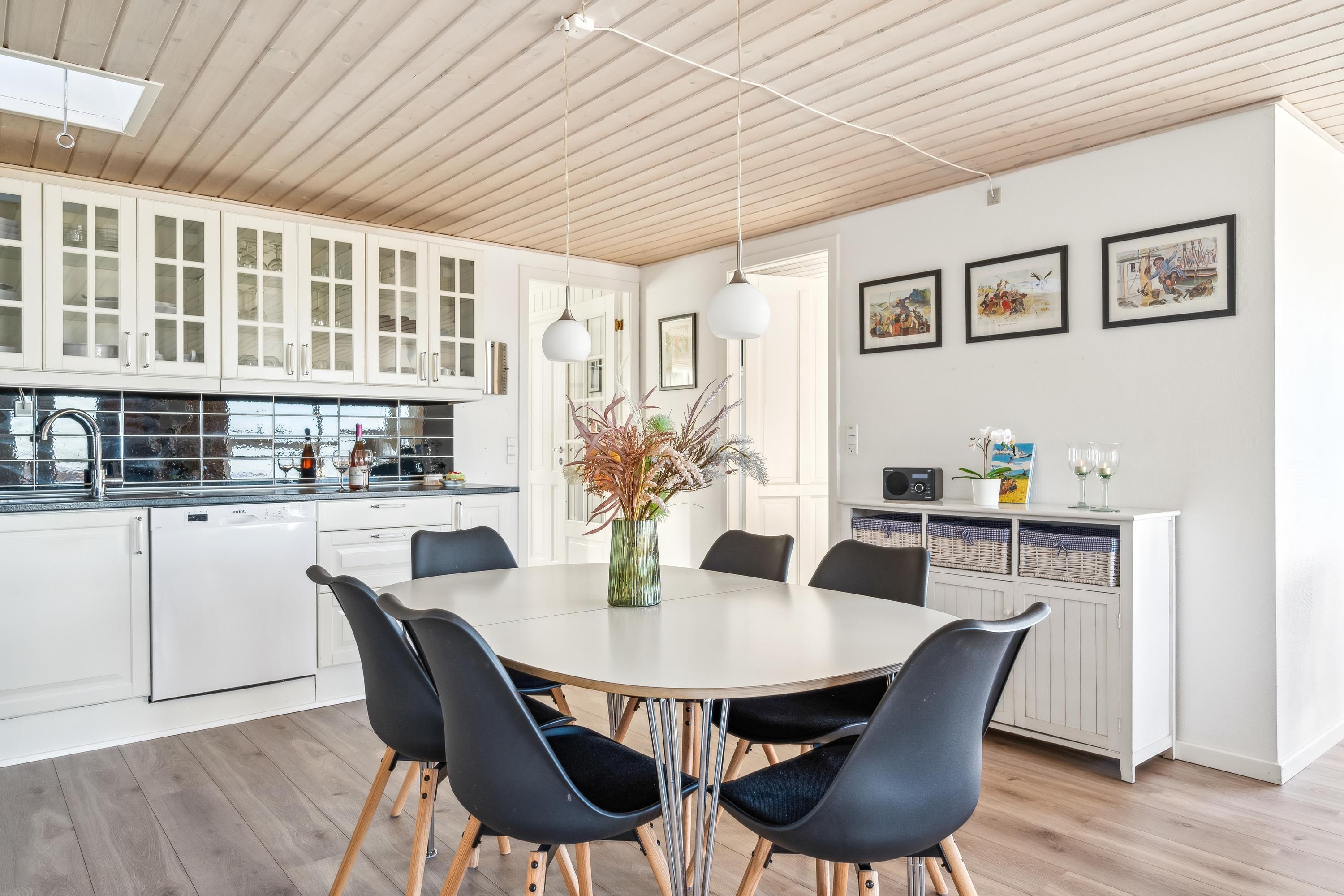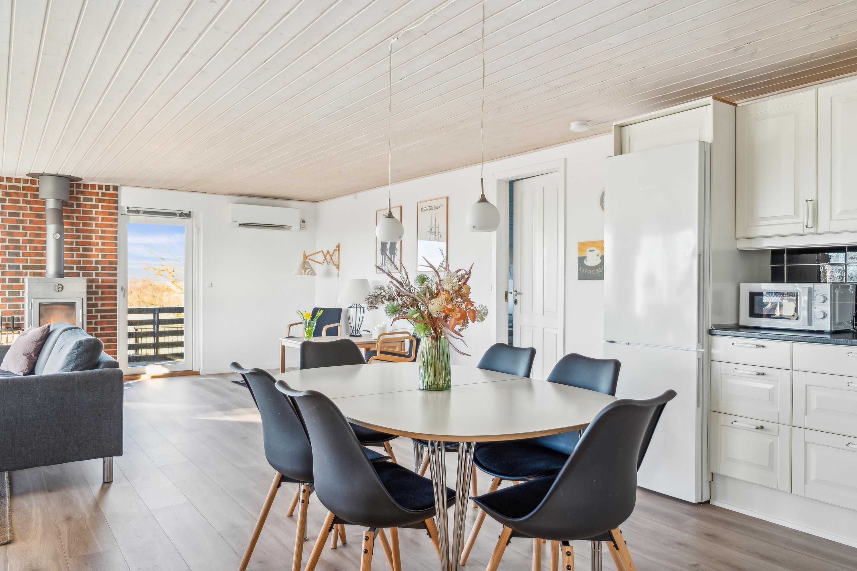 Fra entréen kommer man ind i den store, lyse stue med panoramavinduer og i åben forbindelse med køkken. Her er god spiseplads til 6 personer, brændeovn, komfortabel sofaafdeling, TV med danske (inkl. TV2) og én tysk kanal (ZDF), CD-afspiller og radio. Nyt, dejligt køkken med komfur med keramiske kogeplader og ovn, køle-/fryseskab, opvaskemaskine og mikrobølgeovn. Huset råder over 3 soveværelser, de 2 med indgang fra stuen og 2 med dobbeltseng og 1 værelse med sovesofa , i alt 6 sovepladser. Stort, nyt badeværelse med bruseniche, vaskemaskine og tørretumbler. Der er internetadgang.