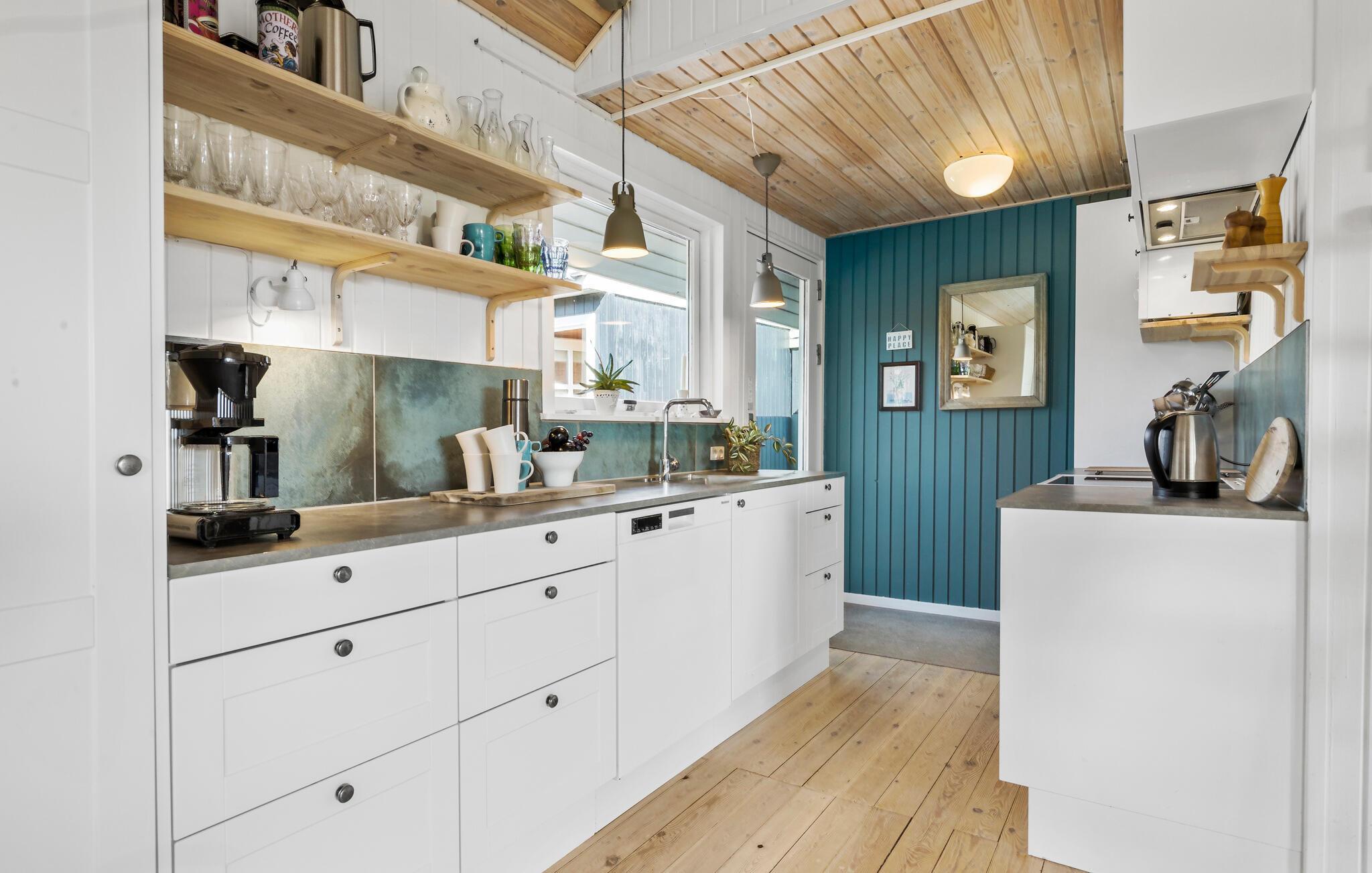 Der er lagt op til nogle herlige feriedage i dette sommerhus, som er noget særligt med sin hyggelige atmosfære og naturskønne beliggenhed. Begynd dagene med en solid morgenmad ved spisebordet, mens I nyder udsigten over den velholdte have. Bagefter kan I finde jer til rette i den behagelige sofa eller lave maden sammen i det åbne køkken, der glider harmonisk over i opholdsstuen. Der er lys, luft og flotte indretningsdetaljer i boligen, så her er der gode rammer til slappe af.