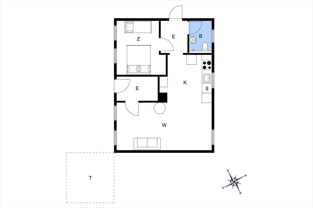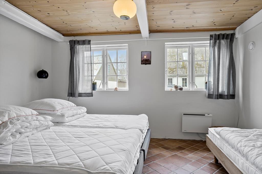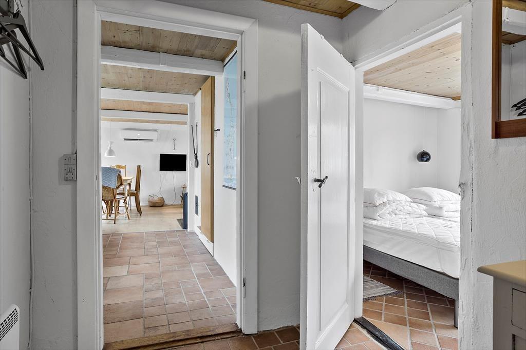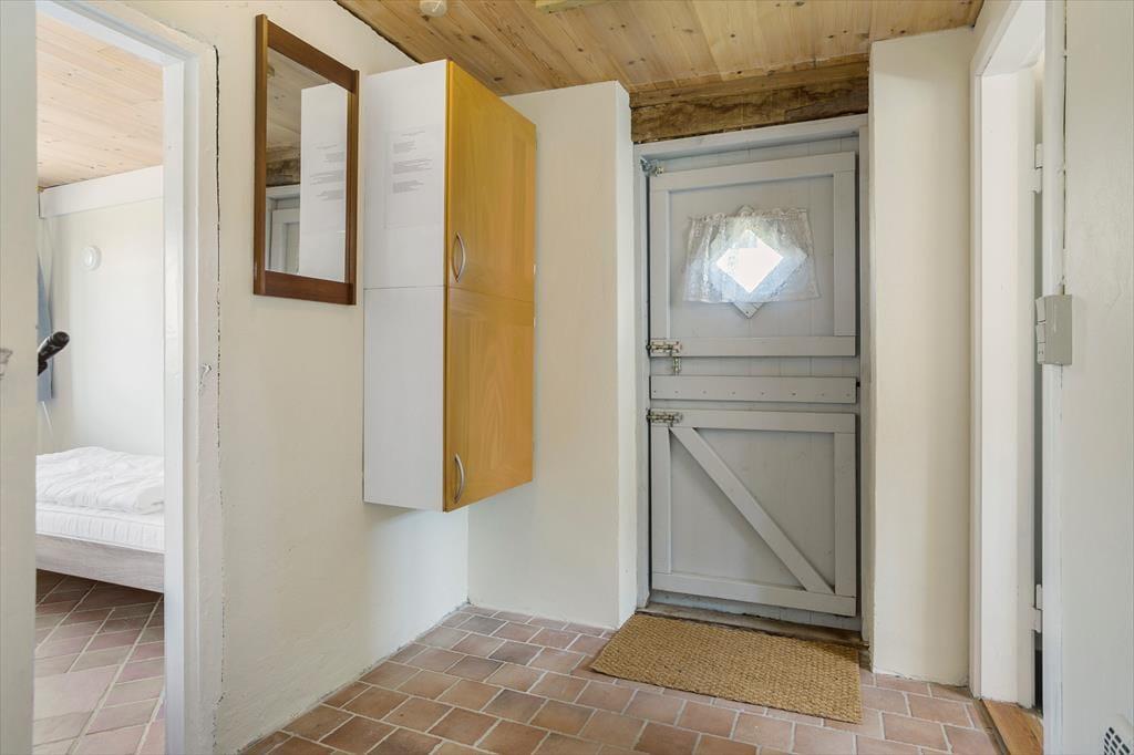 Fra parkeringspladsen er der via den gamle stalddør indgang til stor baggang med adgang til nyt badeværelse, samt lyst vestvendt soveværelse med el radiator, dobbeltseng og enkelt seng med mål 70 x 180.